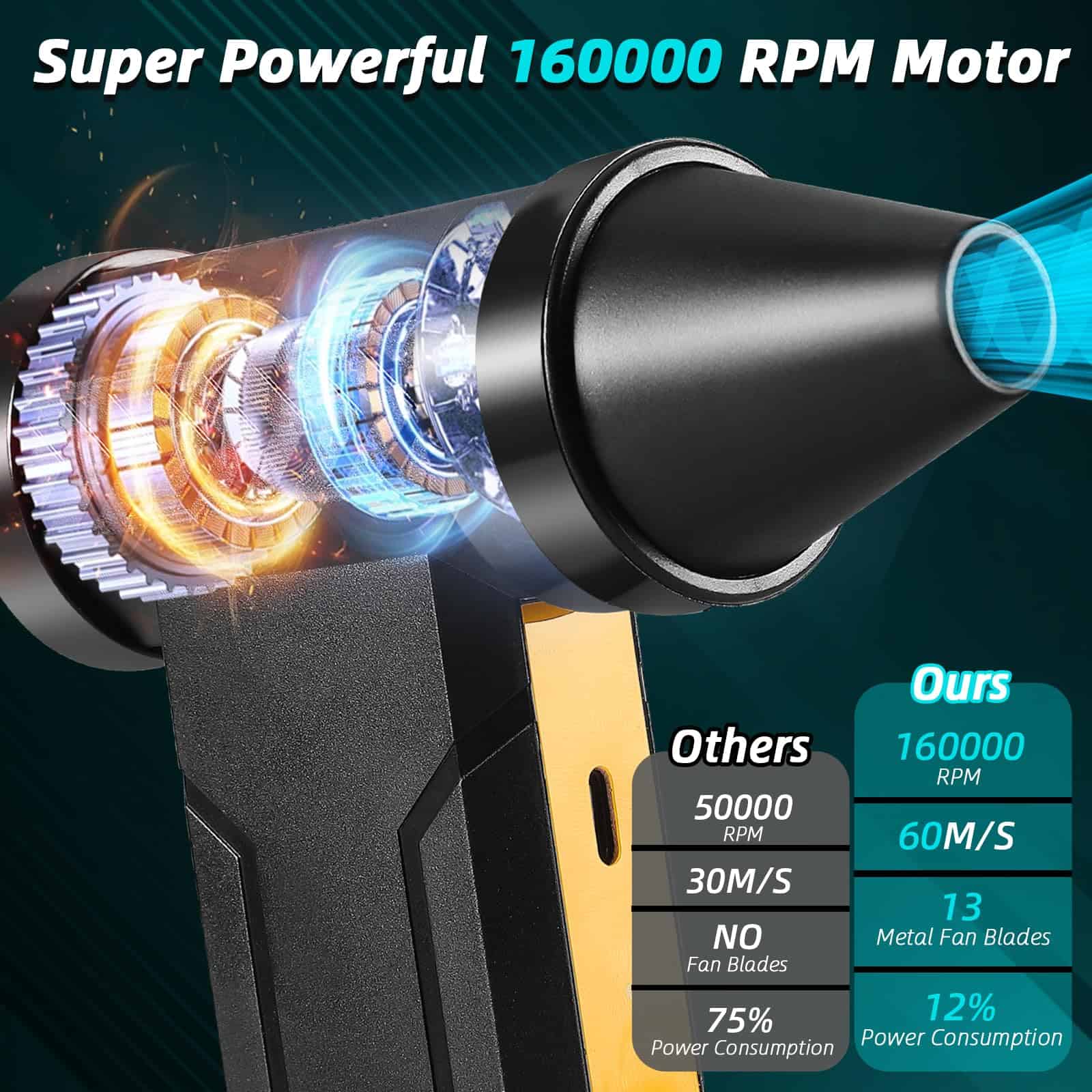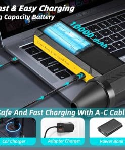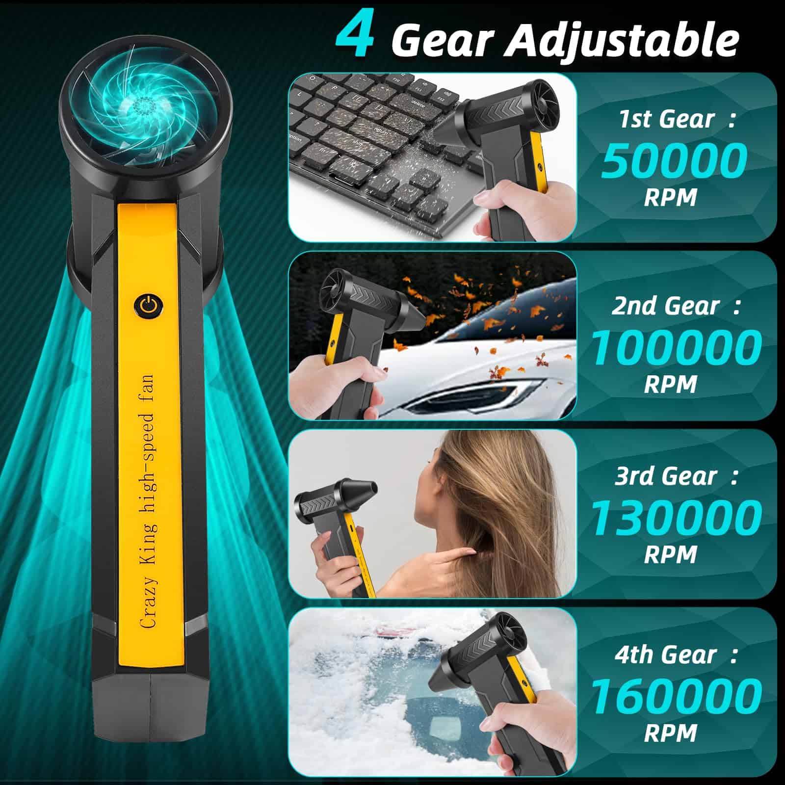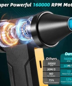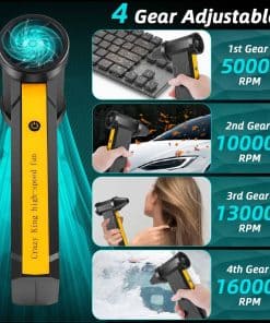 Soplador de aire comprimido súper potente de Stron-Dura: Utilizando la última tecnología de motor súper potente que genera una velocidad máxima de 160,000 RPM y una fuerte fuerza de soplado, este soplador de aire comprimido elimina eficazmente el polvo, los residuos y la pelusa de áreas de difícil acceso. Carga rápida y batería de larga duración: Viene con un cable de carga USB tipo C que admite carga rápida de hasta 10W. La batería de alta calidad de 10000 mAh ofrece un uso de hasta 15-75 minutos, con protección contra temperatura excesiva, corriente y cortocircuitos. Material de grado superior: La carcasa de ABS de grado superior disipa rápidamente el calor, el motor importado sin escobillas genera más fuerza, y la estructura inferior del ventilador facilita la disipación de calor. Reemplazo de latas de aire comprimido: Más eficiente energéticamente que los tanques de aire comprimido, este soplador de aire recargable se puede reutilizar sin riesgo de formación de líquidos o hielo, protegiendo sus equipos electrónicos y siendo respetuoso con el medio ambiente. Ampliamente utilizado: Con 4 engranajes de velocidad de aire, es perfecto para limpiar teclados, soplar nieve del automóvil y polvo, siendo una excelente opción de regalo para cumpleaños y Navidad.