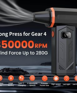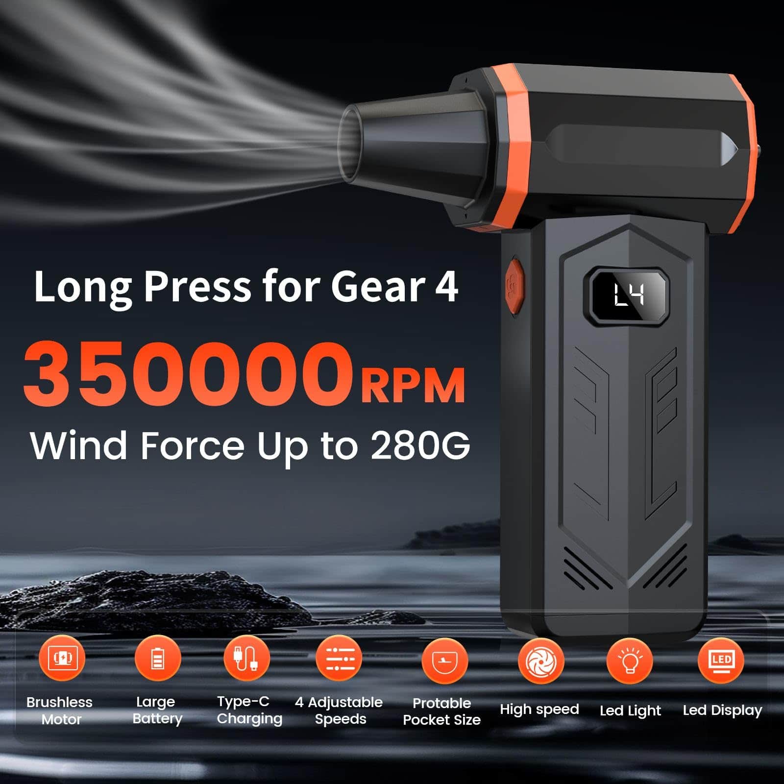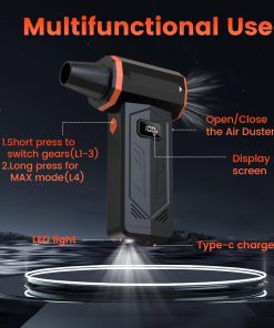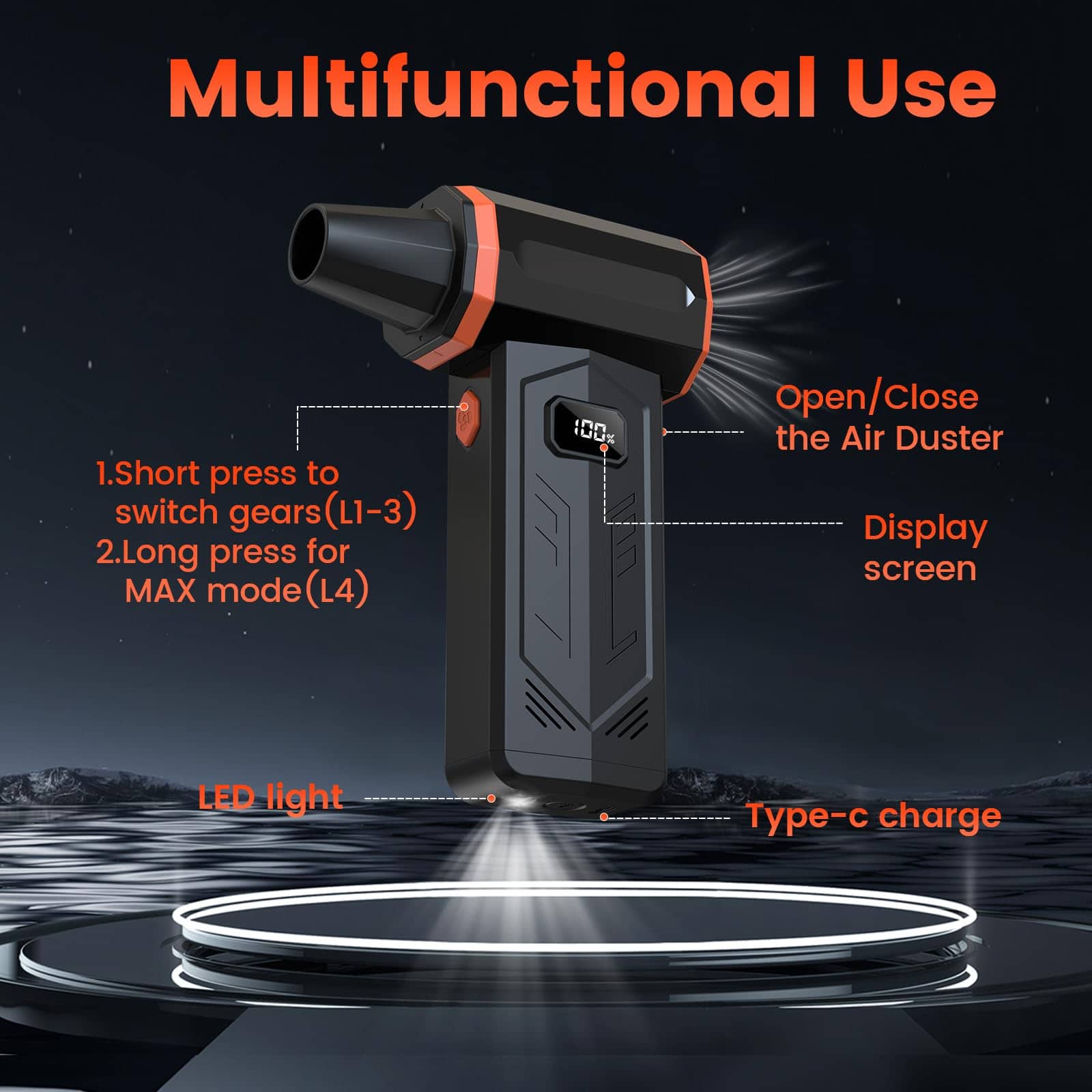El soplador de aire alcanza una velocidad de hasta 350,000 RPM, entregando una presión de viento de 280G. Este soplador de aire eléctrico viene con cuatro ajustes de velocidad ajustables para cubrir diferentes necesidades de limpieza. El modo MAX (L4) se activa al mantener pulsado. El soplador de aire seco jet elimina eficazmente el polvo y los residuos de teclados, computadoras, autos, secando las superficies rápidamente. Este soplador de aire eléctrico cuenta con pantalla LED que muestra el nivel de potencia y la velocidad. La luz se puede cambiar a modo alto / SOS en un solo clic, lo que le permite usarla según sus necesidades. Recargable con puerto de carga tipo C, carga completa en solo 2 horas y tiempo de uso de 180 minutos en 1 marcha. Se recomienda esperar a que la temperatura del ventilador turbo baje antes de cargar después de su uso, lo que es conveniente para el próximo uso. Este soplador de aire proporciona protección contra sobrecalentamiento, protección contra corriente y cortocircuito para un rendimiento constante y un uso más seguro. El soplador de aire es un excelente limpiador de teclados como alternativa al aire enlatado. El mini soplador de aire pesa 240g y es ligero y fácil de transportar. Ideal para limpiar escritorios y teclados, secar pelo de mascotas, limpieza del hogar, limpieza de autos, quitar nieve, etc. Los ventiladores turbo también son útiles para actividades al aire libre, como picnic y encendido de fuego. Si tienes algún problema al recibir o usar el soplador de aire eléctrico, no dudes en contactarnos. Responderemos en un plazo de 12 horas. Ofrecemos un mes de devolución gratuita e intercambio y garantía de un año para esta escoba de aire. ¡Gracias por elegir nuestros sopladores de aire!