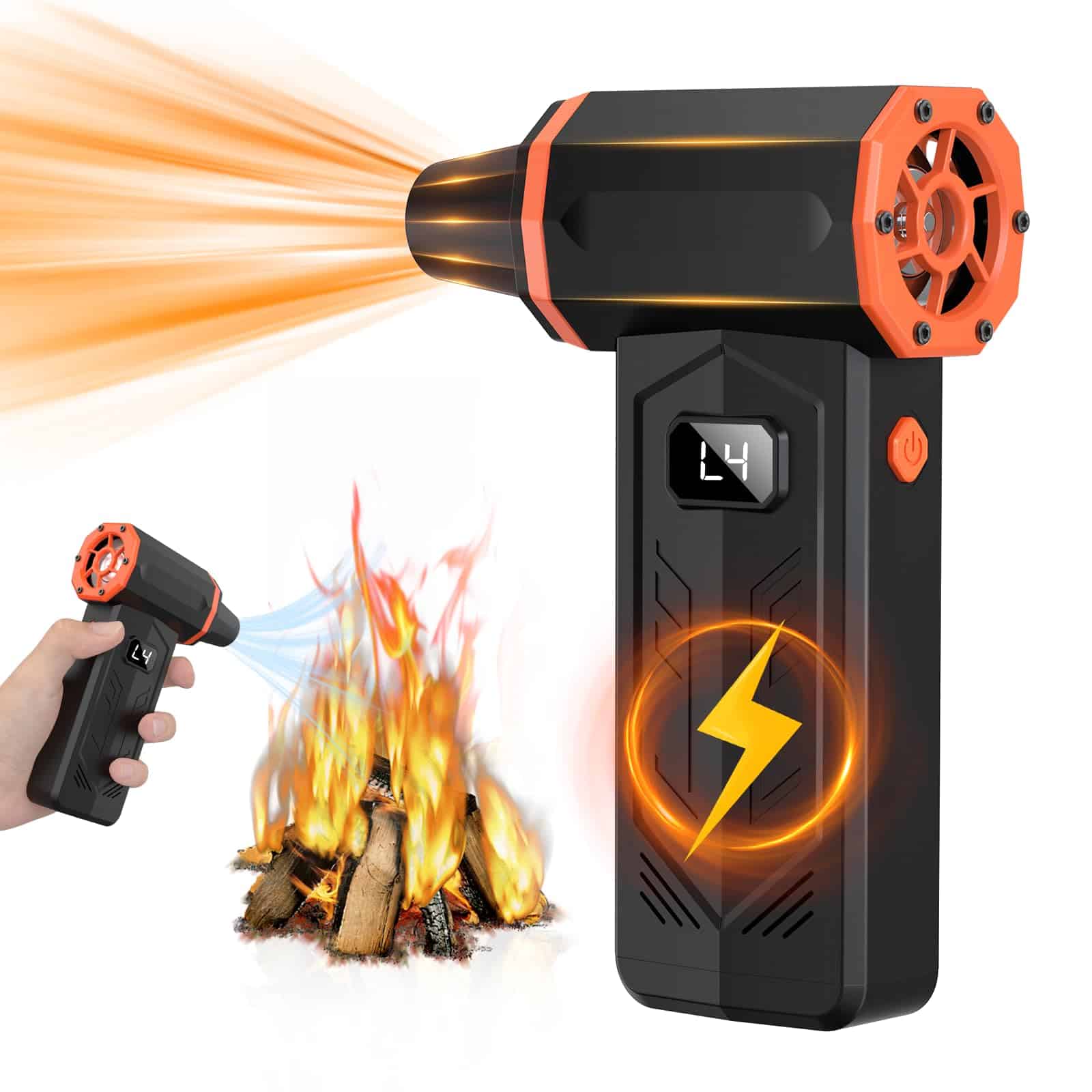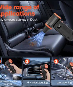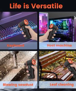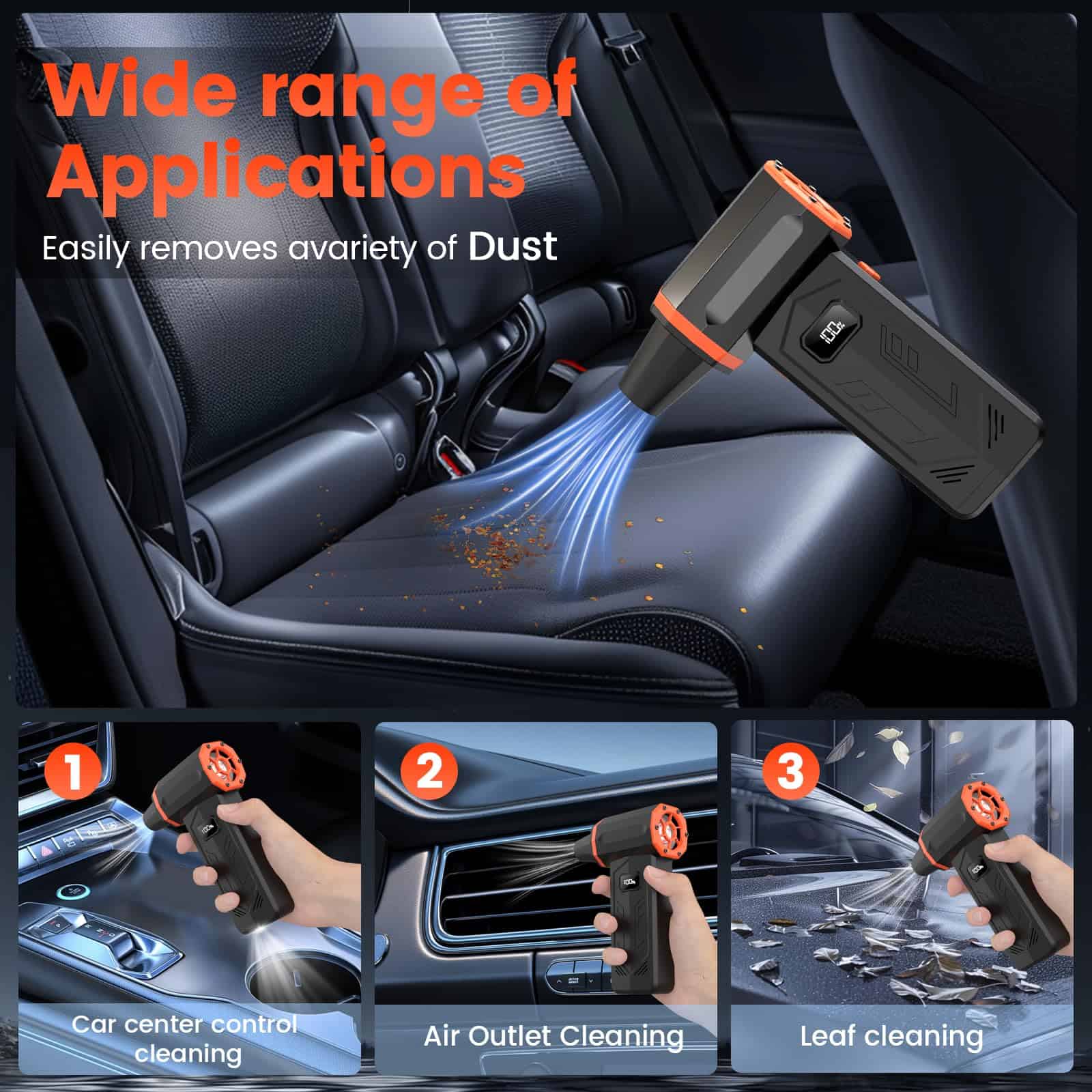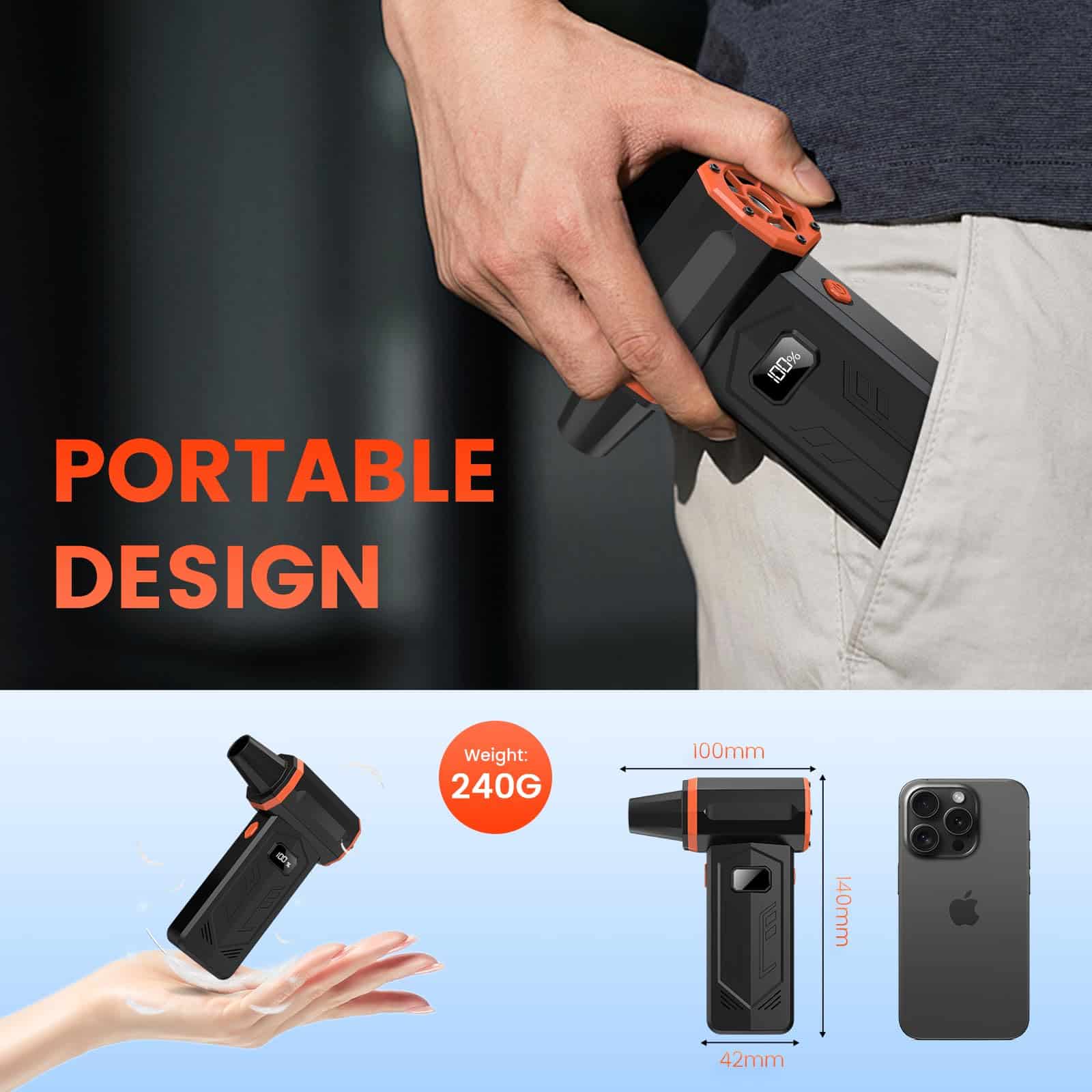 El soplador de aire alcanza una velocidad de hasta 350,000 RPM, entregando una presión de viento de 280G. Este soplador de aire eléctrico viene con cuatro ajustes de velocidad ajustables para cubrir diferentes necesidades de limpieza. El modo MAX (L4) se activa al mantener pulsado. El soplador de aire seco jet elimina eficazmente el polvo y los residuos de teclados, computadoras, autos, secando las superficies rápidamente. Este soplador de aire eléctrico cuenta con pantalla LED que muestra el nivel de potencia y la velocidad. La luz se puede cambiar a modo alto / SOS en un solo clic, lo que le permite usarla según sus necesidades. Recargable con puerto de carga tipo C, carga completa en solo 2 horas y tiempo de uso de 180 minutos en 1 marcha. Se recomienda esperar a que la temperatura del ventilador turbo baje antes de cargar después de su uso, lo que es conveniente para el próximo uso. Este soplador de aire proporciona protección contra sobrecalentamiento, protección contra corriente y cortocircuito para un rendimiento constante y un uso más seguro. El soplador de aire es un excelente limpiador de teclados como alternativa al aire enlatado. El mini soplador de aire pesa 240g y es ligero y fácil de transportar. Ideal para limpiar escritorios y teclados, secar pelo de mascotas, limpieza del hogar, limpieza de autos, quitar nieve, etc. Los ventiladores turbo también son útiles para actividades al aire libre, como picnic y encendido de fuego. Si tienes algún problema al recibir o usar el soplador de aire eléctrico, no dudes en contactarnos. Responderemos en un plazo de 12 horas. Ofrecemos un mes de devolución gratuita e intercambio y garantía de un año para esta escoba de aire. ¡Gracias por elegir nuestros sopladores de aire!