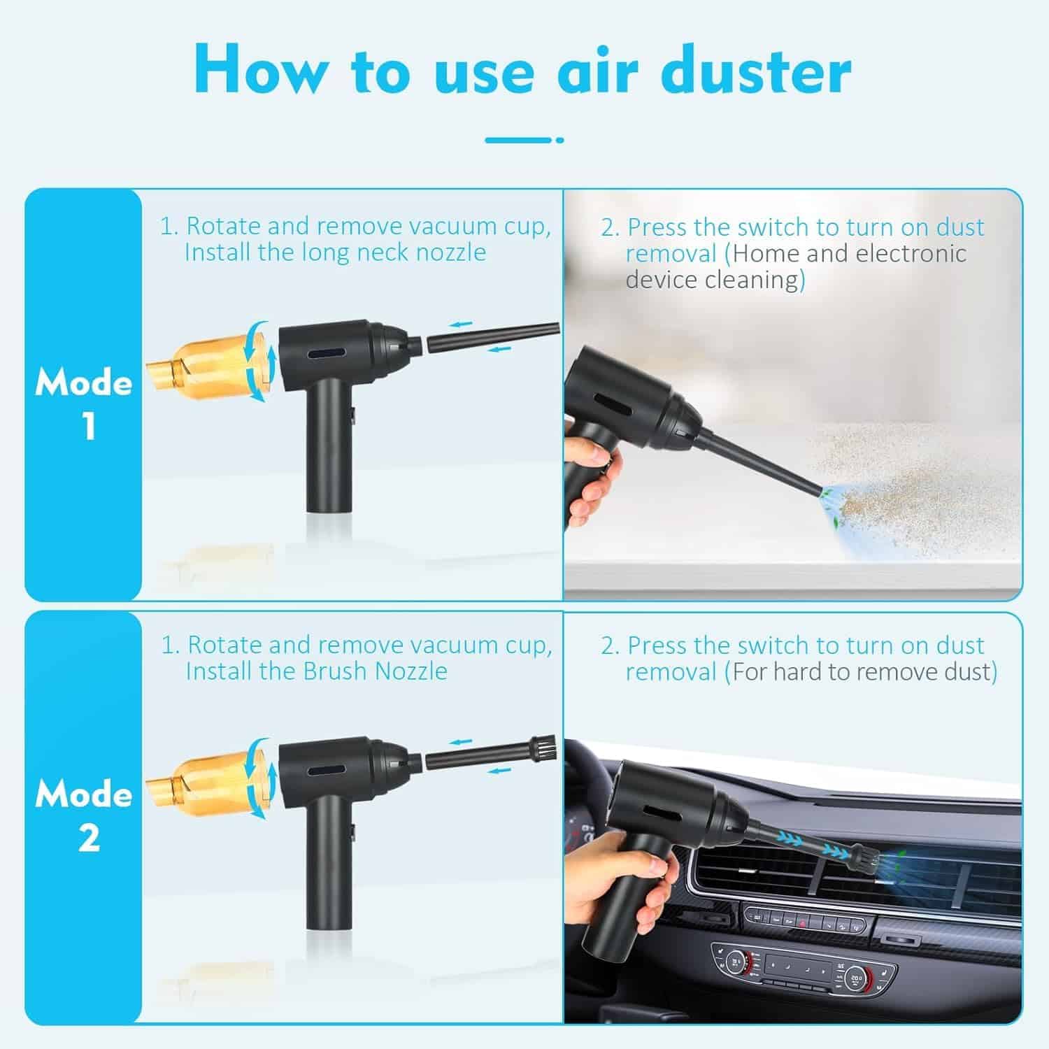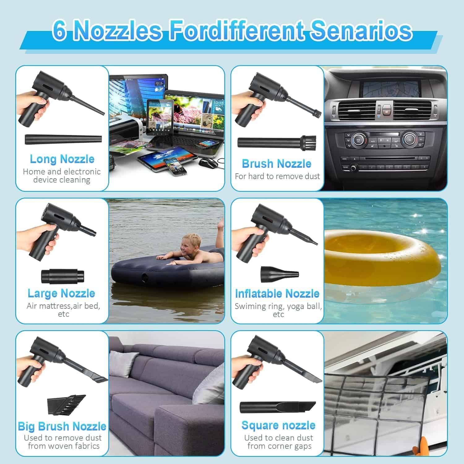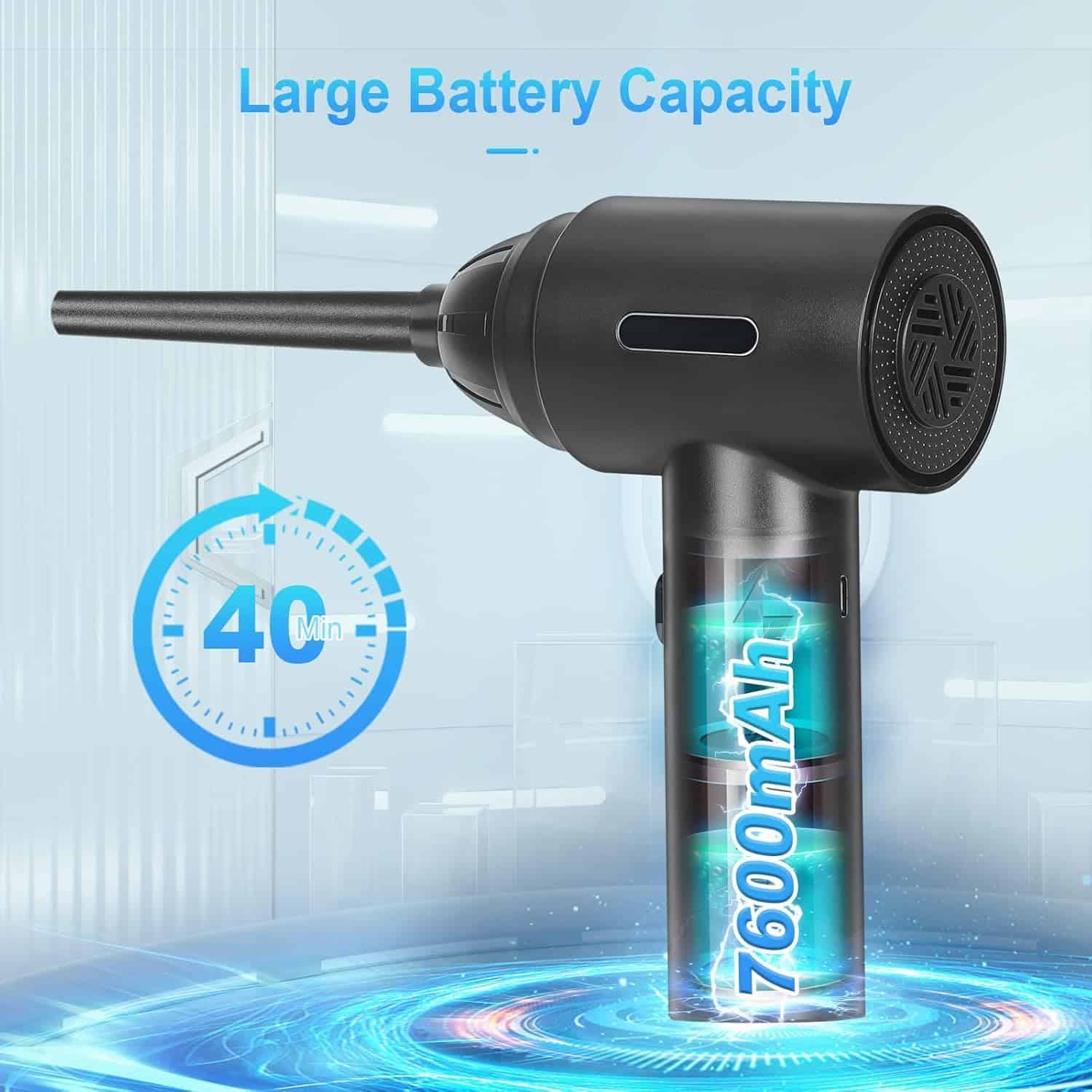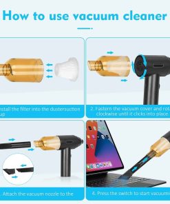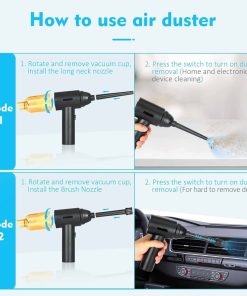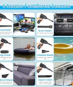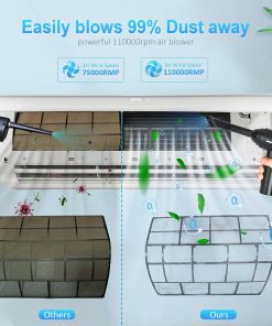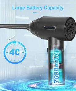 1. Motores de Alta Potencia: El soplador de aire comprimido tiene una velocidad máxima de 110000RPM, que puede producir un flujo de aire súper fuerte y una gran velocidad del viento, siendo un buen reemplazo de la lata de aire comprimido. Puede ser utilizado varias veces y no produce químicos, protegerá sus dispositivos electrónicos de líquidos de manera segura. Es más eficiente energéticamente, respetuoso con el medio ambiente y ahorra dinero en comparación con comprar constantemente aire comprimido en lata. 2. Diseño 2 en 1: Nueva actualización del 2023, combinando el soplador de aire comprimido y la aspiradora. Permite que una sola máquina pueda satisfacer múltiples necesidades de limpieza. En comparación con la necesidad de múltiples dispositivos para completar tareas de limpieza en el pasado, nuestro soplador de aire eléctrico le permite manejar fácilmente diferentes escenarios con una sola compra. 3. Batería de Gran Capacidad y Tipo-C: Nuestro soplador de aire cuenta con tecnología de batería de litio confiable con una batería integrada de 7600mAh que ofrece hasta 50 minutos de uso continuo con una sola carga. Puede cargarse por completo en solo 2 horas utilizando el cable de carga Type-C incluido. No cargue inmediatamente después de usar; cuando la temperatura de la batería es demasiado alta, espere diez minutos para que se enfríe antes de cargar. No se puede usar durante la carga. 4. Multiusos: El soplador de aire comprimido puede limpiar teclados, computadoras, PC, máquinas de fax, impresoras, aires acondicionados, sofás, etc., en cualquier lugar con espacios. Usando la boquilla larga y delgada, puede limpiar fácilmente donde su mano no puede llegar, como computadoras, ventiladores, ventanas dobles, teclados, desechos de autos, cabello, sofás, lentes de cámara. Estos sopladores de aire incluso pueden inflar anillos de natación, cojines de aire, kayaks, pelotas de yoga, etc. 5. 2 Cepillos y 5 Boquillas: Según las diferentes necesidades de limpieza, hemos equipado el soplador con 4 boquillas y 2 cepillos y 1 taza de aspiradora: los cepillos mini y las boquillas largas para áreas difíciles de alcanzar, y una boquilla plana y ancha expande las áreas de succión.