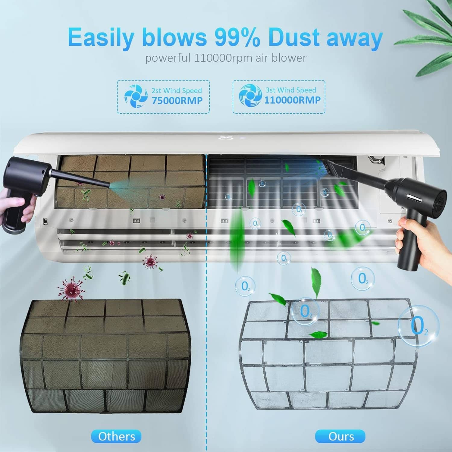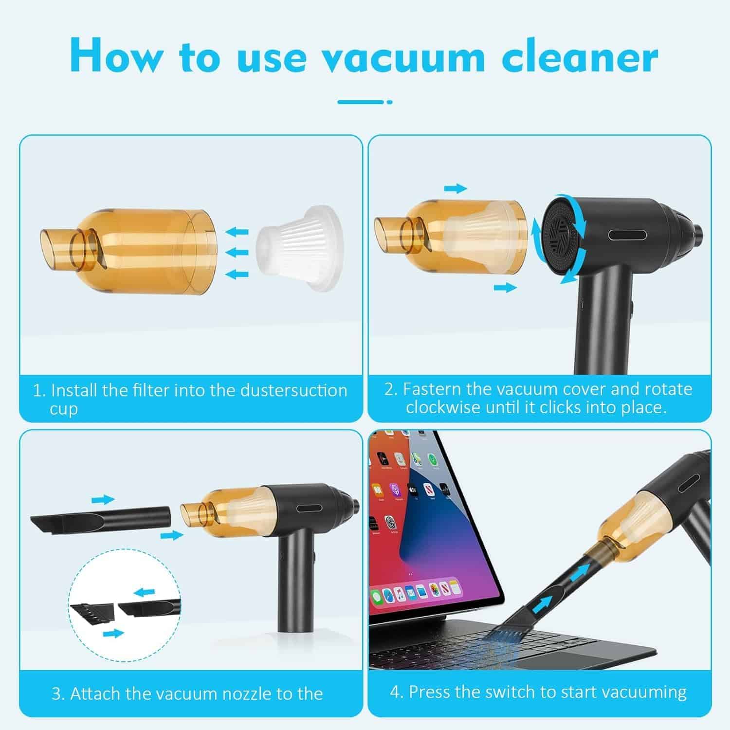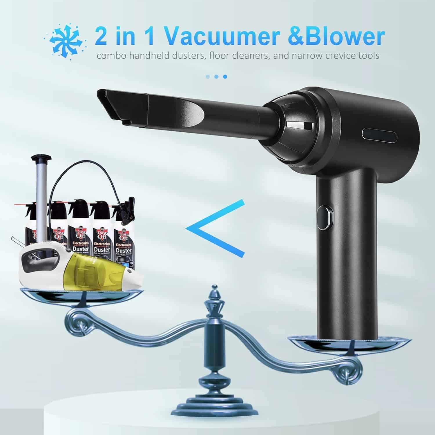 1. Motores de Alta Potencia: El soplador de aire comprimido tiene una velocidad máxima de 110000RPM, que puede producir un flujo de aire súper fuerte y una gran velocidad del viento, siendo un buen reemplazo de la lata de aire comprimido. Puede ser utilizado varias veces y no produce químicos, protegerá sus dispositivos electrónicos de líquidos de manera segura. Es más eficiente energéticamente, respetuoso con el medio ambiente y ahorra dinero en comparación con comprar constantemente aire comprimido en lata. 2. Diseño 2 en 1: Nueva actualización del 2023, combinando el soplador de aire comprimido y la aspiradora. Permite que una sola máquina pueda satisfacer múltiples necesidades de limpieza. En comparación con la necesidad de múltiples dispositivos para completar tareas de limpieza en el pasado, nuestro soplador de aire eléctrico le permite manejar fácilmente diferentes escenarios con una sola compra. 3. Batería de Gran Capacidad y Tipo-C: Nuestro soplador de aire cuenta con tecnología de batería de litio confiable con una batería integrada de 7600mAh que ofrece hasta 50 minutos de uso continuo con una sola carga. Puede cargarse por completo en solo 2 horas utilizando el cable de carga Type-C incluido. No cargue inmediatamente después de usar; cuando la temperatura de la batería es demasiado alta, espere diez minutos para que se enfríe antes de cargar. No se puede usar durante la carga. 4. Multiusos: El soplador de aire comprimido puede limpiar teclados, computadoras, PC, máquinas de fax, impresoras, aires acondicionados, sofás, etc., en cualquier lugar con espacios. Usando la boquilla larga y delgada, puede limpiar fácilmente donde su mano no puede llegar, como computadoras, ventiladores, ventanas dobles, teclados, desechos de autos, cabello, sofás, lentes de cámara. Estos sopladores de aire incluso pueden inflar anillos de natación, cojines de aire, kayaks, pelotas de yoga, etc. 5. 2 Cepillos y 5 Boquillas: Según las diferentes necesidades de limpieza, hemos equipado el soplador con 4 boquillas y 2 cepillos y 1 taza de aspiradora: los cepillos mini y las boquillas largas para áreas difíciles de alcanzar, y una boquilla plana y ancha expande las áreas de succión.