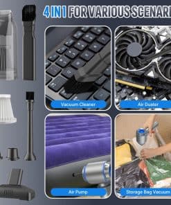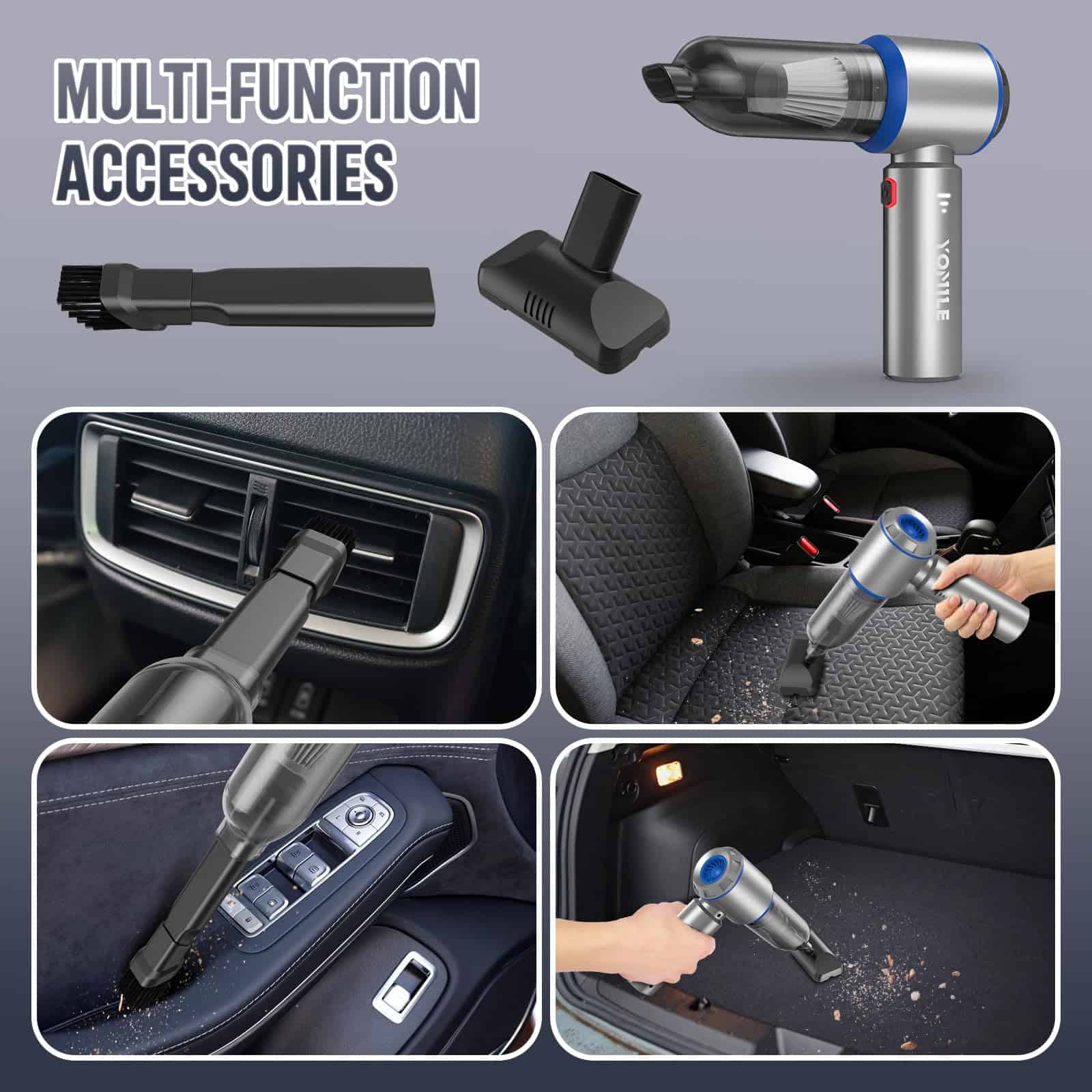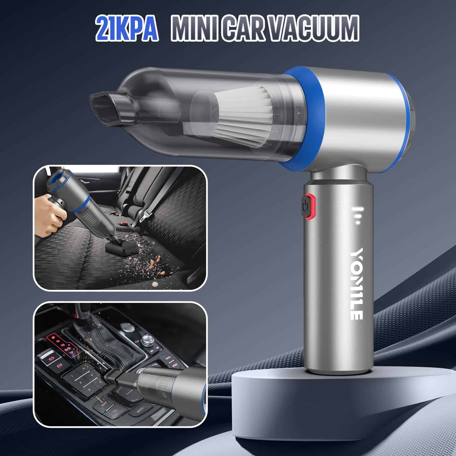 1. Aspiradora mini multifuncional 2 en 1 Esta mini aspiradora para coche tiene un modo dual de soplado y succión. No solo puede soplar basura y polvo de teclados de computadora, coches, etc., sino también actuar como una mini aspiradora para limpiar basura residual o cabello de escritorio, suelos, pelo, etc. Haciéndolo una excelente compra para sus necesidades de limpieza, ya no tendrá que preocuparse por la limpieza.