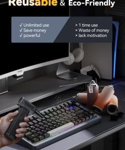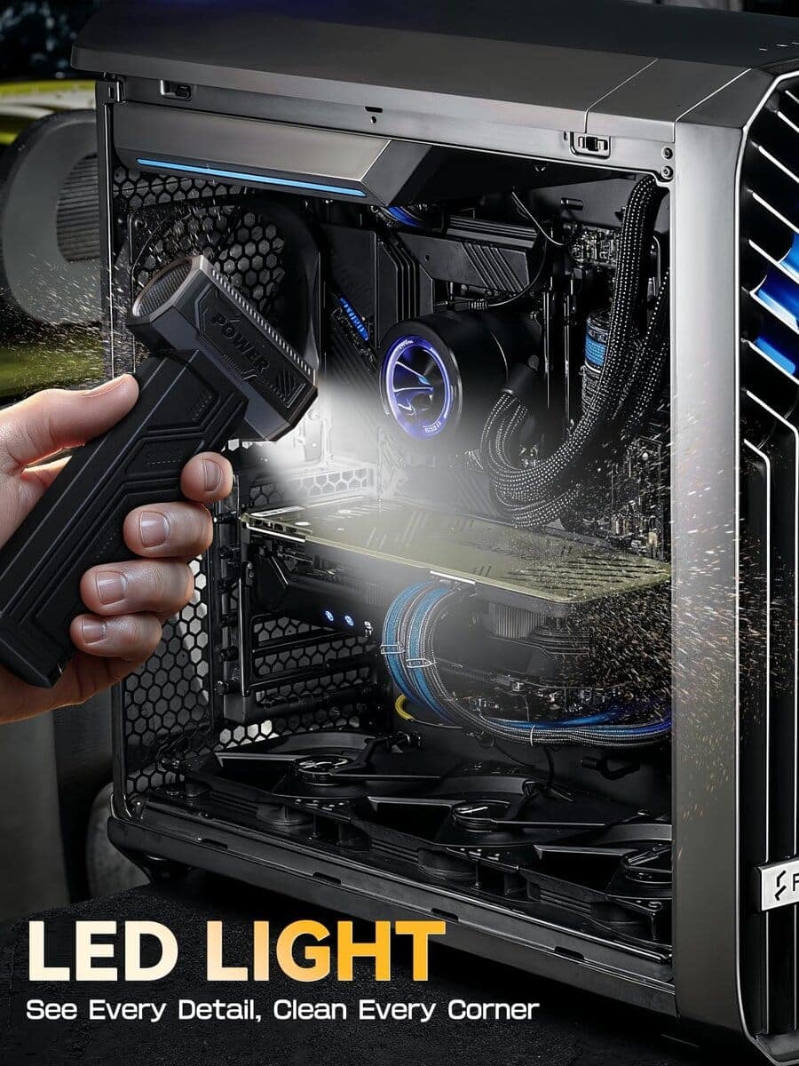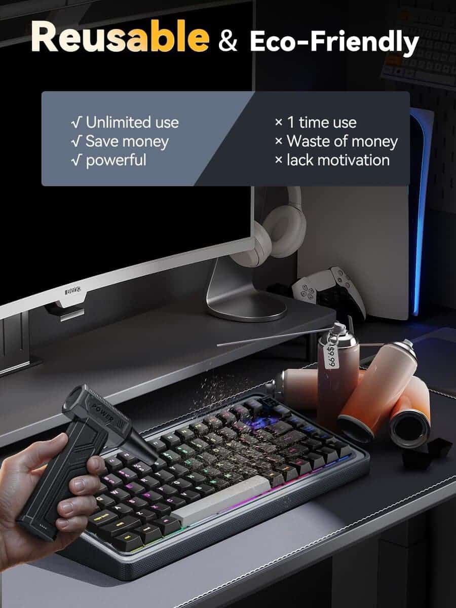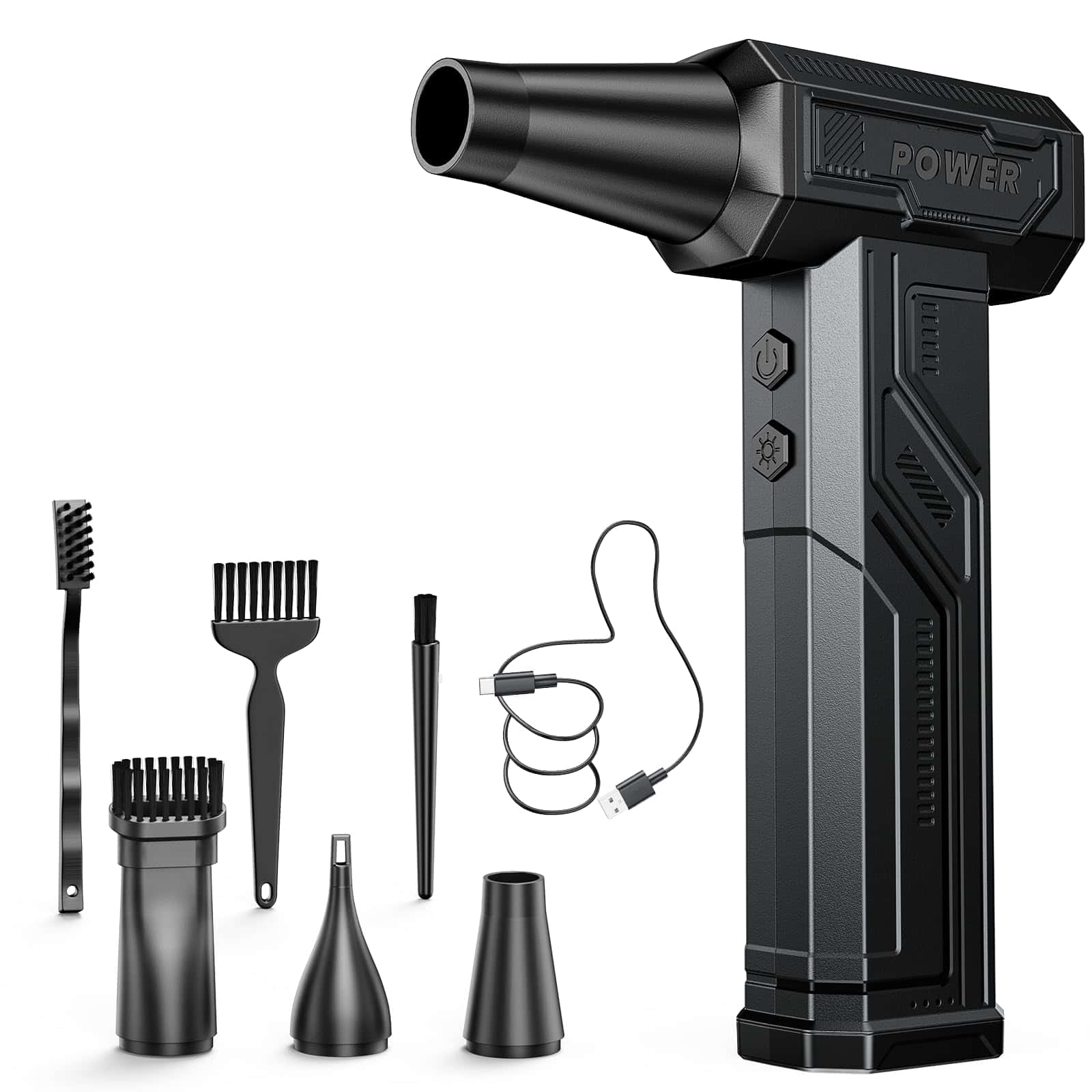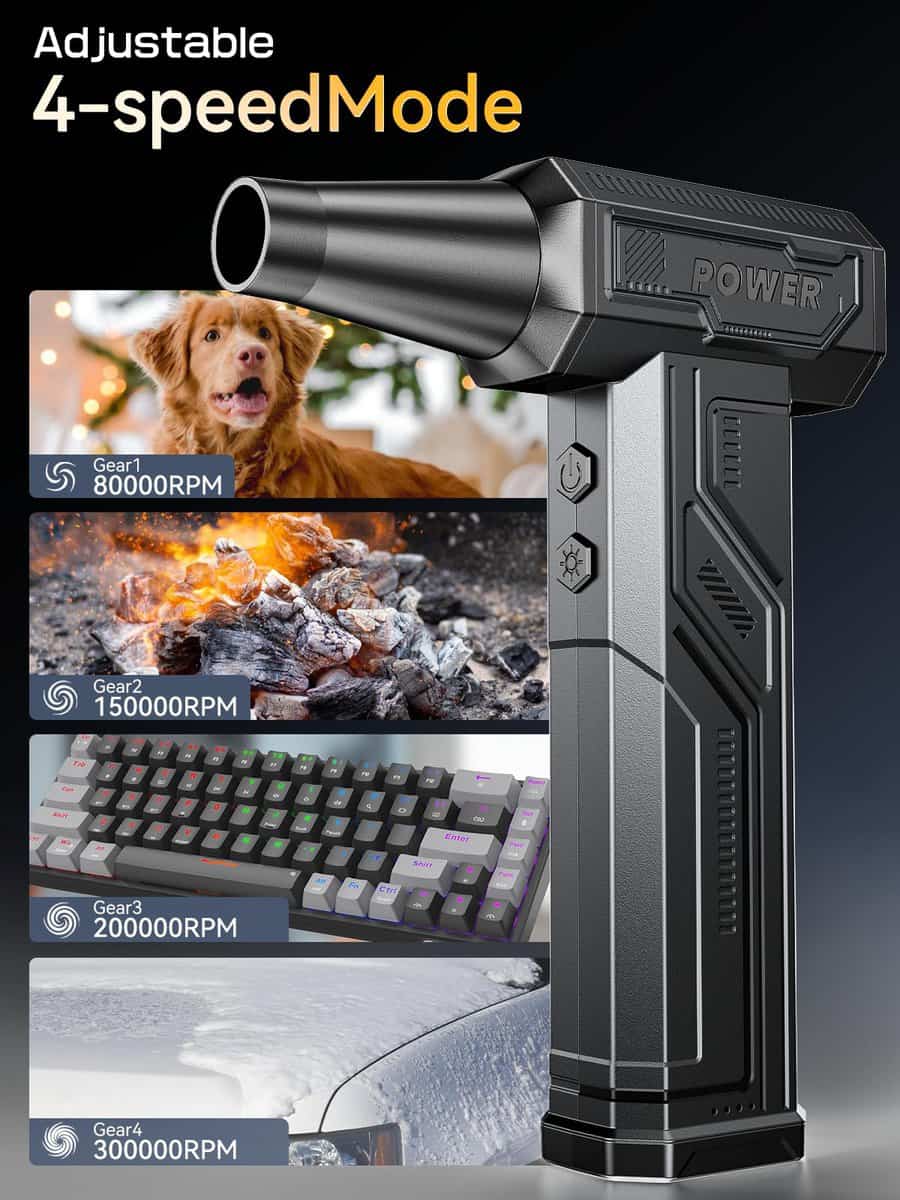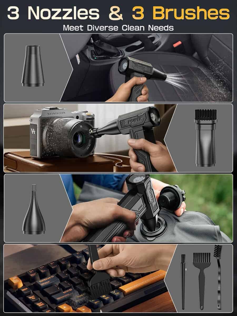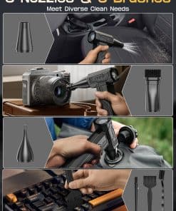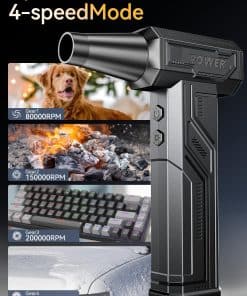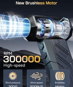 Soplador de Aire Eléctrico, 300000RPM 4 Velocidades Ajustables Soplador de Aire Comprimido con Luz, Motor sin Escobillas Recargable Soplador de Aire para Teclado, PC, Coche y Limpieza del Hogar Reemplaza el Spray de Aire Comprimido Reutilizable – La sopladora de aire eléctrica cuenta con un impresionante rendimiento de 300,000 RPM, ofreciendo un flujo de aire potente para eliminar eficazmente el polvo y los residuos, lo que la convierte en la opción ideal para la limpieza de electrónicos, el hogar y el interior del coche. Equipado con 3 boquillas y 3 cepillos, este soplador de aire es una herramienta de limpieza versátil que se adapta a una variedad de tareas, desde limpiar PCs y teclados hasta inflar equipo para exteriores y gestionar fogatas. Además, este soplador de aire comprimido es ecológico y rentable, siendo una alternativa reutilizable y sostenible a los botes de aire comprimido de un solo uso, lo que permite ahorros a largo plazo y reduce el impacto ambiental. Con una capacidad de batería de 10,000mAh, este soplador de aire para computadora admite carga rápida y proporciona un tiempo de ejecución extendido, asegurando sesiones de limpieza ininterrumpidas. Su diseño compacto y portátil, con un peso de solo 0.7 libras, lo convierte en una opción ligera y fácil de transportar, con un práctico bolso de almacenamiento que facilita el uso portátil durante viajes, campamentos o limpieza en interiores. Además, el Soplador de Aire Eléctrico viene con una garantía de 12 meses y un servicio de atención al cliente profesional, garantizando tranquilidad y resolución rápida para cualquier problema relacionado con el producto.