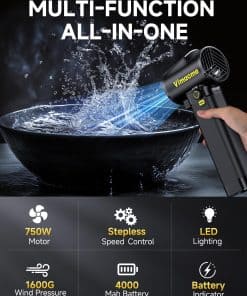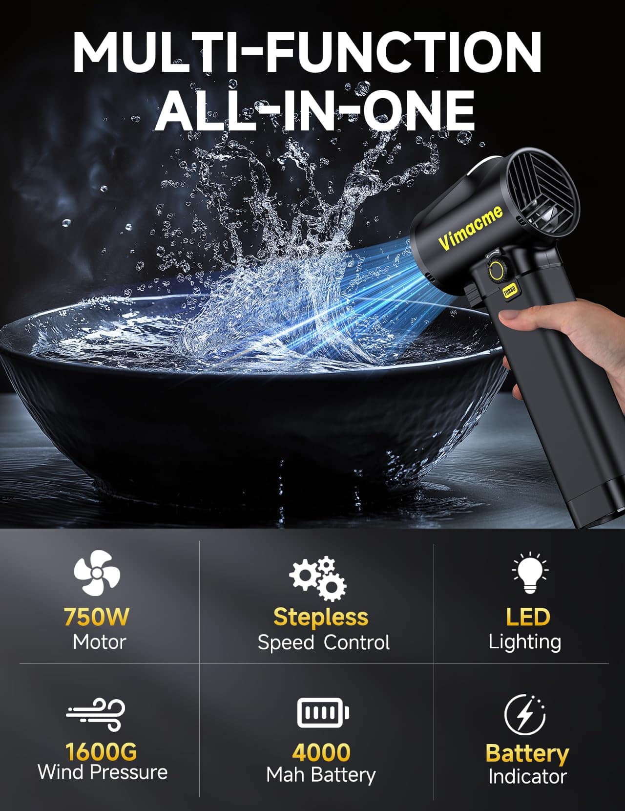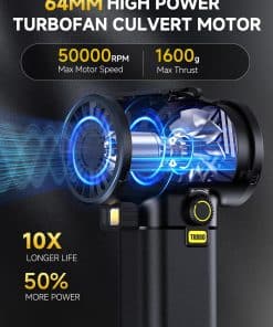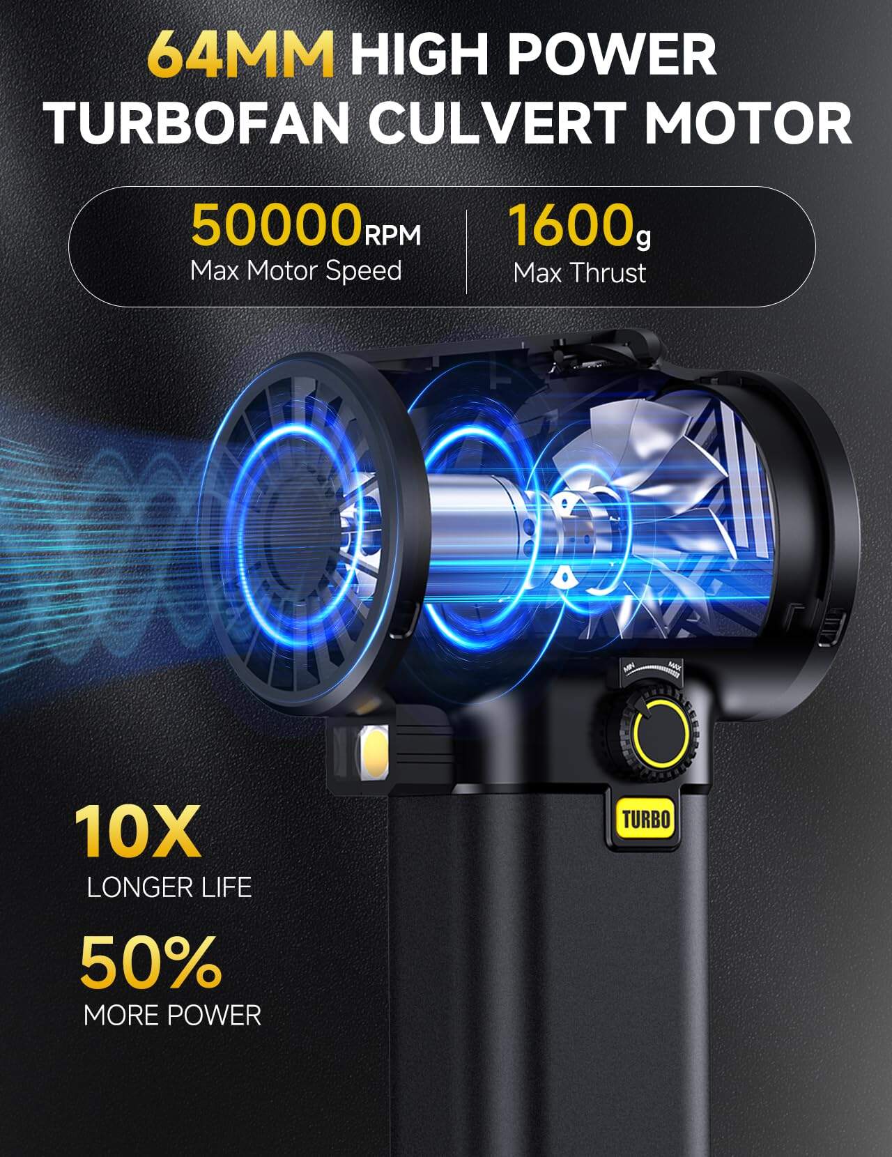 1. Rendimiento inigualable: El soplador de aire para autos está equipado con un ventilador turbo de 64mm de alto rendimiento y un potente motor de 750W, ofreciendo una potencia de limpieza incomparable. Genera un impresionante empuje de 1600g y velocidades de viento de hasta 60m/s, ¡equivalente a la fuerza de un tifón de categoría 17! Con este rendimiento extraordinario, puedes limpiar a fondo una variedad de escenarios en solo minutos, convirtiéndolo en una herramienta esencial para cualquier hogar o limpiador profesional!.