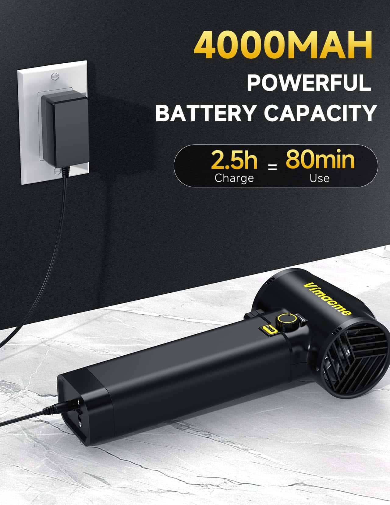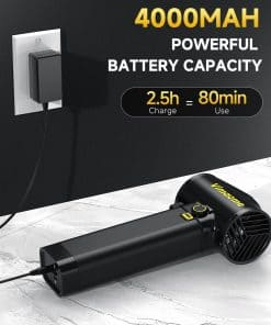 2. Carga HyperSpeed: El soplador de hojas inalámbrico altamente eficiente y conveniente cuenta con una batería grande integrada de 4000mAh, emparejada con un práctico cargador rápido. Con solo una carga de 2.5 horas, puedes disfrutar de un impresionante rendimiento duradero de 80 minutos, manejando sin esfuerzo la limpieza del patio o actividades al aire libre. Ya sea para tareas de jardinería o tiempo de ocio, te garantiza una experiencia sin preocupaciones y placentera en cualquier momento y lugar!.