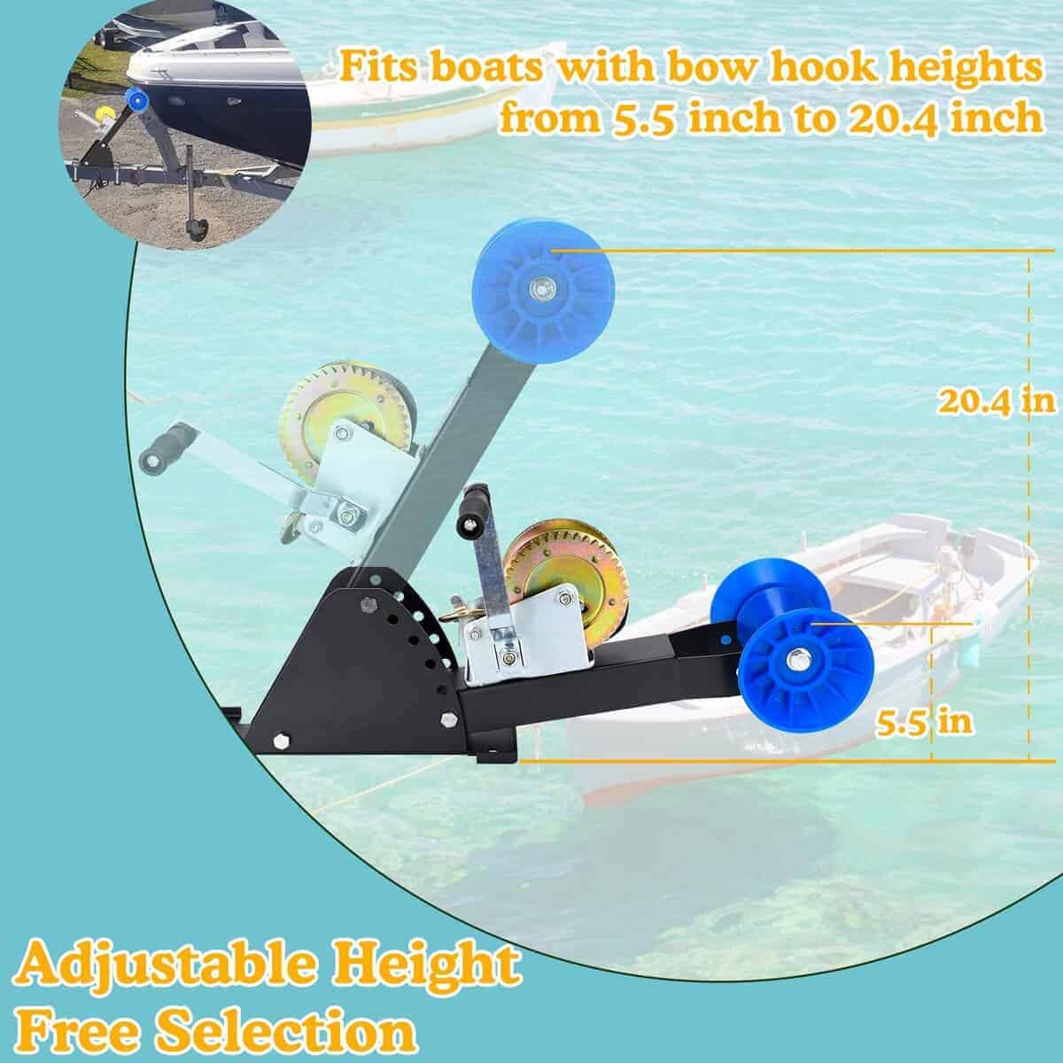 3. Altura ajustable y elija como desee: Este soporte de cabrestante para remolque de bote es ajustable en altura, con una altura mínima de 5.5 pulgadas y una altura máxima de 20.4 pulgadas (la distancia entre el centro del rodillo y el marco del remolque). Con una amplia gama de ajustes, este soporte de cabrestante es adecuado para una amplia gama de tamaños de botes, como lanchas rápidas, barcos de bajo y lanchas motoras, perfecto para personas que desean ajustar la altura para su remolque de bote.