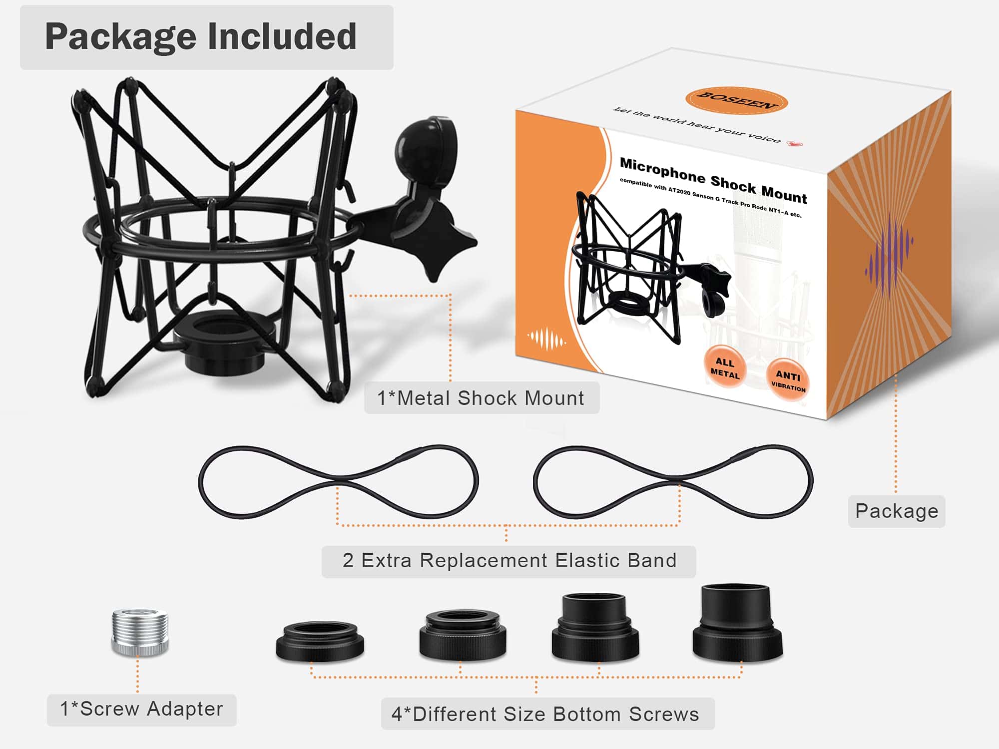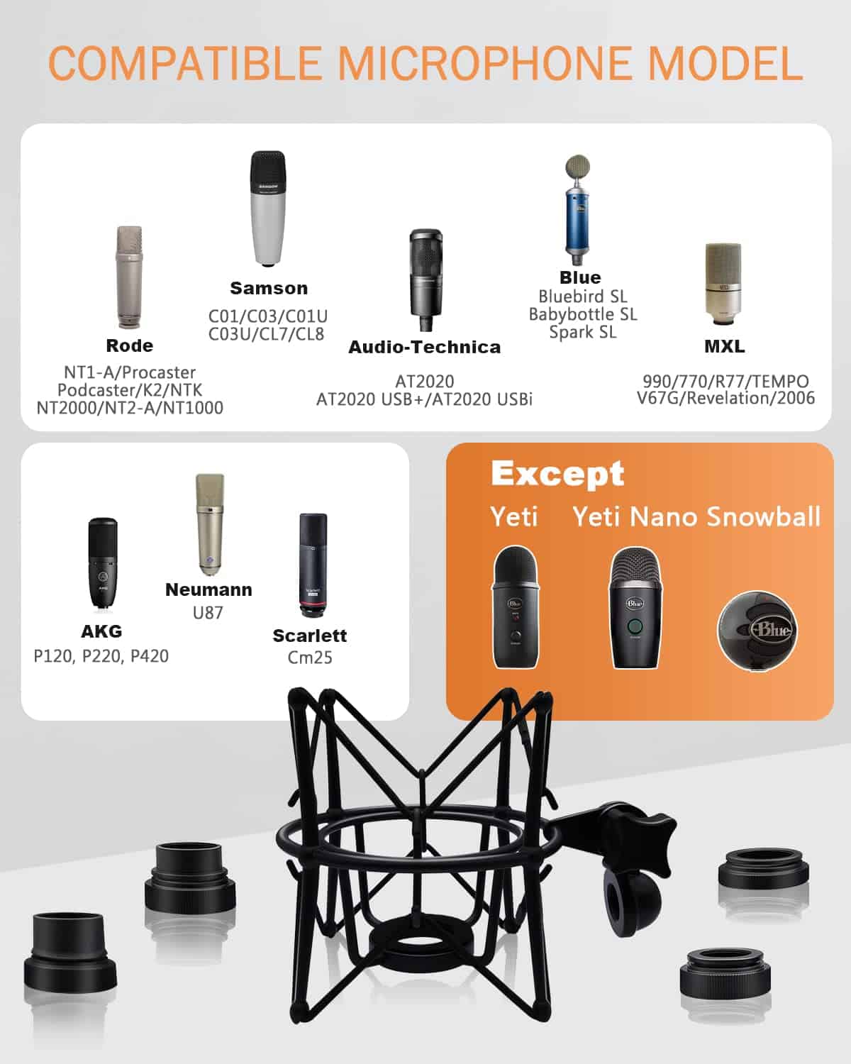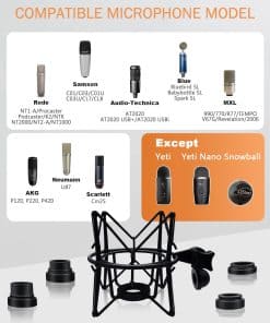 2. Aplicable para muchos tipos de micrófonos – Este soporte antivibración viene con 4 diferentes tornillos inferiores, que pueden ser compatibles con múltiples estilos de micrófonos, como AT(2020, 2020 USB), Rode(NT1-A, Procaster, Podcaster, K2, NTK, NT2000, NT2-A, NT1000), Samson(C01, C03, C01U, C03U, CL7, CL8), MXL(990, 770, R77, TEMPO, V67G, 2006), AKG(P120, P220, P420), Blue(Ember, Bird SL, Babybottle SL, Spark SL excepto Yeti, Snowball, Nano), Neumann U87 y Scarlett Cm25.