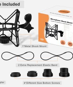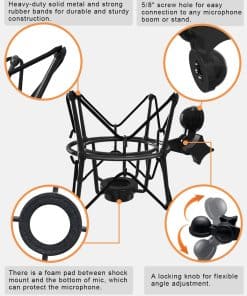 3. Duradero y ajustable – El soporte antivibración está hecho totalmente de metal pesado de alta resistencia, salvo la banda elástica y la almohadilla. También viene con almohadillas de montaje para proteger la parte inferior del micrófono. Cuenta con un tornillo de 5/8 de pulgada con un perno ajustable que puede ser fácilmente conectado a cualquier brazo de micrófono o soporte universal.