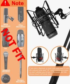 4. ¡NOTA! – 1. El soporte antivibración no es compatible con micrófonos de mano, como SM58, Q2U, ATR2100. 2. Tampoco es adecuado para muchos micrófonos USB con perillas de función, como Fifine, Blue Yeti/Snowball, Razer. (Los diámetros de los hilos inferiores de menos de 20 mm no son adecuados. Muchos micrófonos USB tienen hilos inferiores de 5/8 de pulgada, que son mucho menos de 20 mm.) 3. Los micrófonos sin hilos en la parte inferior no se pueden fijar en nuestro soporte antivibración, como AT2035/2050, Heil PR40.