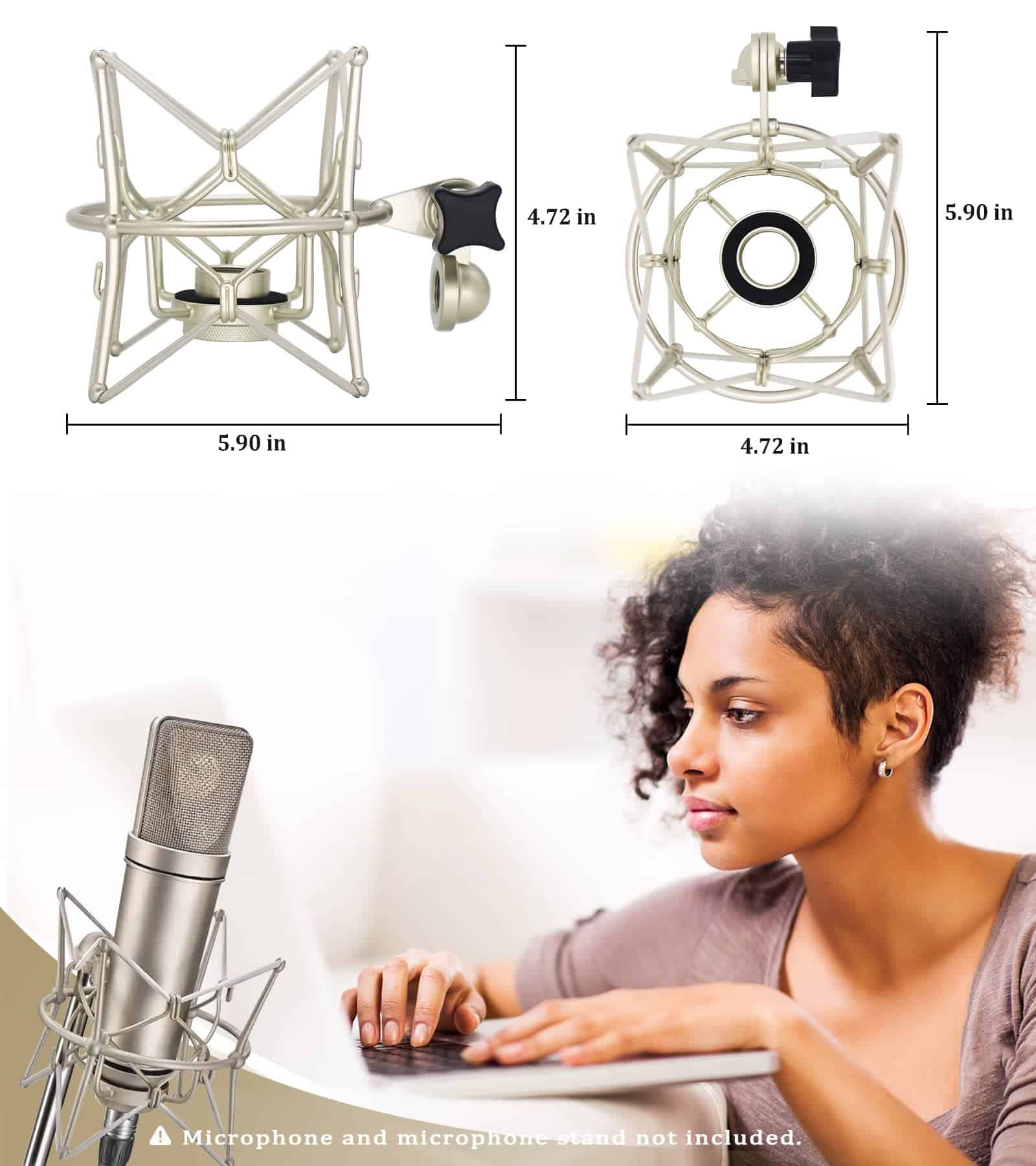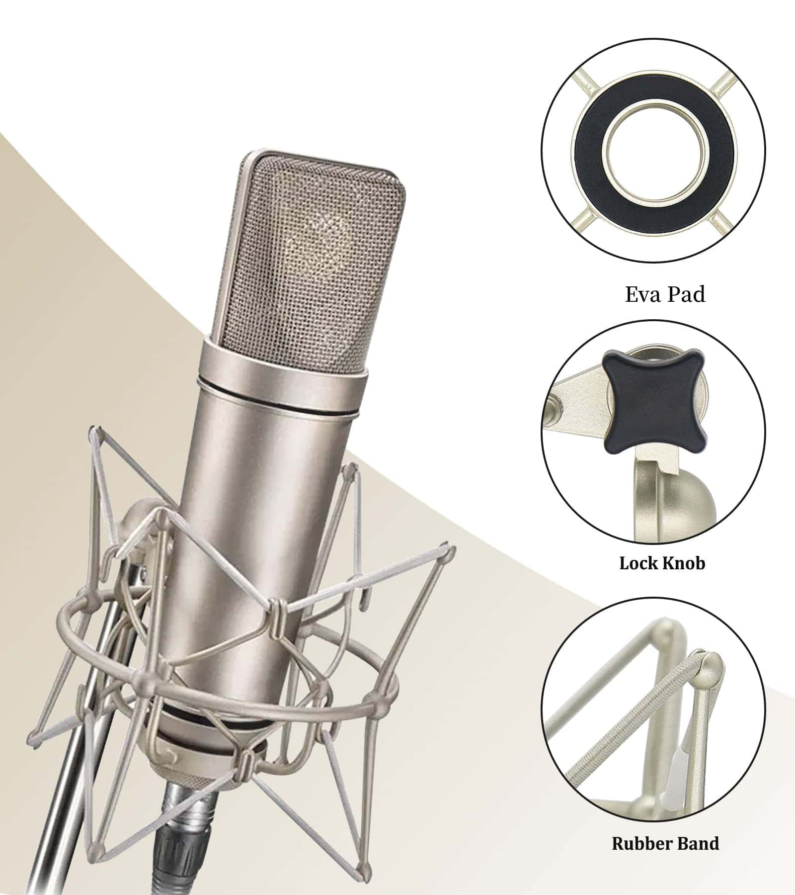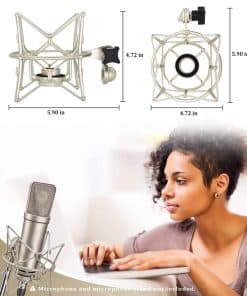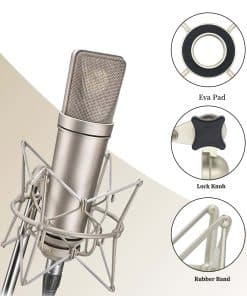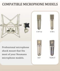 1. Gran Compatibilidad Nuestro soporte de amortiguador es compatible con micrófonos Neumann, como U87 Ai, U89 i,TLM 67, TLM 193, TLM 127 y TLM 170. 2. Características de ajustabilidad Cuenta con un perilla de bloqueo ajustable en ángulo, el soporte a prueba de golpes se puede ajustar en 180 , lo que es conveniente para diversas direcciones de captación del micrófono. Y ofrecemos un adaptador de 5/8��-3/8��, que puede conectarse fácilmente a cualquier brazo o soporte de micrófono. 3. Robusto y Duradero Completamente construido en metal sólido con superficie pintada para una resistencia robusta y resistente al desgaste. El cordón elástico en bucle está conectado al gancho metálico en la parte inferior del micrófono, lo que puede reducir eficazmente la vibración causada por vibraciones. 4. Anti Vibración Este soporte de micrófono está diseñado para montar micrófonos Neumann condensadores de grabación con el propósito de aislar o reducir la vibración física, ruido de piso y soporte de manera efectiva. Es ideal para grabación, podcasting. Hará que el efecto de grabación sea más apropiado y tenga una mejor experiencia. 5. Nota NO COMPATIBLE con algunos micrófonos Neumann, U67, U87 y U89. Si tiene alguna pregunta, puede contactarnos en cualquier momento, le atenderemos las 24 horas del día.