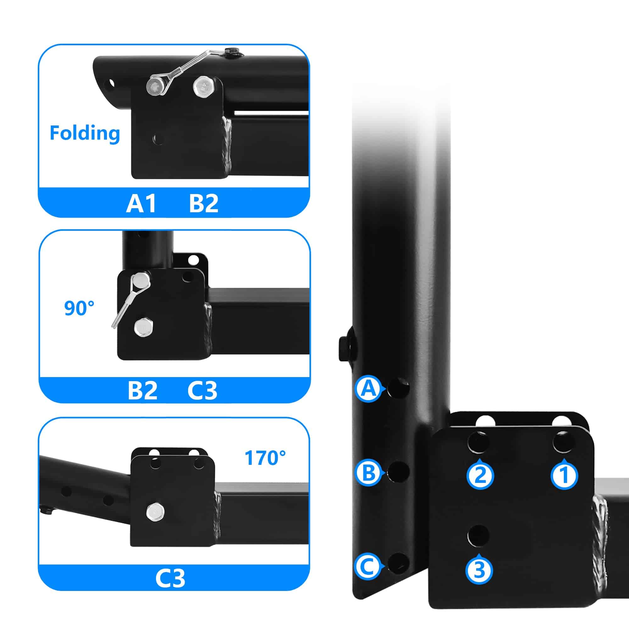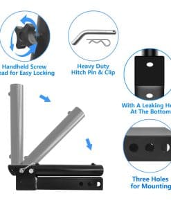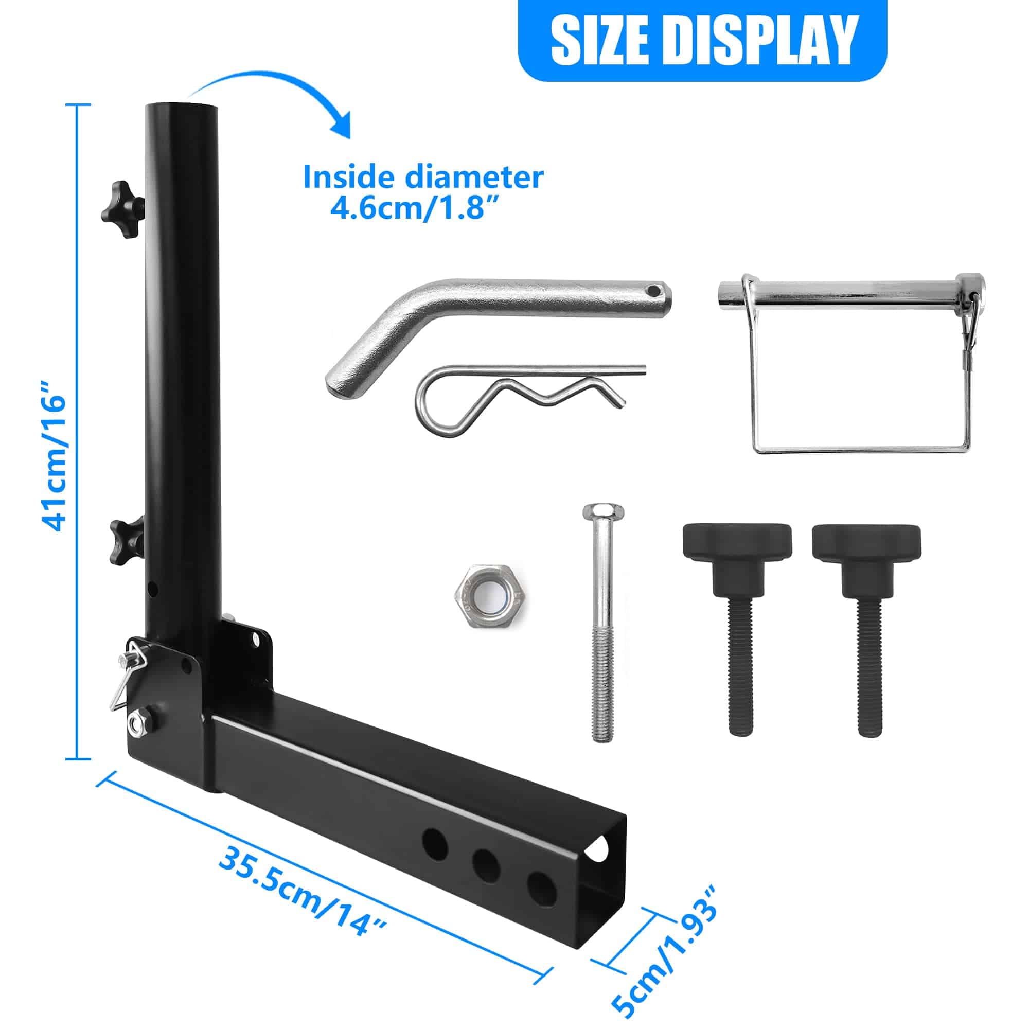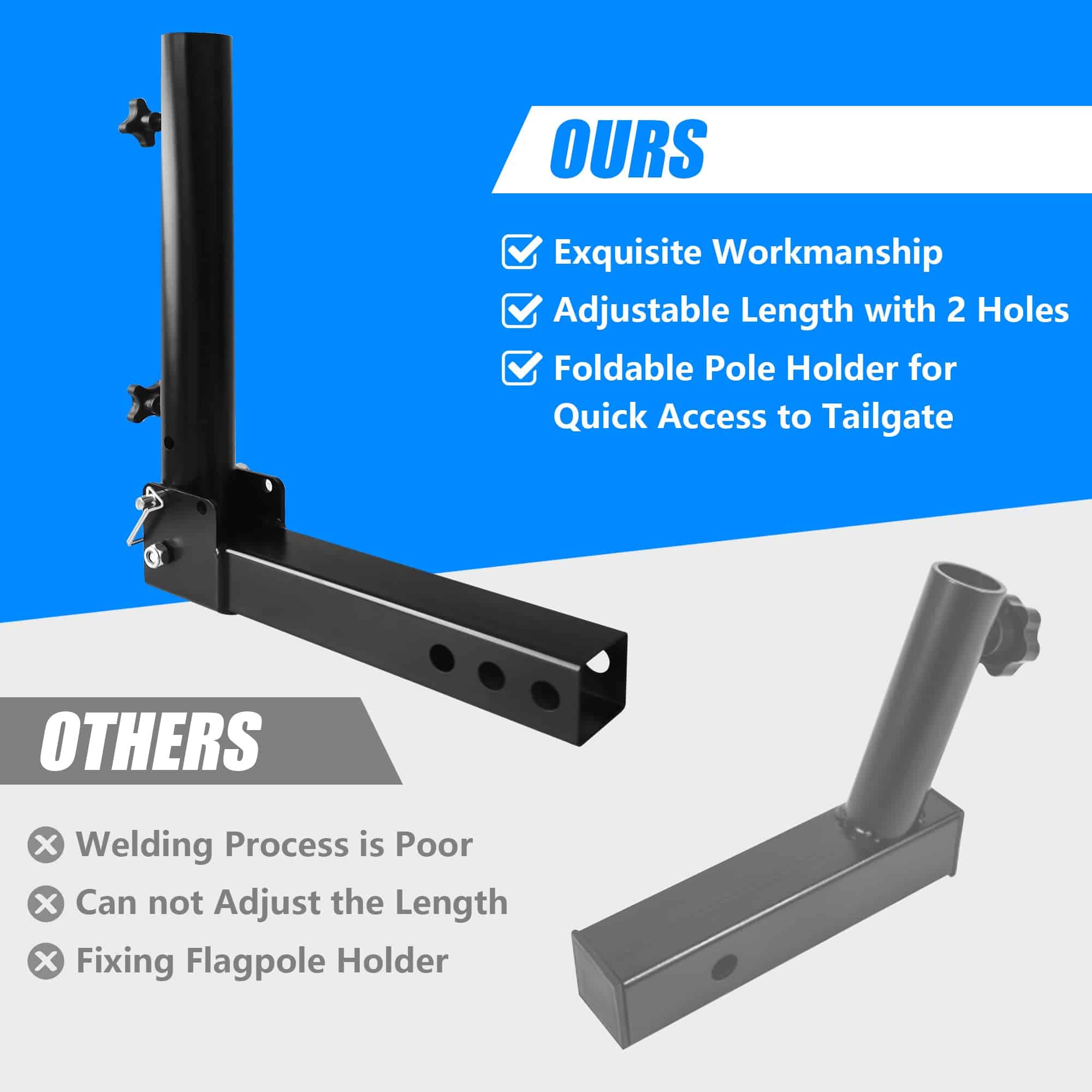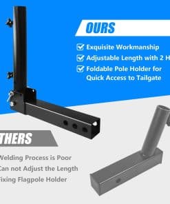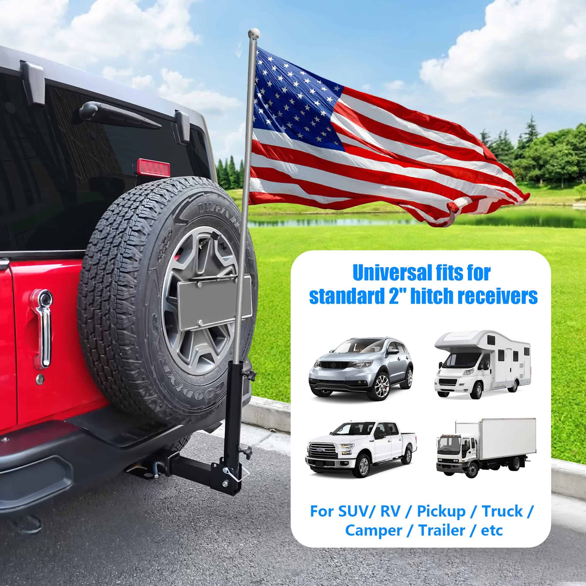 Ámbito de aplicación: El soporte de asta de bandera para enganche se adapta a receptores estándar de 2 pulgadas, incluidos SUV, RV, Pickups, Camionetas, Remolques, etc. El soporte de asta de bandera asegura todas las astas de hasta 1-1/2 pulgadas de diámetro apretando los tornillos. Este montaje de bandera para auto es fácil de almacenar y ahorra espacio. Longitud ajustable con 3 agujeros: Diseñado con 3 agujeros para diferentes necesidades, flexible de usar. El asta de bandera inclinada puede alejarse de tu automóvil, permitiendo que la bandera se muestre mejor. Instalación fácil: Desliza el soporte en el receptor del enganche y fíjalo con el pasador del enganche en el paquete. Una vez que se inserta el asta de la bandera, se puede fijar apretando el tornillo sin necesidad de usar herramientas. Paquete incluye: 1 soporte de asta de bandera para enganche, 1 tornillo, 1 pasador del enganche, 2 tornillos de plomo, 1 pasador de acoplador. Bandera y asta de bandera no incluidas. Garantía de 1 año, no dudes en contactarnos ante cualquier problema.