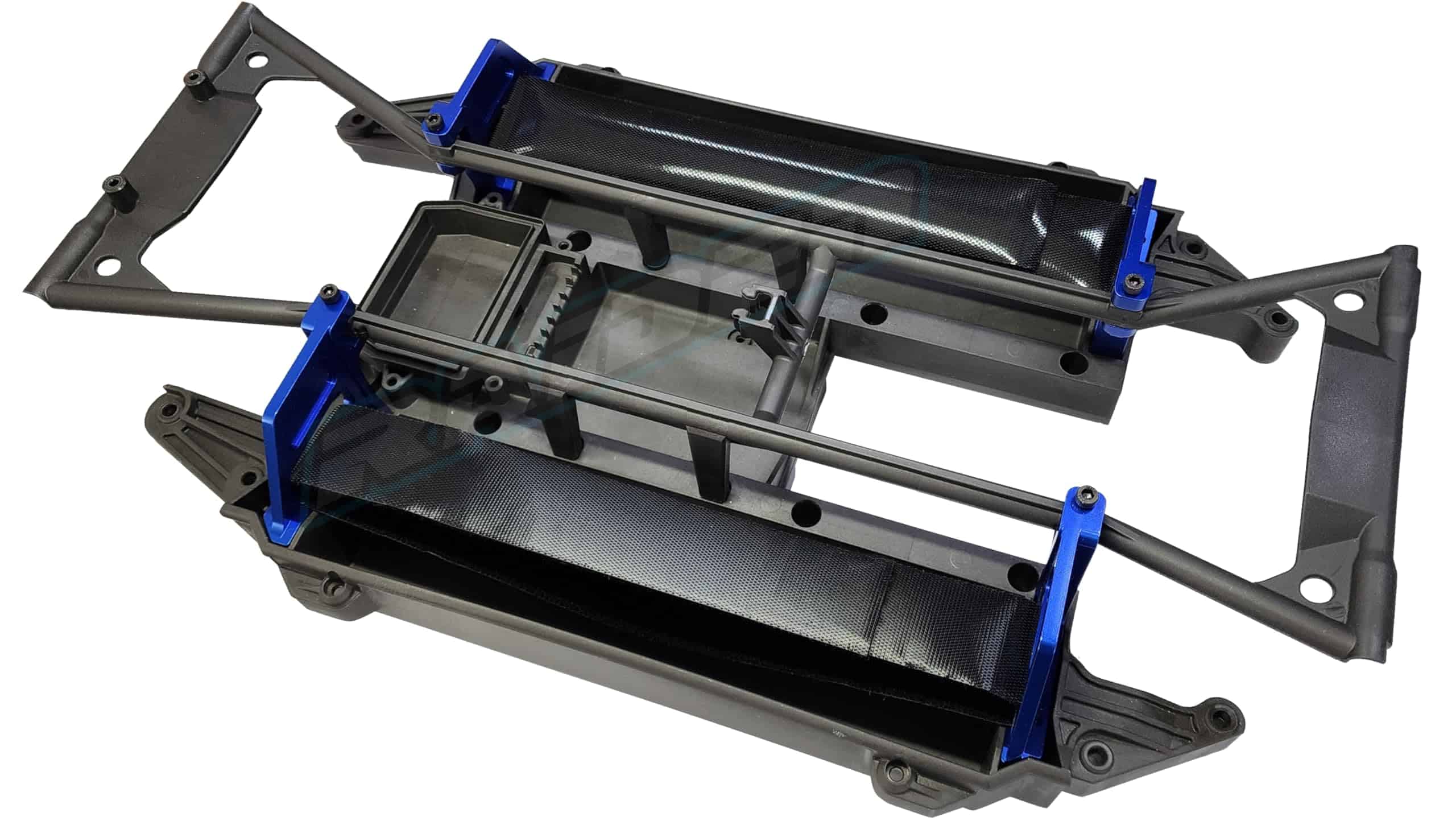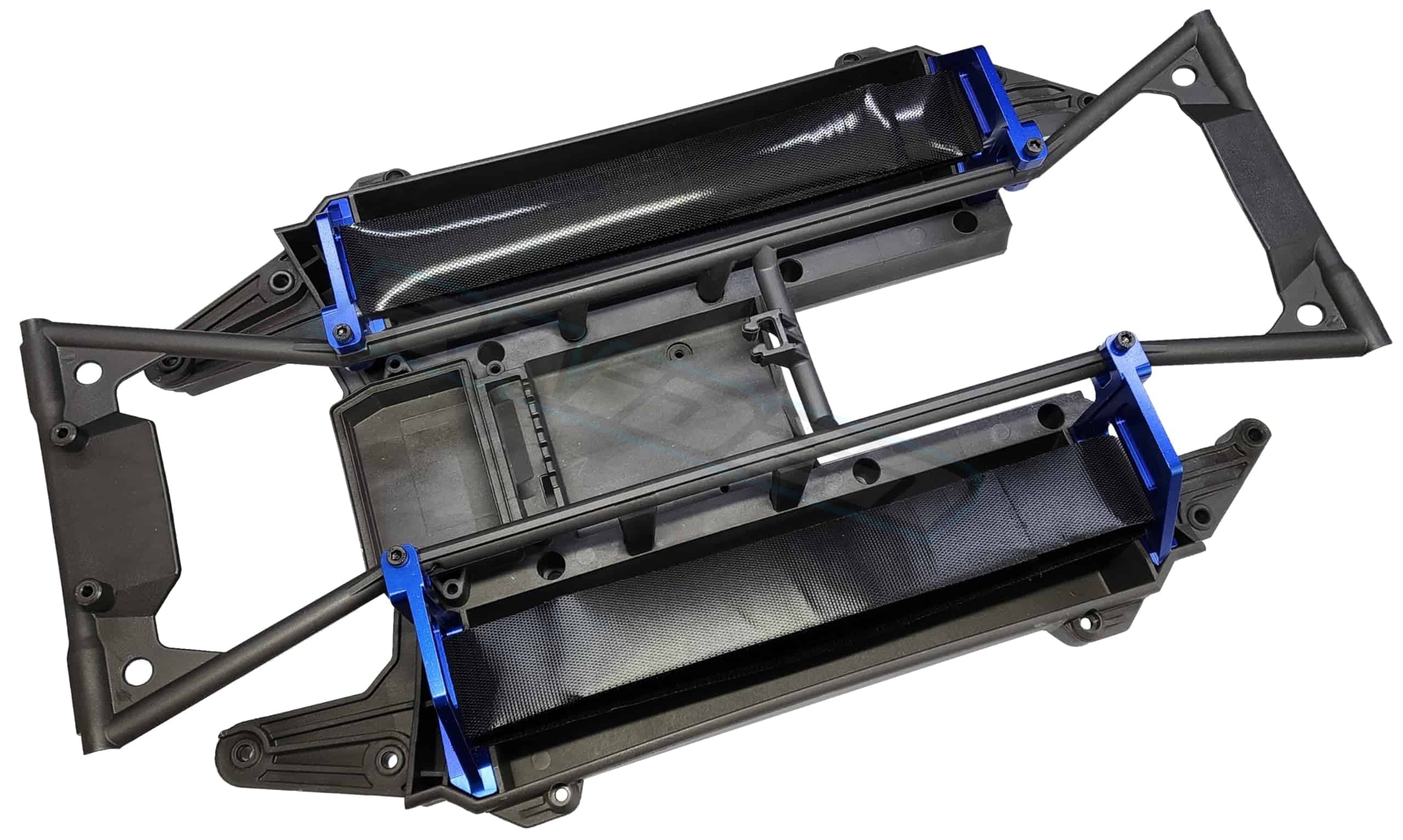 Soporte de batería alto de aleación de aluminio para Traxxas 1/5 X-MAXX – Negro. Este soporte de batería está hecho de aleación de aluminio 6061 de alta calidad y viene en color negro. Diseñado especialmente para Traxxas 1/5 X-MAXX, este soporte de batería alto proporciona una sujeción segura para tus baterías durante tus carreras de control remoto. Atención: Este artículo solo incluye el soporte de batería, el chasis en la imagen no está incluido. Además, incluye un conjunto de montaje de correa x 4, correa x 2 y tornillo x 12 para una fácil instalación. ¡Haz que tu Traxxas 1/5 X-MAXX esté listo para la acción con este soporte de batería de alta calidad!