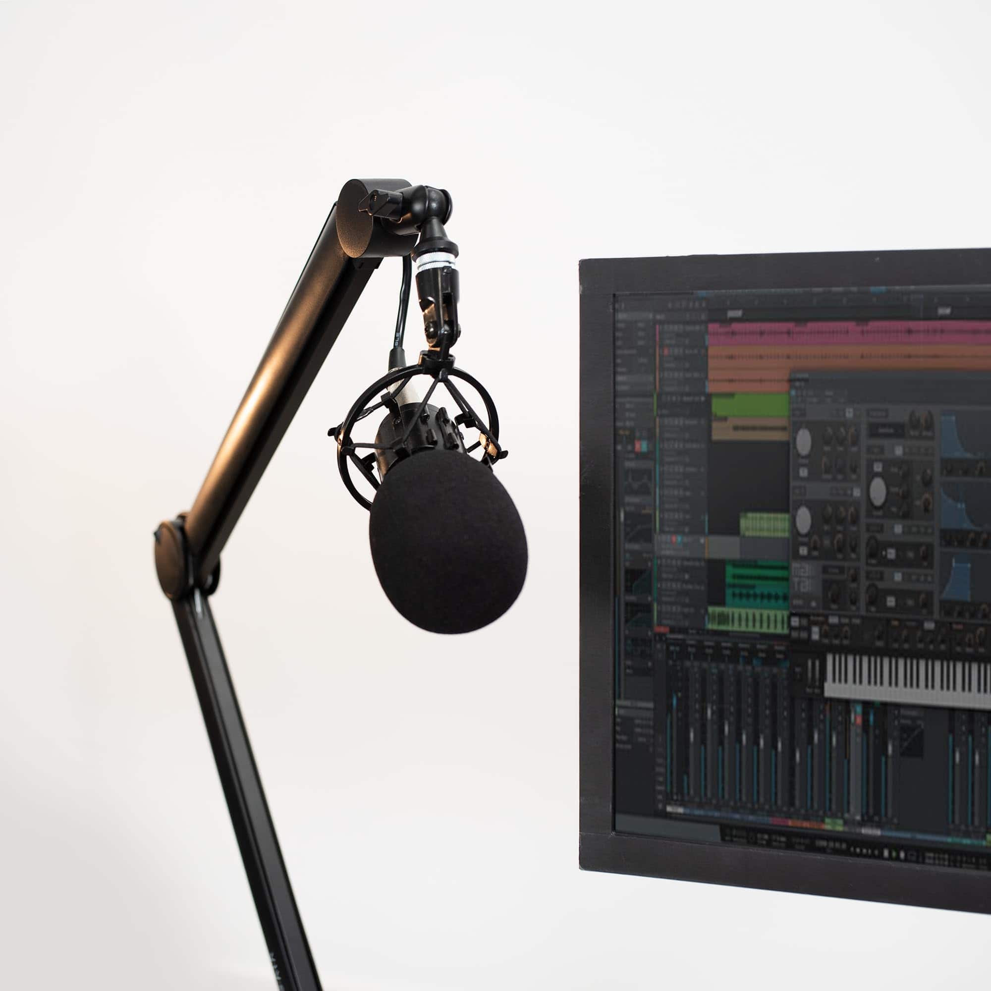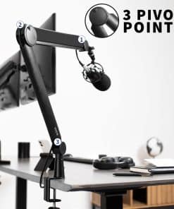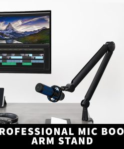 Soporte de brazo de micrófono – Este soporte de brazo de micrófono montado en escritorio se fija a escritorios de hasta 2.2 pulgadas de grosor para prepararte para transmisiones, grabaciones, podcasts, juegos, música y más! El extremo del brazo resistente se adapta a hilos de micrófono de 3/8 o 5/8 y soporta hasta 2.2 lbs de peso.