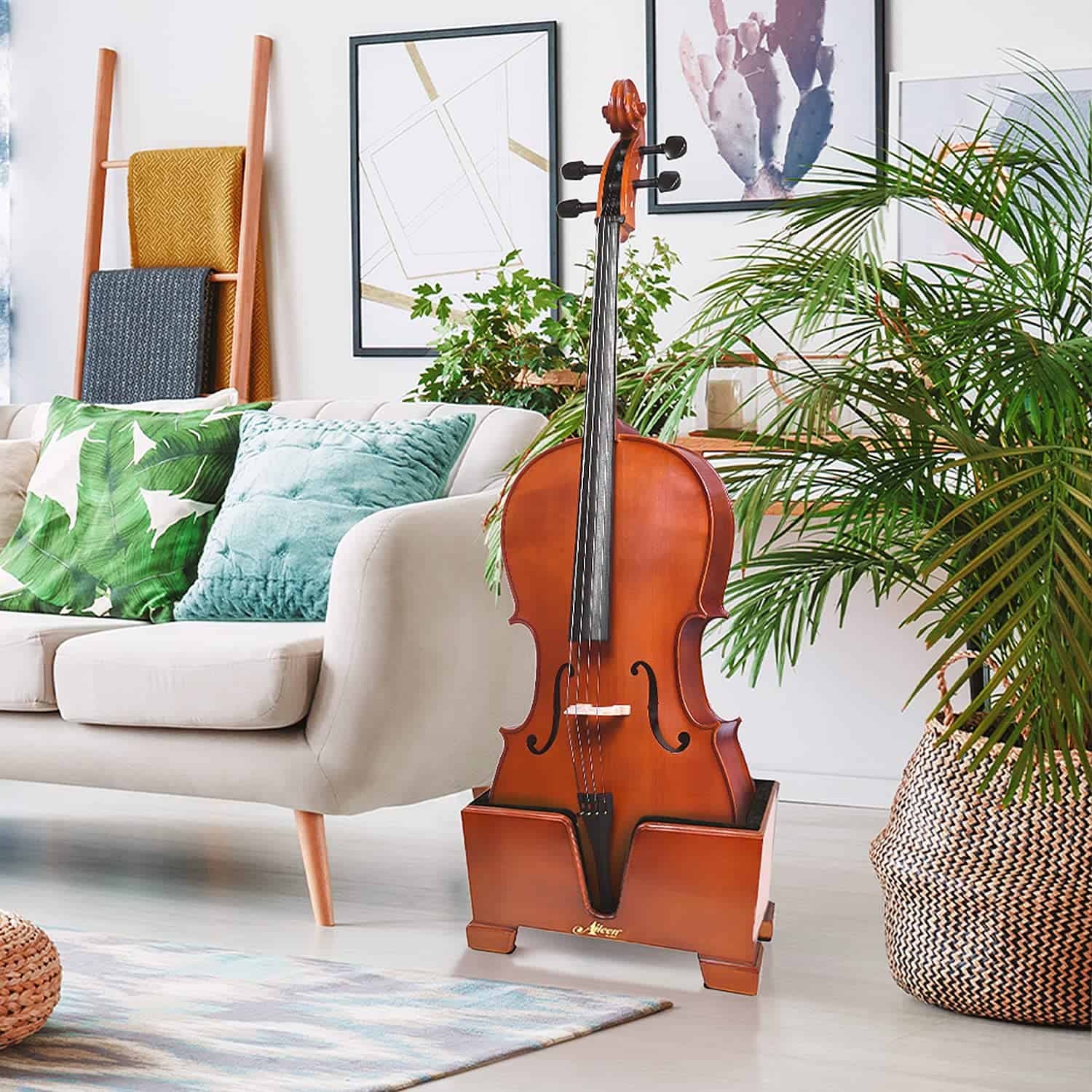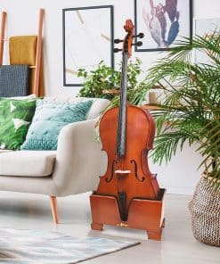 Soporte de caja de violonchelo de madera color burdeos de