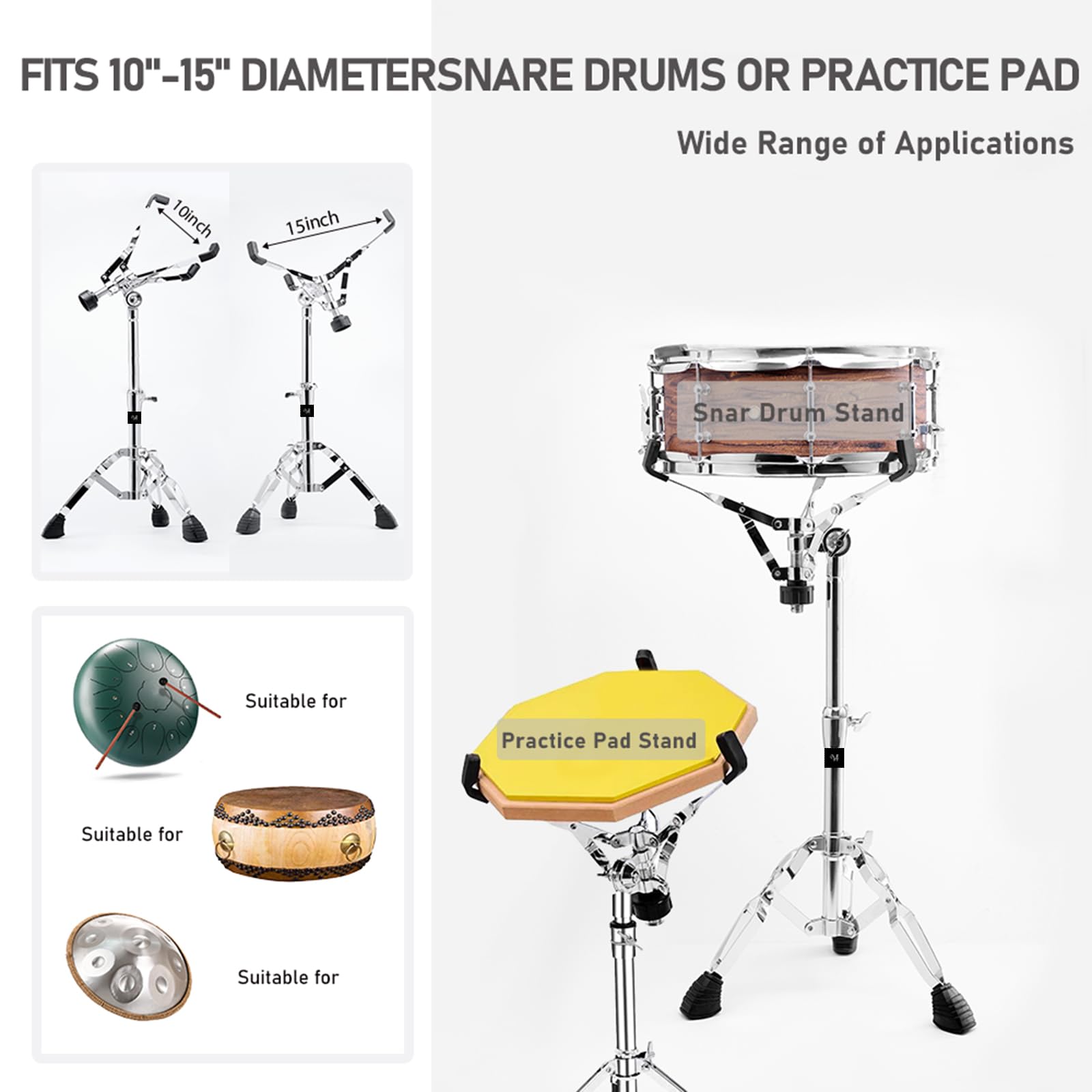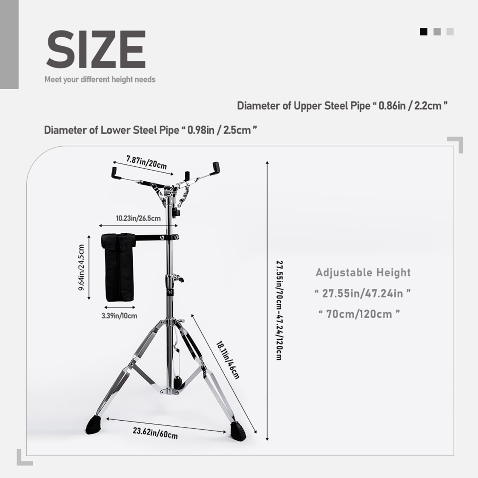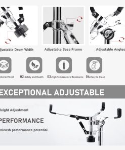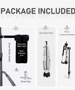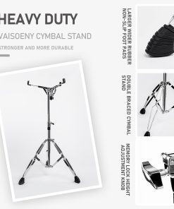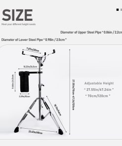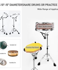 El soporte de caja Vaisoeny tiene una altura ajustable de (29.5″-47″ pulgadas / 75-120 cm) para acomodar cajas de hasta 15 pulgadas, construcción completa de hierro, doble soporte de placa, patas de soporte de 16.5 pulgadas de longitud y puede acomodar a bateristas jóvenes para tocar de pie o sentados. Equipado con un diseño de trípode ampliamente plegable y reforzado, puntas de brazo de goma y pies de goma antideslizantes para mayor estabilidad, el soporte de caja es fácil de transportar, almacenar y viajar. El diseño de puntas de brazo de goma engrosadas y ensanchadas hace que el soporte de almohadilla para caja sea más estable. El soporte de almohadilla de práctica viene con un soporte para baquetas que sostiene hasta 10 pares de baquetas, lo que le permite acceder a la baqueta en cualquier momento durante la actuación y no es fácil perderla o perder tiempo buscándola. Fácil de instalar y quitar, el inclinador uni-lock del soporte de caja permite un posicionamiento suave y sin engranajes perfecto para estudiantes o jugadores avanzados.