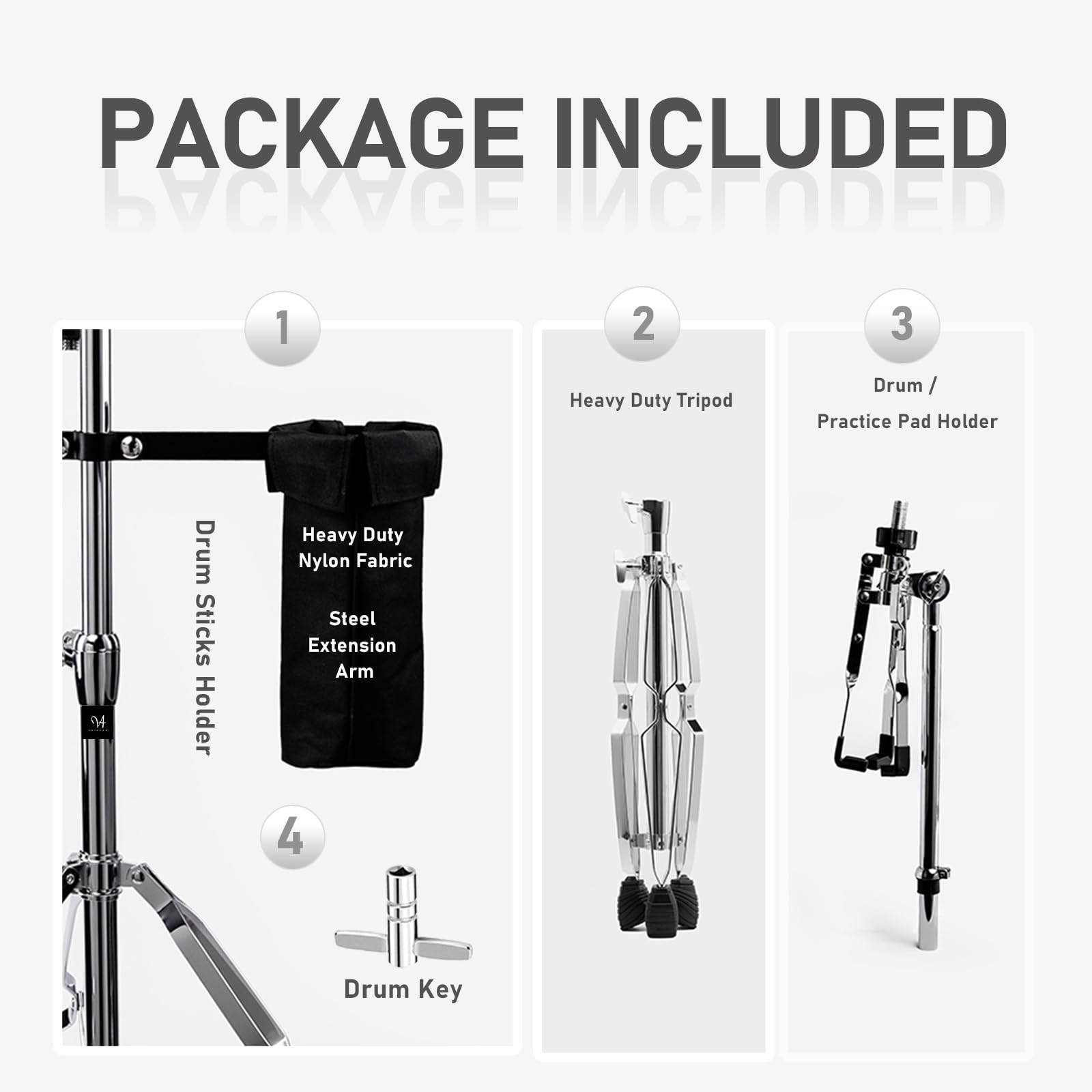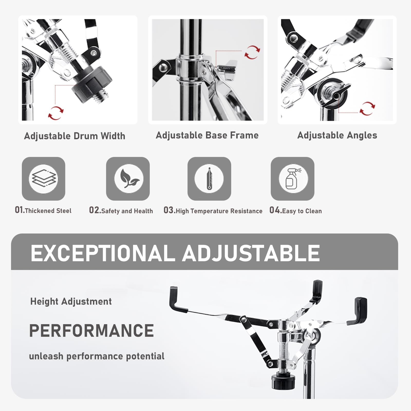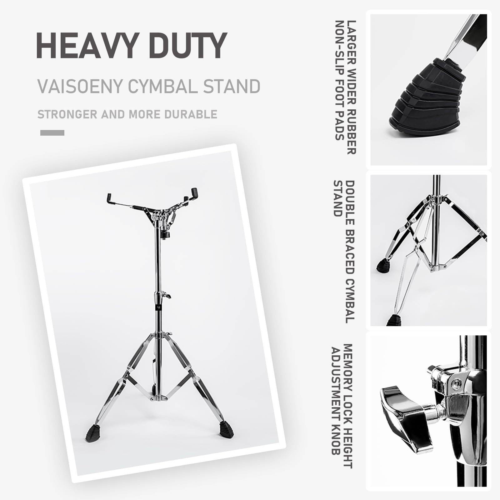 El soporte de caja Vaisoeny tiene una altura ajustable de (29.5″-47″ pulgadas / 75-120 cm) para acomodar cajas de hasta 15 pulgadas, construcción completa de hierro, doble soporte de placa, patas de soporte de 16.5 pulgadas de longitud y puede acomodar a bateristas jóvenes para tocar de pie o sentados. Equipado con un diseño de trípode ampliamente plegable y reforzado, puntas de brazo de goma y pies de goma antideslizantes para mayor estabilidad, el soporte de caja es fácil de transportar, almacenar y viajar. El diseño de puntas de brazo de goma engrosadas y ensanchadas hace que el soporte de almohadilla para caja sea más estable. El soporte de almohadilla de práctica viene con un soporte para baquetas que sostiene hasta 10 pares de baquetas, lo que le permite acceder a la baqueta en cualquier momento durante la actuación y no es fácil perderla o perder tiempo buscándola. Fácil de instalar y quitar, el inclinador uni-lock del soporte de caja permite un posicionamiento suave y sin engranajes perfecto para estudiantes o jugadores avanzados.