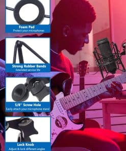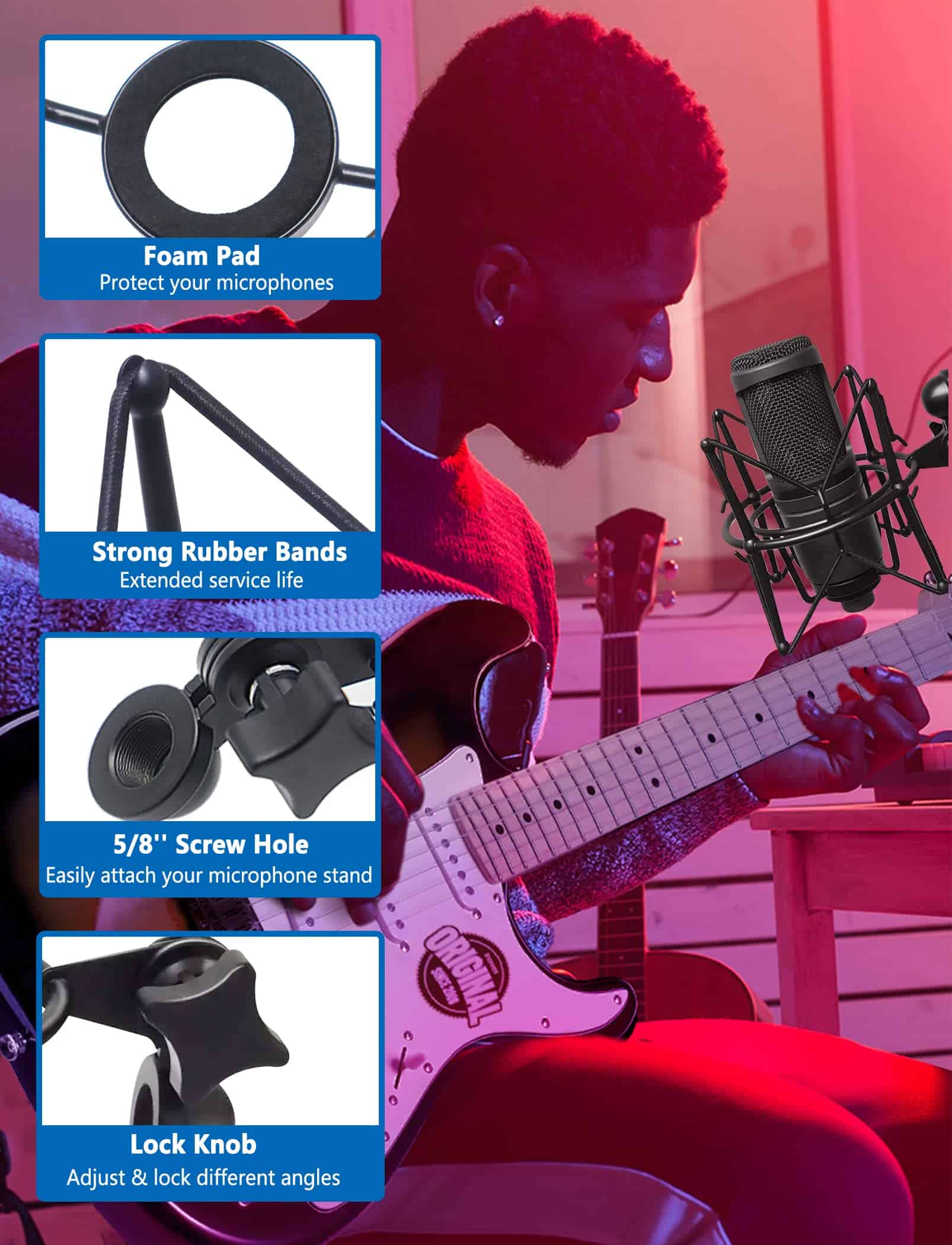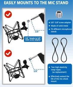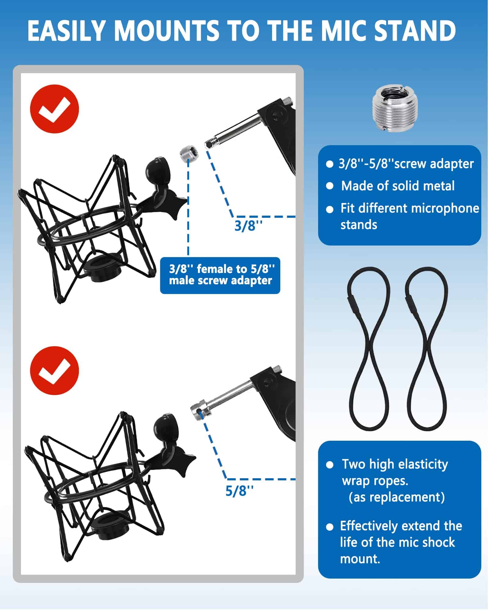 3. Ajustabilidad Cuenta con un perilla de bloqueo ajustable en ángulo, el soporte a prueba de golpes se puede ajustar en 180 , lo que es conveniente para varias direcciones de captación del micrófono. Y proporcionamos un adaptador de 5/8��-3/8��, que se puede conectar fácilmente a cualquier boom de micrófono o soporte.