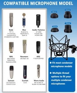 2. Gran Compatibilidad Nuestro soporte de choque para micrófono está equipado con 4 tornillos inferiores diferentes, lo que lo hace compatible con muchos micrófonos de condensador, como AT (2020, 2020USB); Rode (NT1-A, K2, NTK, NT2000, NT2-A, NT1000); Samson (C01, C03, C01U, C03U, CL7, CL8), Blue (Bird SL, Babybottle SL, Spark SL), MXL (990, 770, R77, TEMPO, V67G, Revelación, 2006); AKG (P120, P220, P420); y Neumann U87.