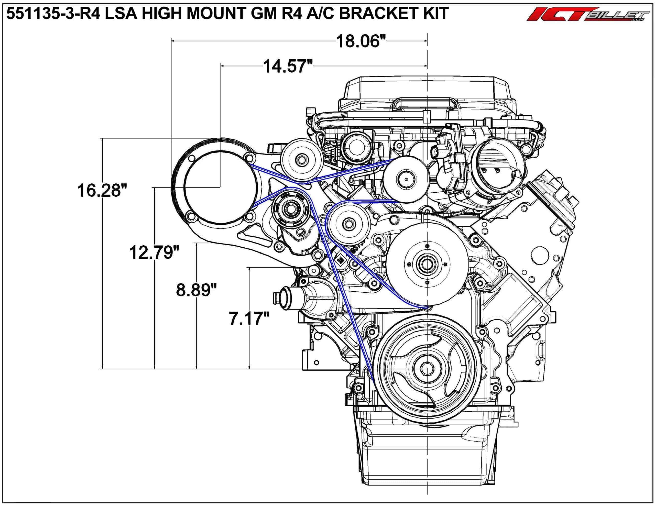 Este soporte de compresor de aire acondicionado de alta montaje ICT Billet LSA Supercharger es compatible con GM R4 CTS-V ZL1. Está fabricado en aluminio billet de alta resistencia y cuenta con un diseño universal para distintos espaciados de camiones. Ideal para LS3, LM7 y LS motores. Número de parte: 551135-3-R4.