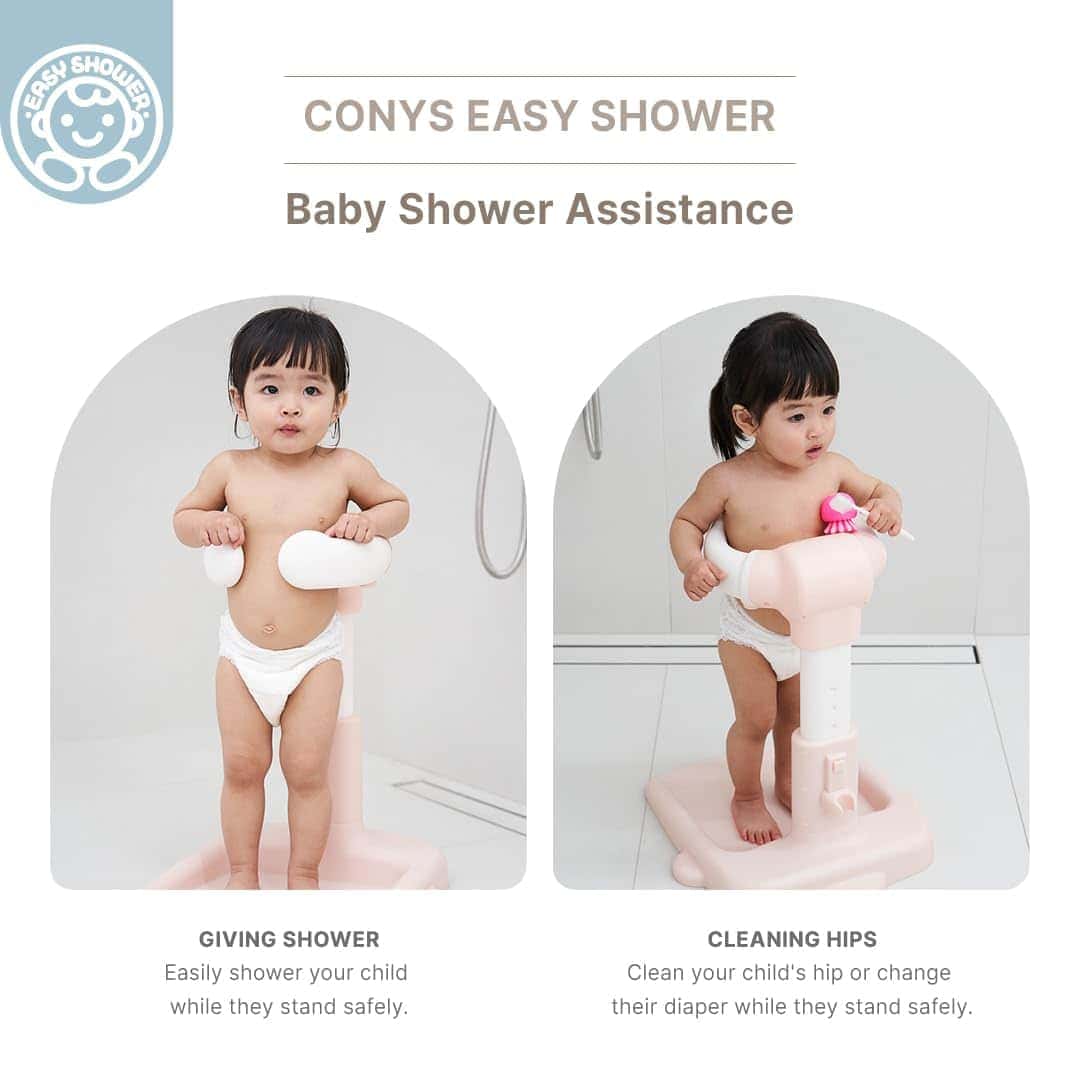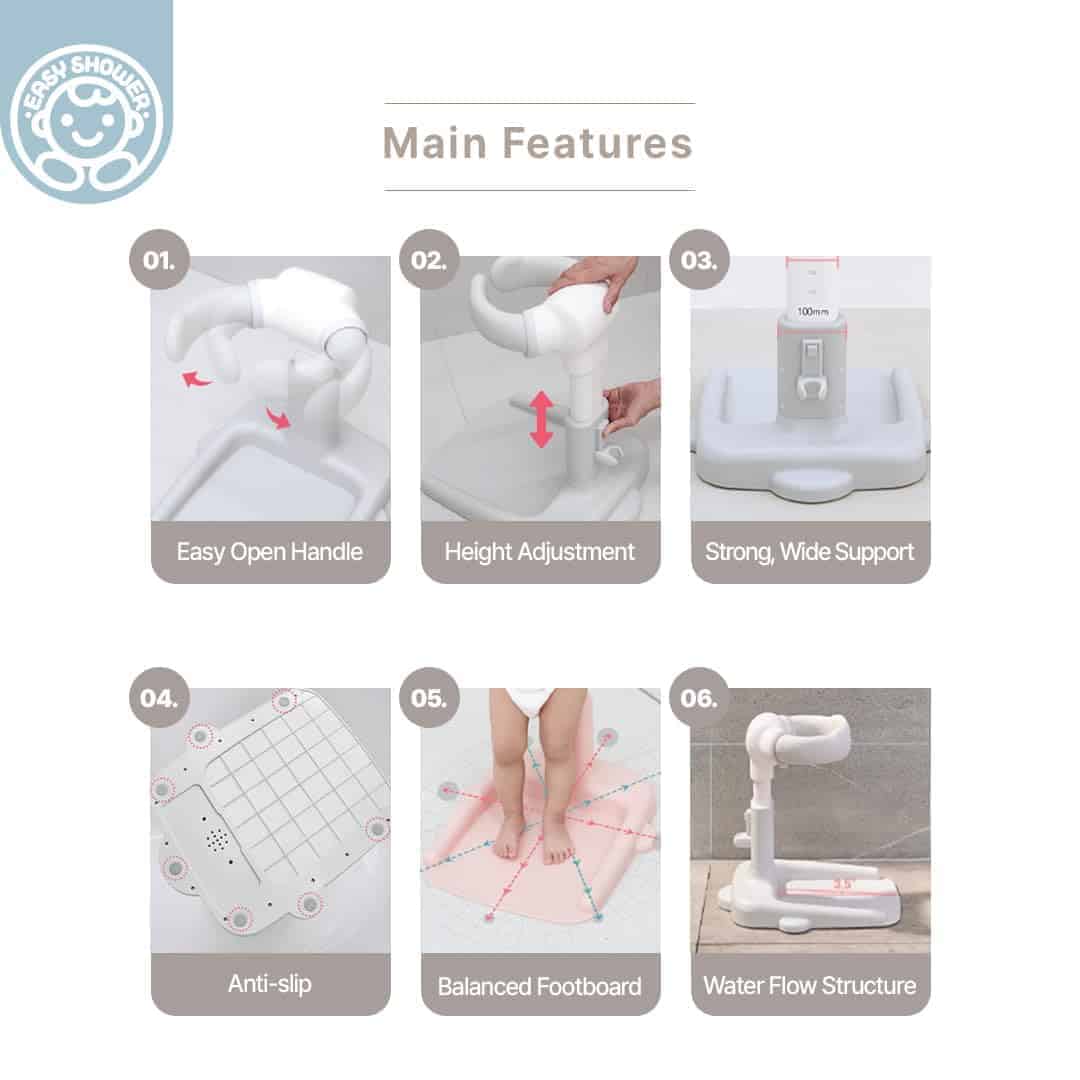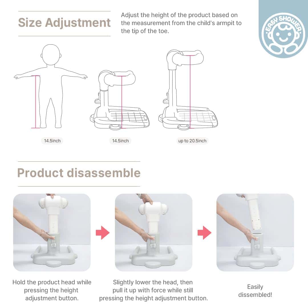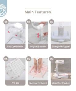 2. Ajustable para el Crecimiento: Diseñado para crecer con tu bebé, este soporte de ducha para bebé se ajusta suavemente para edades de 7 a 24 meses, asegurando comodidad y seguridad con su diseño sin pellizcos.