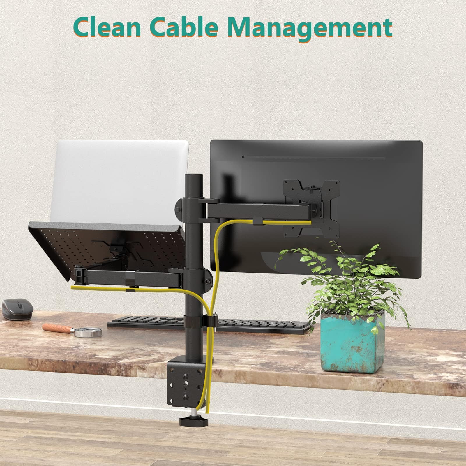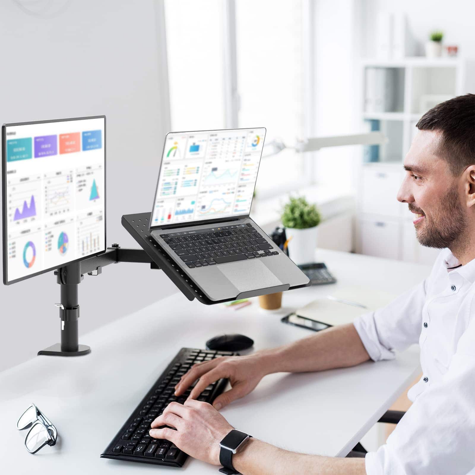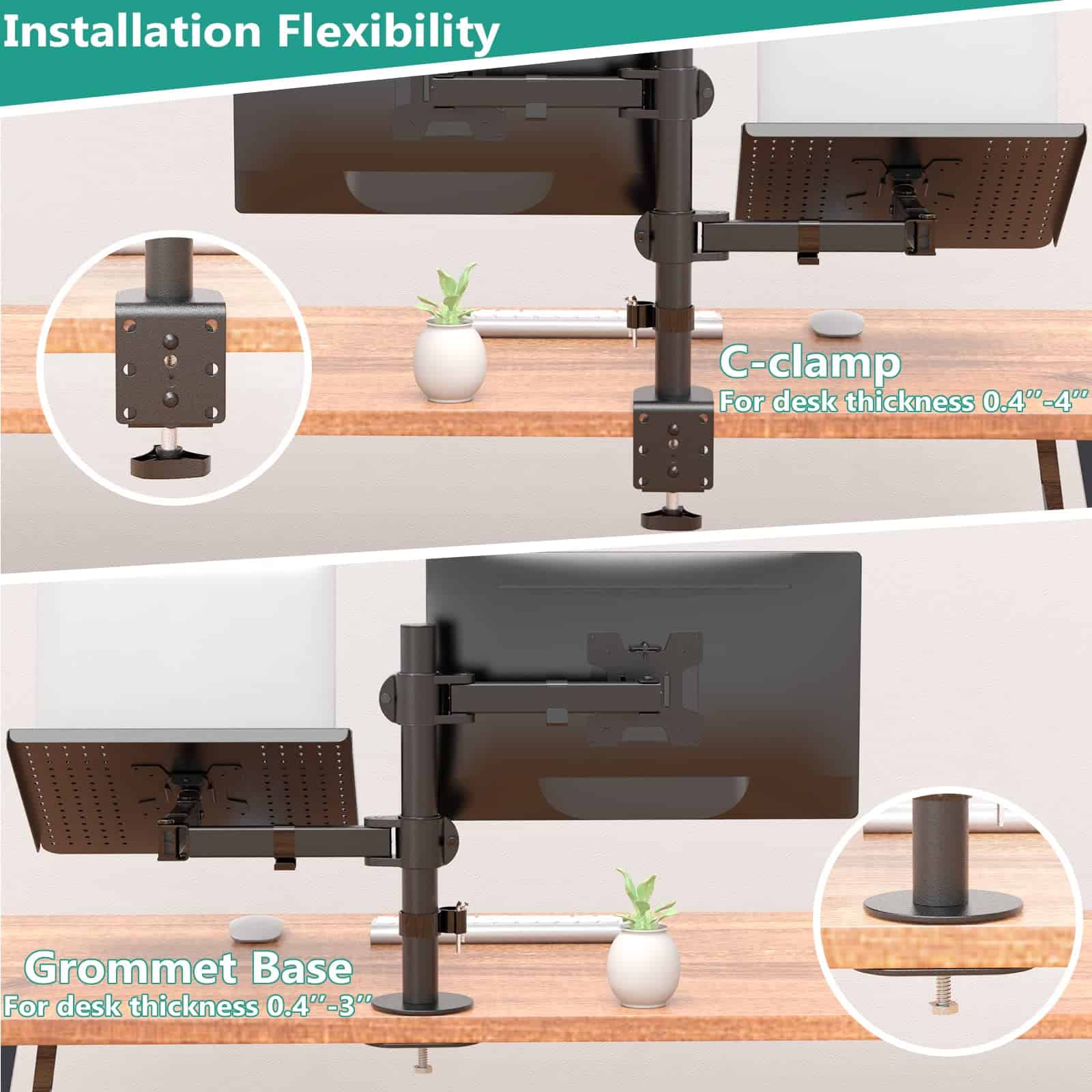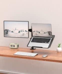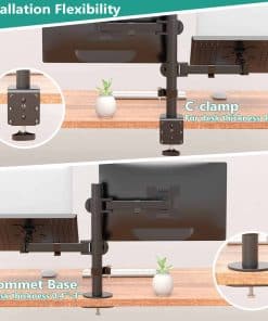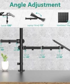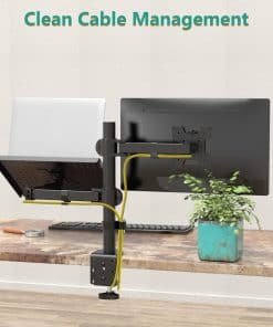 Por favor, comprueba la Lista de Montaje compatible: Se adapta: Una laptop o Notebook; Un monitor Tamaño de la laptop o Notebook: Hasta 17 Tamaño del monitor: Hasta 27 Capacidad de peso: Máximo 22 libras por brazo Tamaño de la bandeja para laptop: 14 x 11.75 pulgadas (L x W), labio inferior que sobresale en 0.6 pulgadas Tamaño VESA: 75×75 mm y 100×100 mm Dos sistemas de bloqueo: Abrazadera en C: Soporta máximo 4 de escrito Grommet-Base: Soporta máximo 4 agujero para cableado del escritorio de diámetro y 3 de escritorio grueso. Ajuste: Inclinación de +15 ~ -15 en la bandeja para laptop Inclinación de +90 ~ -90 en el brazo del monitor Giro de +90 ~ -90 360 de rotación Poste de altura de 16 Arriba y abajo de 0.8 ajustable en altura del monitor Beneficios: Liberar espacio en el escritorio para una nueva gama de posiciones de visualización adaptables. Usa la laptop y el escritorio al mismo tiempo sin cambiar de pantalla. Trabaja más cómodo con la posición ergonómicamente correcta para reducir la tensión en el cuello y los ojos. Incluye: Soporte de escritorio para monitor individual de WALI con bandeja para laptop (negro) x 1 Kit de hardware de montaje x 1 Manual del usuario x 1