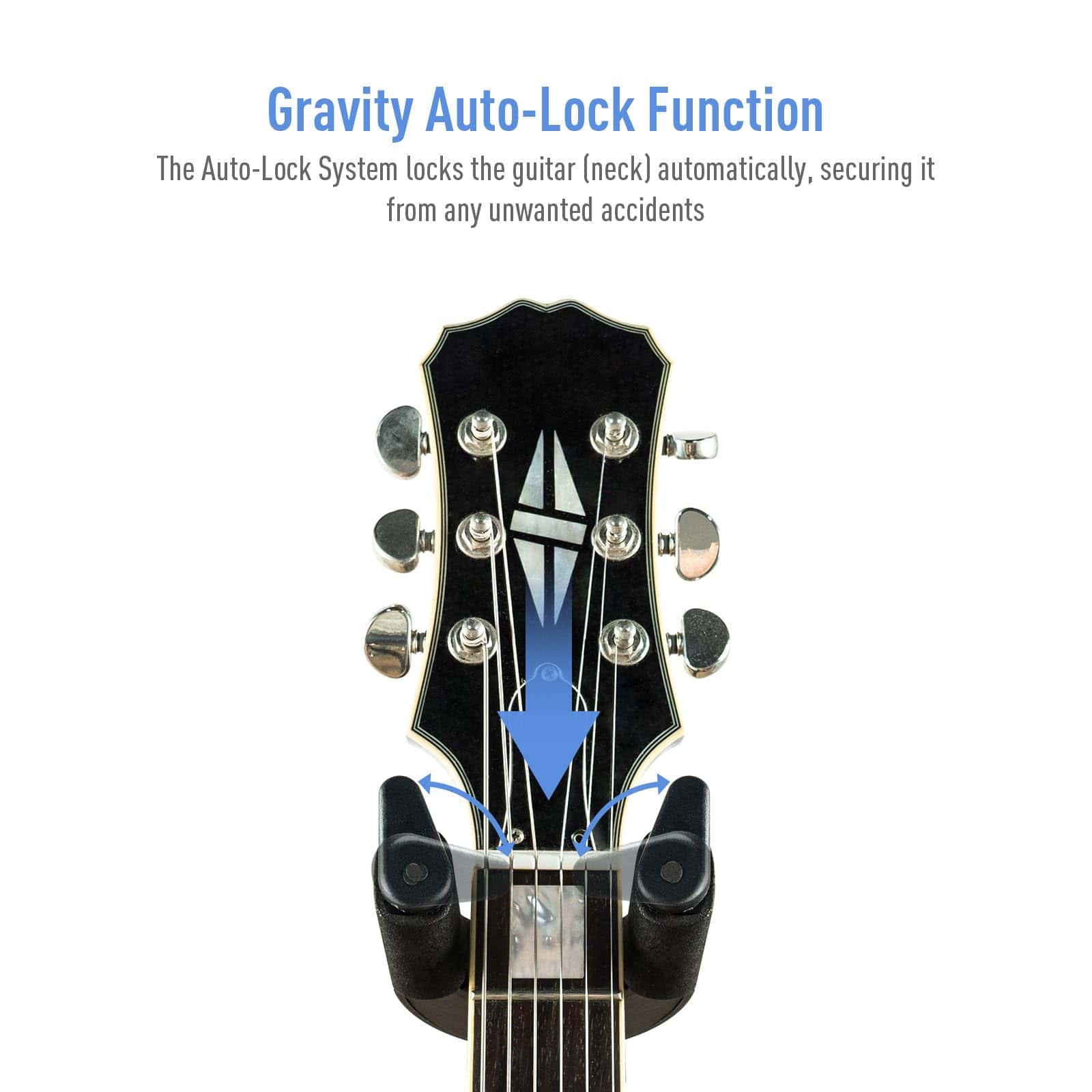 2. Función de Bloqueo por Gravedad Automático Bloquee su guitarra automáticamente al colocar el mástil de la guitarra en el brazo y libérelo al levantar su guitarra.