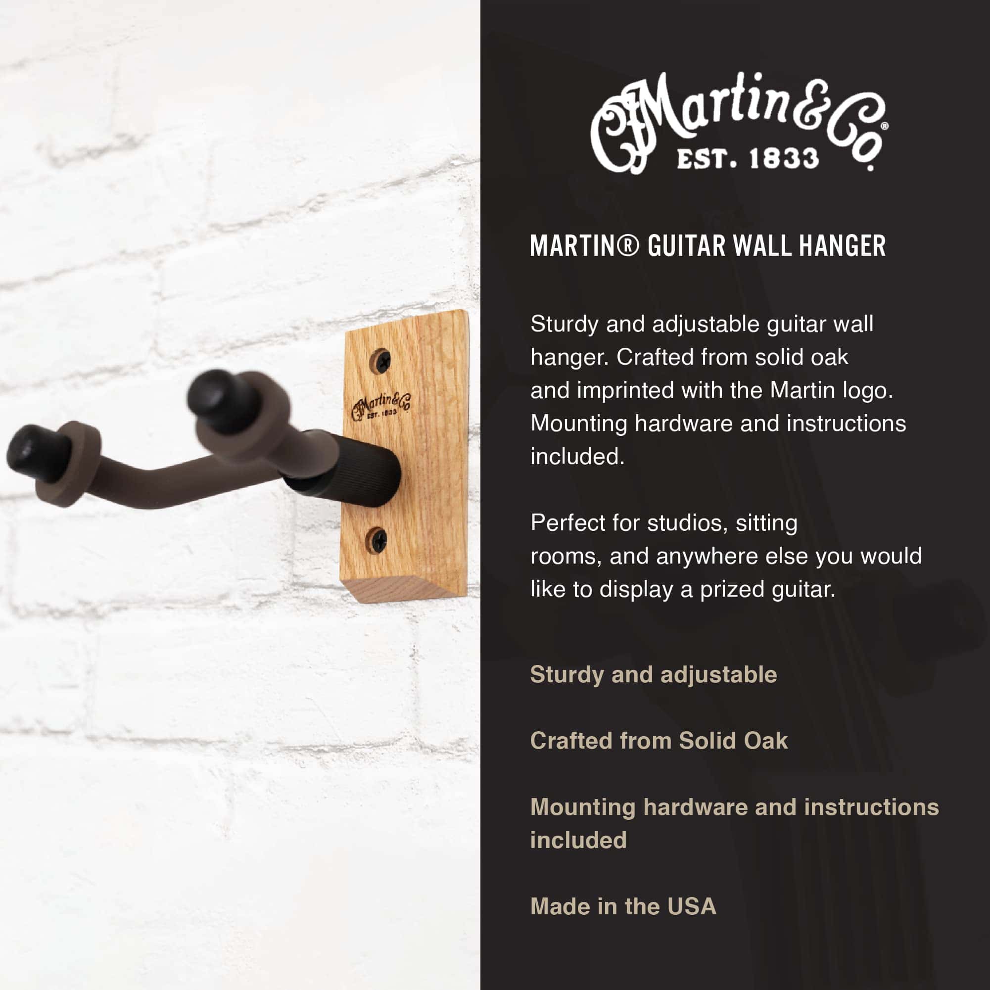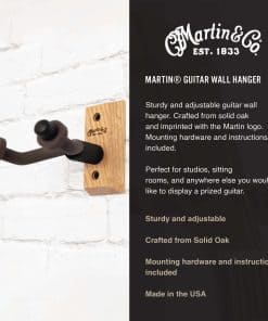 Soporte de pared para guitarra robusto y ajustable. Fabricado en roble macizo e impreso con el logo de Martin. Incluye hardware de montaje e instrucciones. Perfecto para estudios, salas de estar y cualquier otro lugar donde desees exhibir una guitarra valiosa.