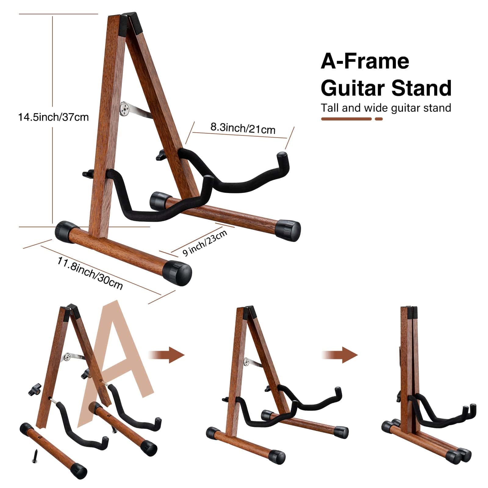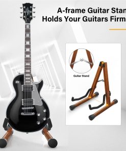 El soporte de guitarra LEKATO está hecho de madera dura real, es ligero y duradero. El diseño elegante lo convierte en una opción perfecta para ti, tus amigos y tu familia. Con protección acolchada de espuma, patas antideslizantes, estos detalles pueden proteger tus guitarras de daños, y la construcción en forma de A puede sostener tus instrumentos de forma segura, sin más preocupaciones sobre que las guitarras se caigan al suelo. Nuestras Ventajas: Adapta material de madera, hecho de madera dura resistente, te enamorarás de este soporte de guitarra plano a primera vista por su fascinante veta de madera natural. Combinado con clase y durabilidad, sería más un trabajo de arte que un soporte de guitarra. Se ajusta a todas las guitarras, el ancho del soporte de guitarra es ajustable, simplemente ajusta el ancho del soporte, podrás sostener guitarras de diferentes tamaños, ukelele, banjo, violonchelo, etc. Nos enfocamos en los detalles, hacemos todo lo posible para ofrecer el mejor soporte de guitarra a nuestros clientes. Ya sea el diseño de cierre seguro, el diseño de almohadilla de espuma o las patas antideslizantes, pueden proteger tus instrumentos de daños y arañazos al máximo. Fácil de instalar y almacenar: el soporte de guitarra de viaje es fácil de configurar en 5 minutos, se puede plegar y guardar fácilmente en el estuche de concierto. Especificaciones: Color: Negro Material: Madera dura real Tamaño: 14.5 pulgadas x 11.8 pulgadas x 8.3 pulgadas Peso: 810g Incluido en el paquete: 1 Tubo vertical 2 Tubos inferiores 2 Varillas de colocación 2 Tapas de tornillo 2 Tornillos 1 Llave