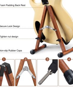 2. SEGURIDAD: El soporte de guitarra en forma de A, con bloqueo de seguridad y pies de goma antideslizantes, mantiene tu guitarra firmemente en el suelo sin deslizarse ni inclinarse. Cualquier contacto con la guitarra está cubierto con una almohadilla de algodón grueso para evitar rayones.