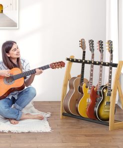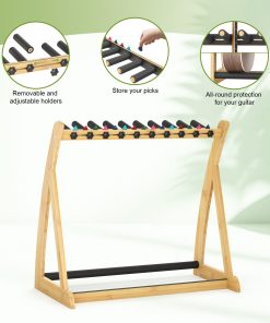 Mantenga sus guitarras eléctricas, acústicas y bajo organizadas y seguras con este soporte de guitarra de bambú. El soporte es plegable y ajustable para adaptarse perfectamente a sus necesidades. Cuenta con almohadillas antideslizantes sin arañazos para proteger sus instrumentos y estuche. Ideal para usar en casa, estudio o escenario.