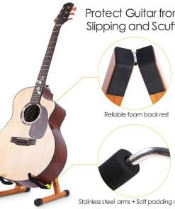 – Diseñado con un sistema de bloqueo seguro en forma de A y tapas de goma antideslizantes para mantener el soporte para guitarra firmemente en el suelo sin resbalar ni volcarse.