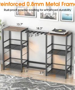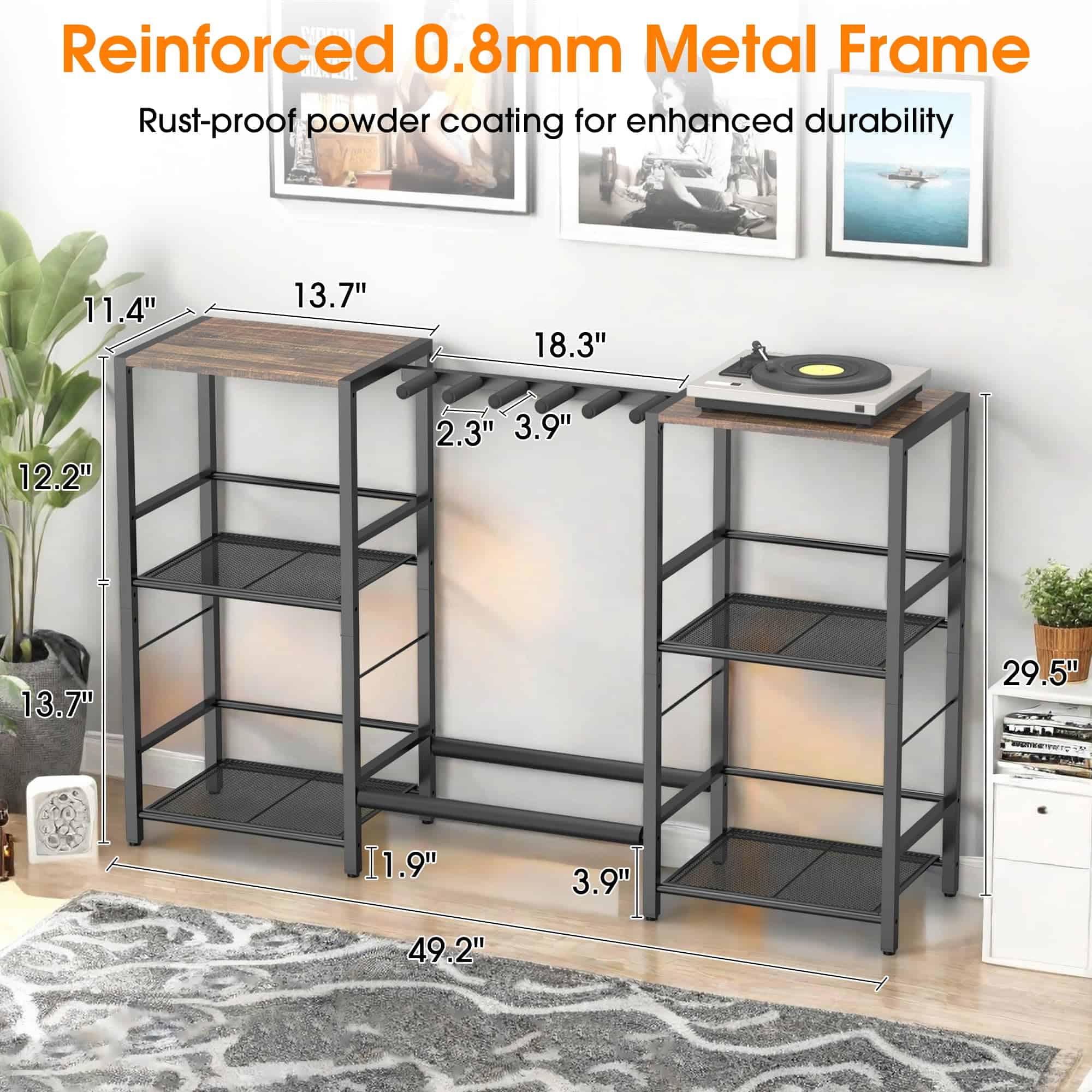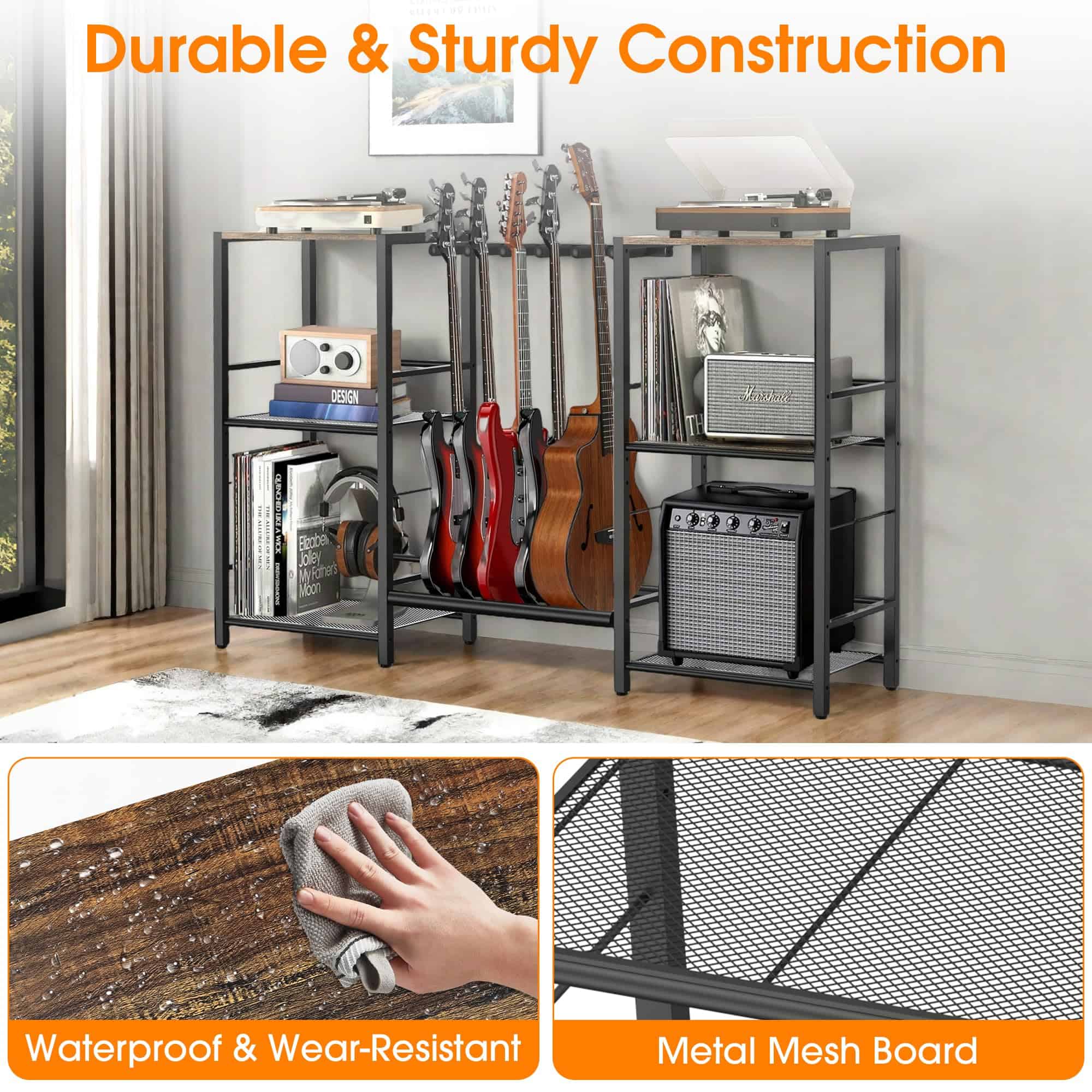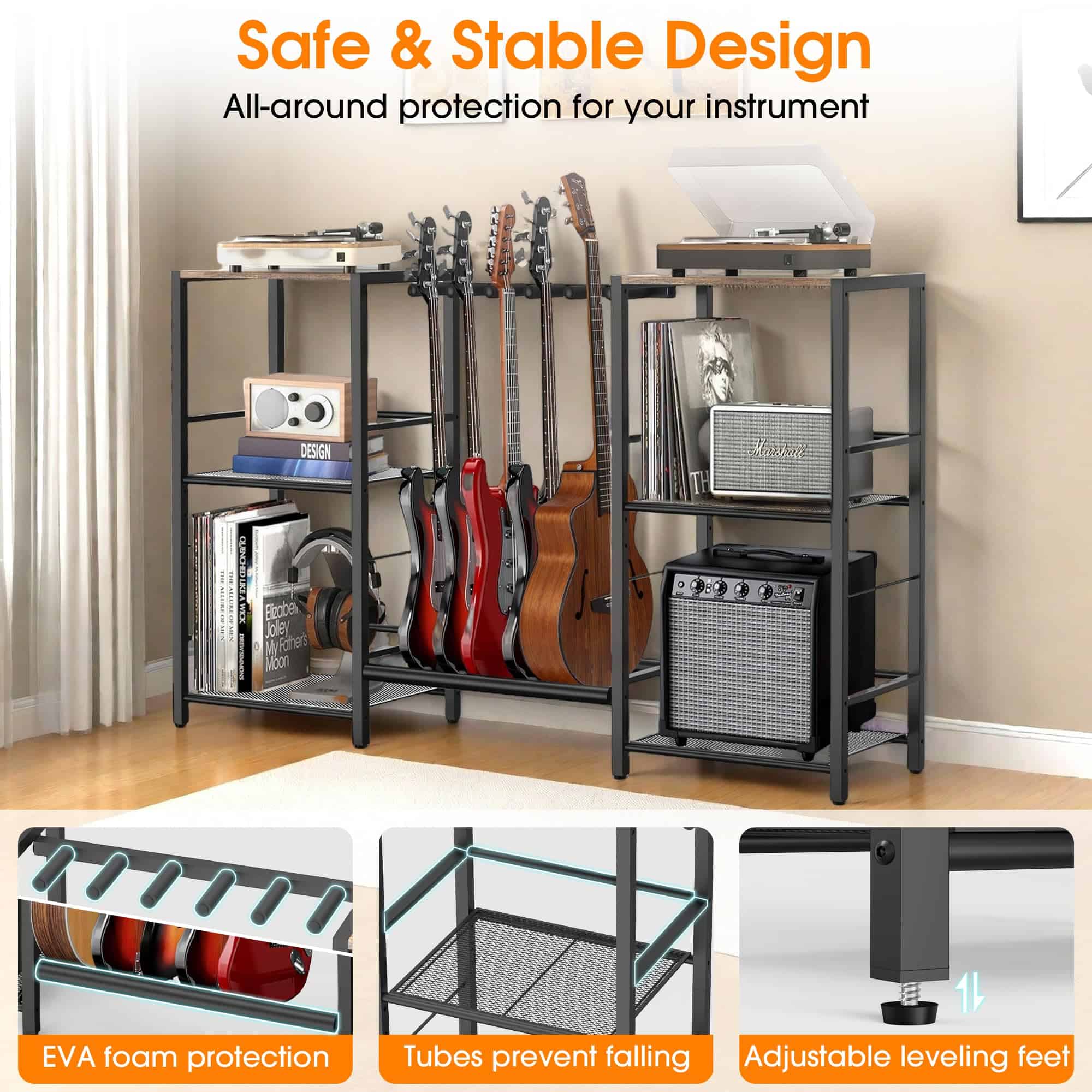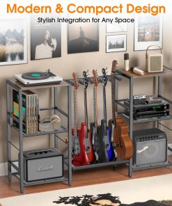 Este soporte de guitarra y amplificador HIXICOPA es la solución perfecta para mantener su equipo de música organizado y exhibido de manera elegante. Con un diseño moderno y compacto que combina madera y metal, este estante se integra perfectamente en configuraciones de estudio, interiores de hogares o espacios de música. Cuenta con 6 niveles que ofrecen un amplio espacio de almacenamiento para guitarras, tocadiscos, altavoces, discos de vinilo y otros accesorios. El estante de guitarra dedicado puede acomodar hasta 4 guitarras acústicas o 5 soportes de guitarra eléctrica, lo que lo convierte en una opción versátil para músicos y amantes de la música. La estructura de metal espesado garantiza un soporte resistente y duradero, mientras que la pintura horneada protege contra la oxidación. La protección de espuma EVA en los soportes de guitarra asegura que sus instrumentos estén protegidos contra arañazos, mientras que los pies antideslizantes y las barandillas en los niveles inferiores proporcionan estabilidad y seguridad adicionales. El montaje es sencillo y no requiere herramientas adicionales, con piezas preetiquetadas y instrucciones claras en inglés. Las superficies son fáciles de limpiar, con estantes de madera revestidos de melamina y niveles de malla de metal abierto que minimizan la acumulación de polvo. Mantenga su equipo de música organizado y protegido con este elegante soporte de guitarra y amplificador HIXICOPA.