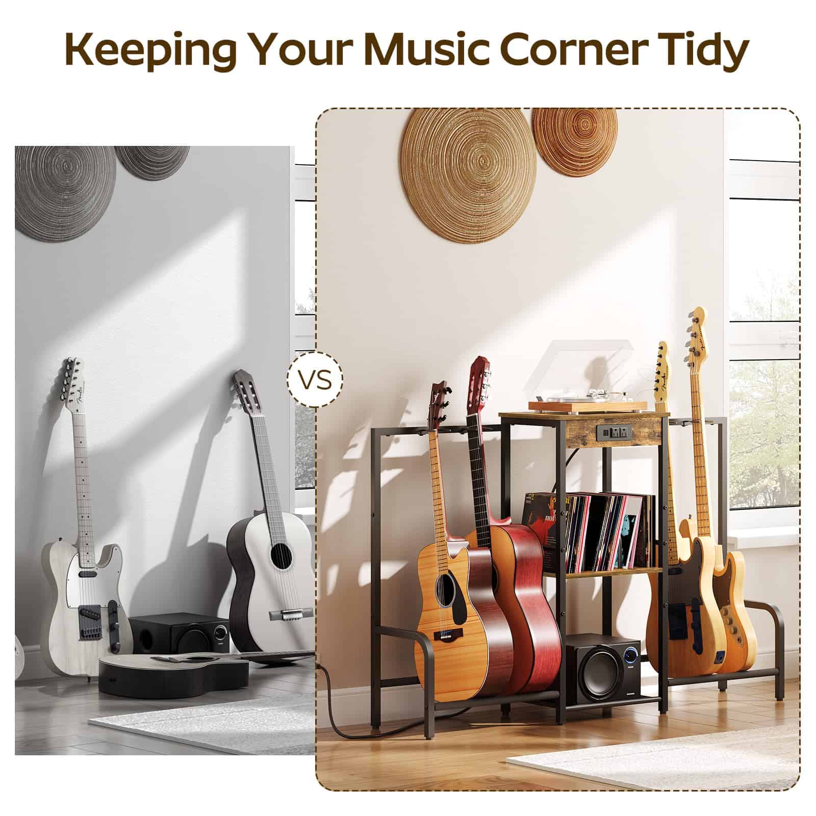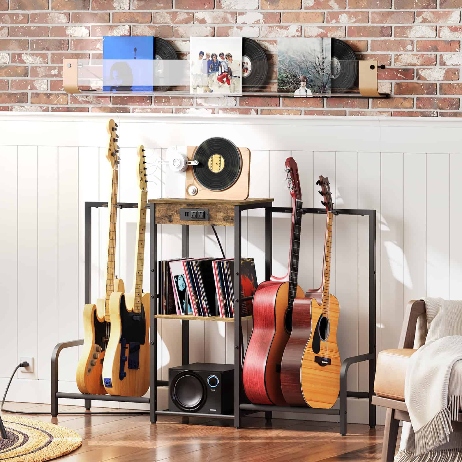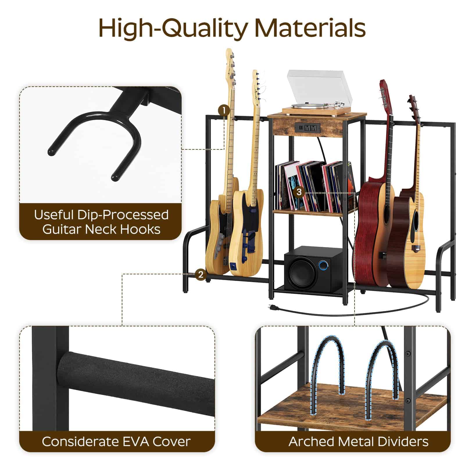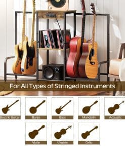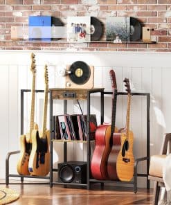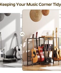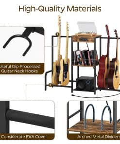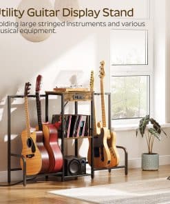 1. Soporte de Múltiples Guitarras: Este soporte de guitarra mide 49.2″L x 11.4″W x 32.3″H con 4 brazos de soporte para varios tipos de instrumentos de cuerda como guitarras acústicas, guitarras eléctricas y más. El espaciado preciso evita eficazmente la colisión de instrumentos. 2. Almacenamiento Todo en Uno: El soporte de guitarra cuenta con 3 estantes para un almacenamiento organizado de su tocadiscos, altavoces, etc. Los separadores arqueados ayudan a colocar partituras y discos de forma ordenada. No es solo un soporte, sino que también muestra la elegancia de su espacio musical. 3. Estación de Energía: El soporte de exhibición de guitarra tiene 2 tomas de corriente y 2 puertos USB para ofrecer un soporte de energía conveniente para sus instrumentos y dispositivos musicales. Le libera de las limitaciones de la colocación de enchufes de corriente, permitiendo un viaje musical sin restricciones. 4. Bien Hecho: Hecho de tablero de partículas premium y un resistente marco metálico, este soporte de guitarra es duradero y puede soportar mucho peso. Los brazos de soporte están tratados con un proceso de inmersión único, y los soportes inferiores están envueltos con tubos de EVA para evitar arañazos. 5. Accesorios Completos: Este soporte de guitarra múltiple viene con accesorios etiquetados e instrucciones detalladas, por lo que solo tiene que seguir los pasos para un montaje fácil. También está equipado con pies ajustables y un kit antivuelco para garantizar equilibrio y estabilidad.