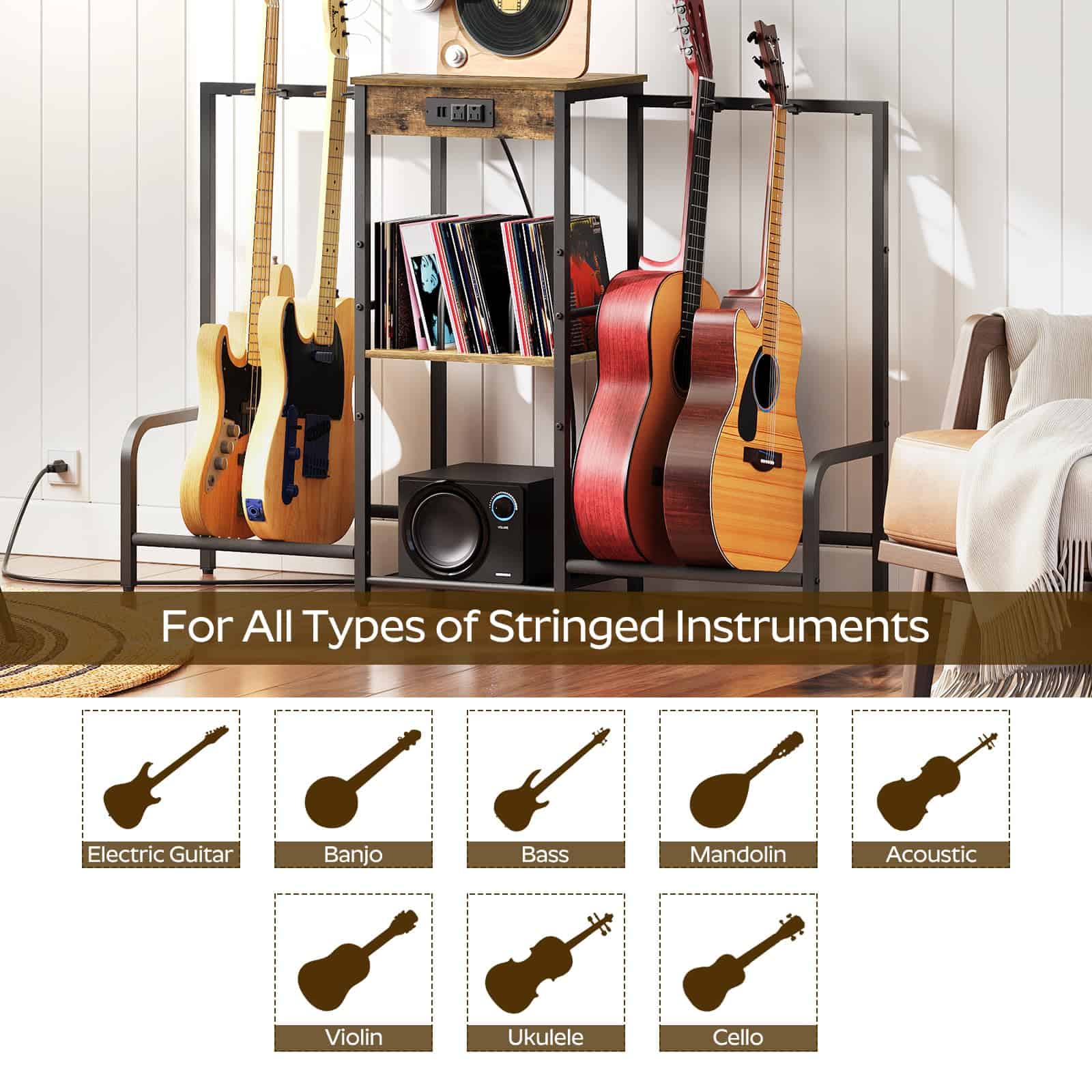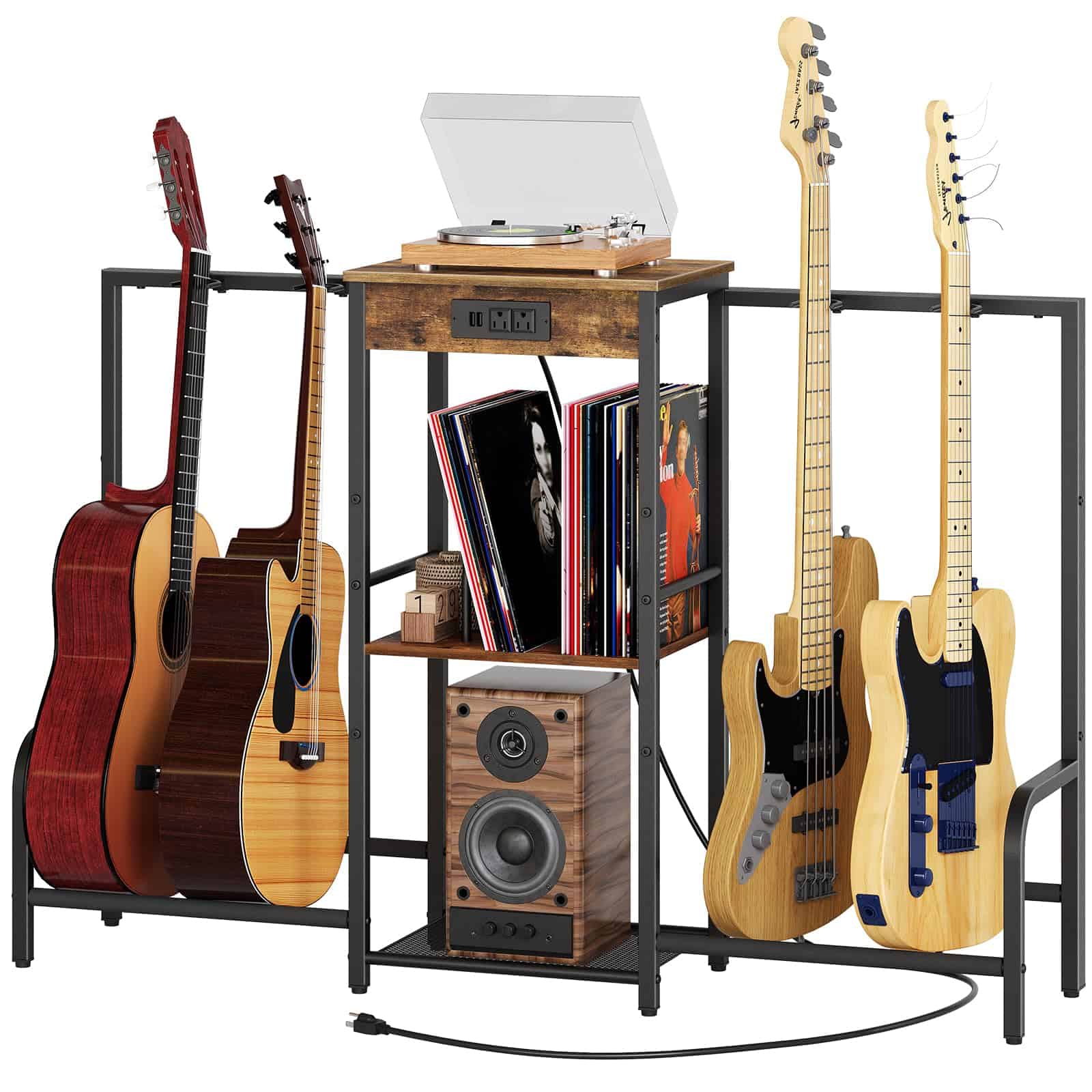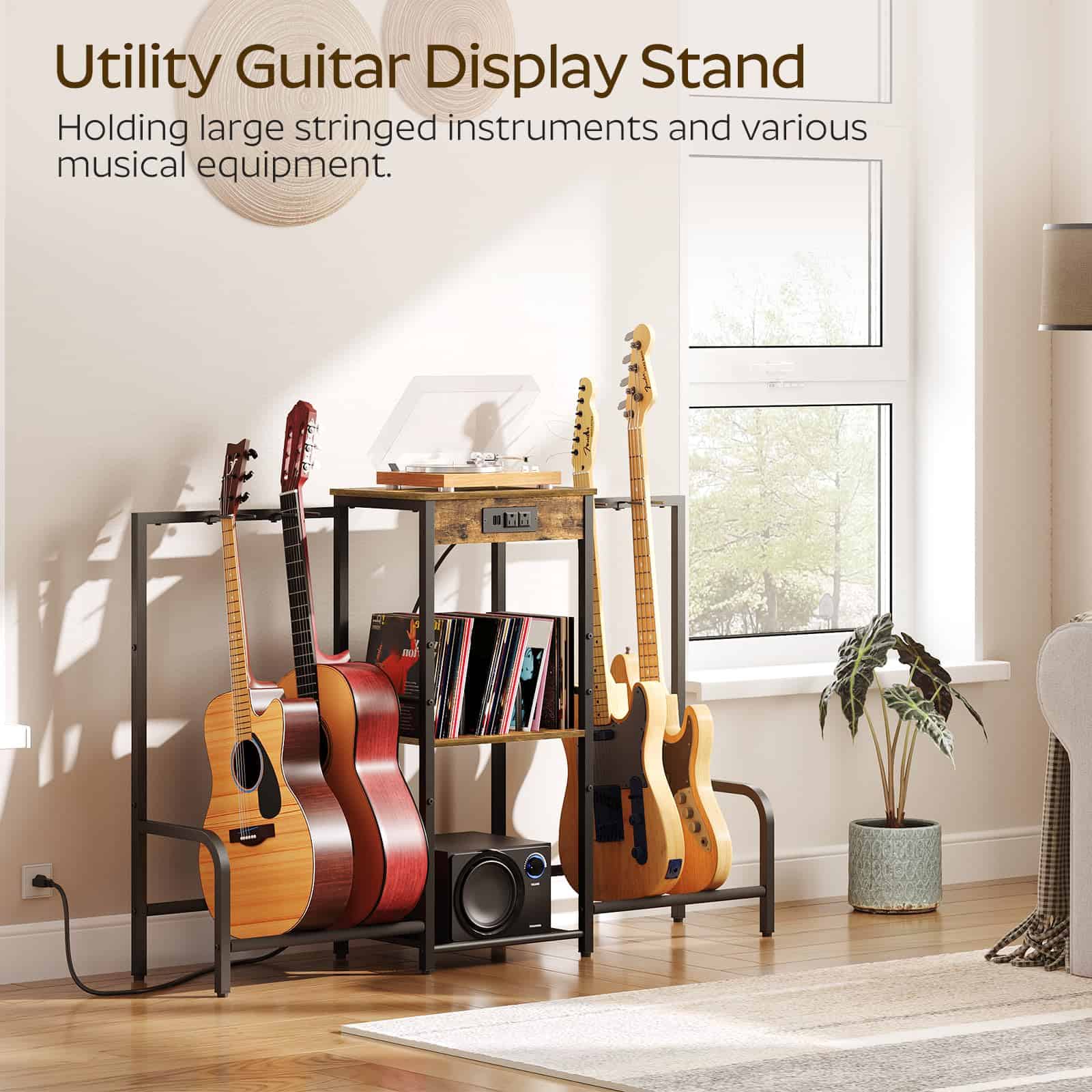 1. Soporte de Múltiples Guitarras: Este soporte de guitarra mide 49.2″L x 11.4″W x 32.3″H con 4 brazos de soporte para varios tipos de instrumentos de cuerda como guitarras acústicas, guitarras eléctricas y más. El espaciado preciso evita eficazmente la colisión de instrumentos. 2. Almacenamiento Todo en Uno: El soporte de guitarra cuenta con 3 estantes para un almacenamiento organizado de su tocadiscos, altavoces, etc. Los separadores arqueados ayudan a colocar partituras y discos de forma ordenada. No es solo un soporte, sino que también muestra la elegancia de su espacio musical. 3. Estación de Energía: El soporte de exhibición de guitarra tiene 2 tomas de corriente y 2 puertos USB para ofrecer un soporte de energía conveniente para sus instrumentos y dispositivos musicales. Le libera de las limitaciones de la colocación de enchufes de corriente, permitiendo un viaje musical sin restricciones. 4. Bien Hecho: Hecho de tablero de partículas premium y un resistente marco metálico, este soporte de guitarra es duradero y puede soportar mucho peso. Los brazos de soporte están tratados con un proceso de inmersión único, y los soportes inferiores están envueltos con tubos de EVA para evitar arañazos. 5. Accesorios Completos: Este soporte de guitarra múltiple viene con accesorios etiquetados e instrucciones detalladas, por lo que solo tiene que seguir los pasos para un montaje fácil. También está equipado con pies ajustables y un kit antivuelco para garantizar equilibrio y estabilidad.