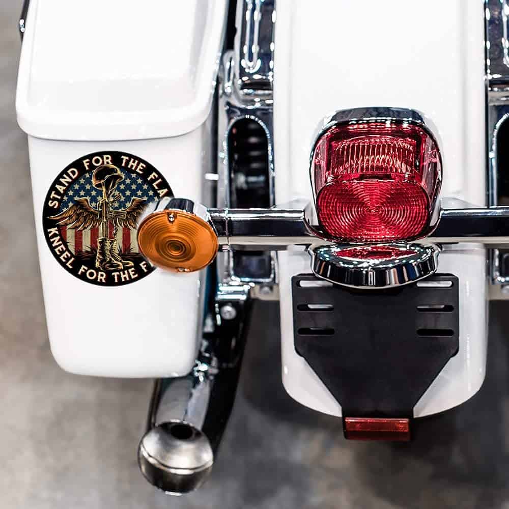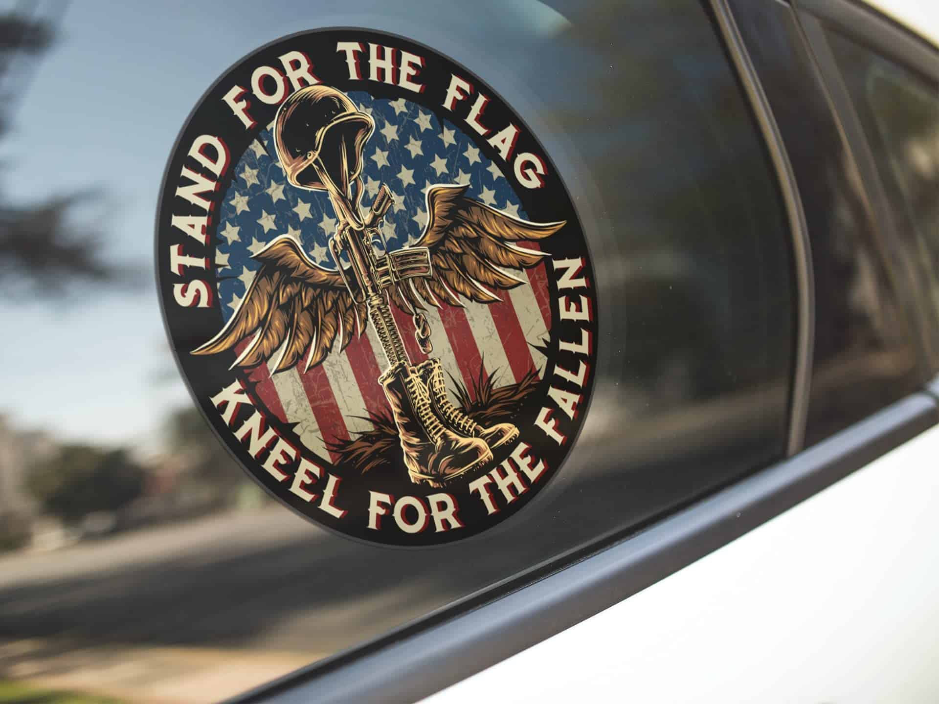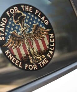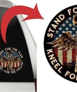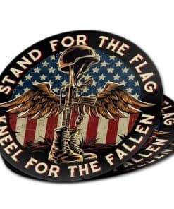 Decore su vehículo o dispositivo con esta calcomanía patriótica de 7 pulgadas que muestra una imagen conmovedora de la Cruz de Batalla con la frase ‘La Bandera Arrodíllate para Los Caídos’. Este paquete contiene 10 calcomanías en colores vibrantes que son ideales para mostrar su apoyo a los veteranos y a las fuerzas armadas.