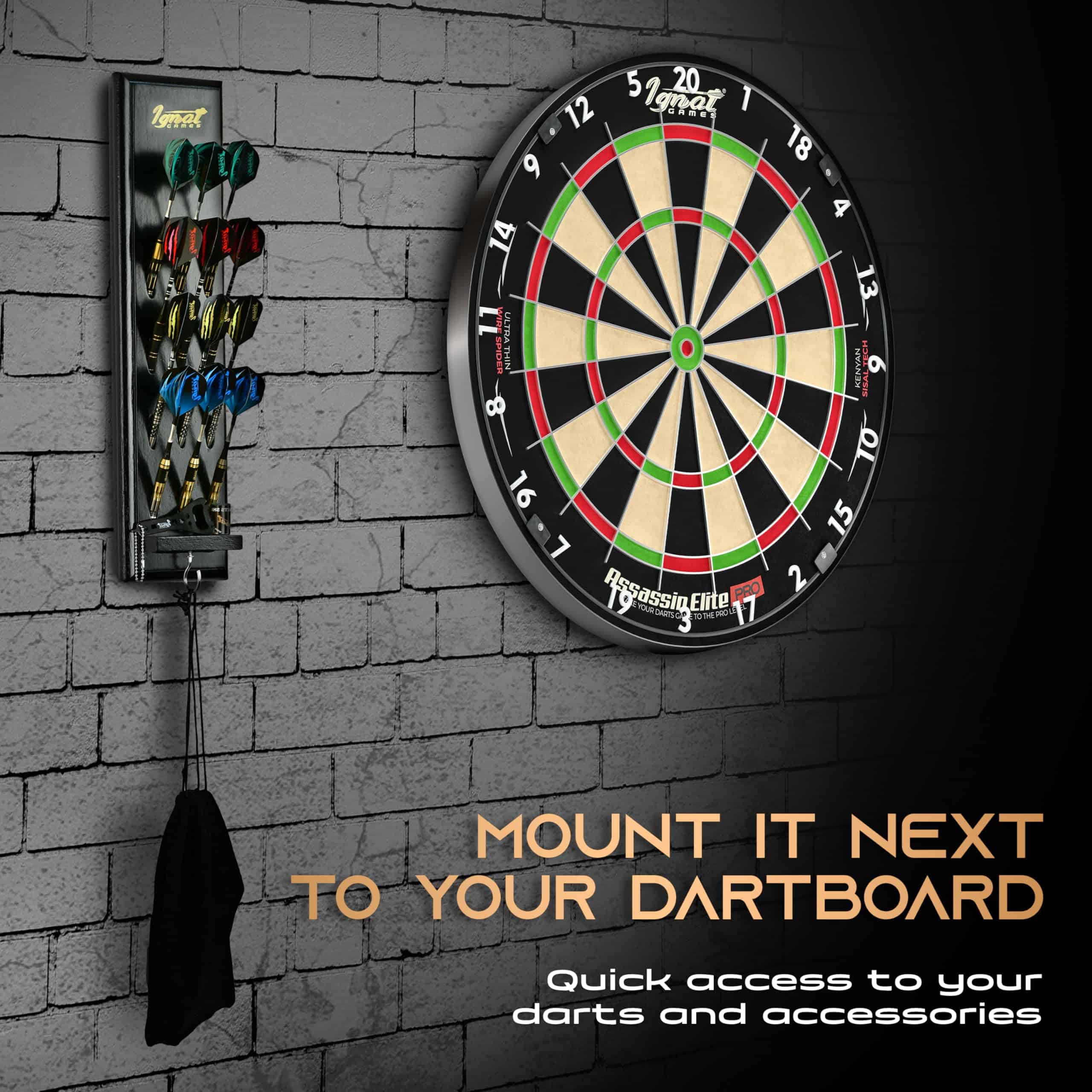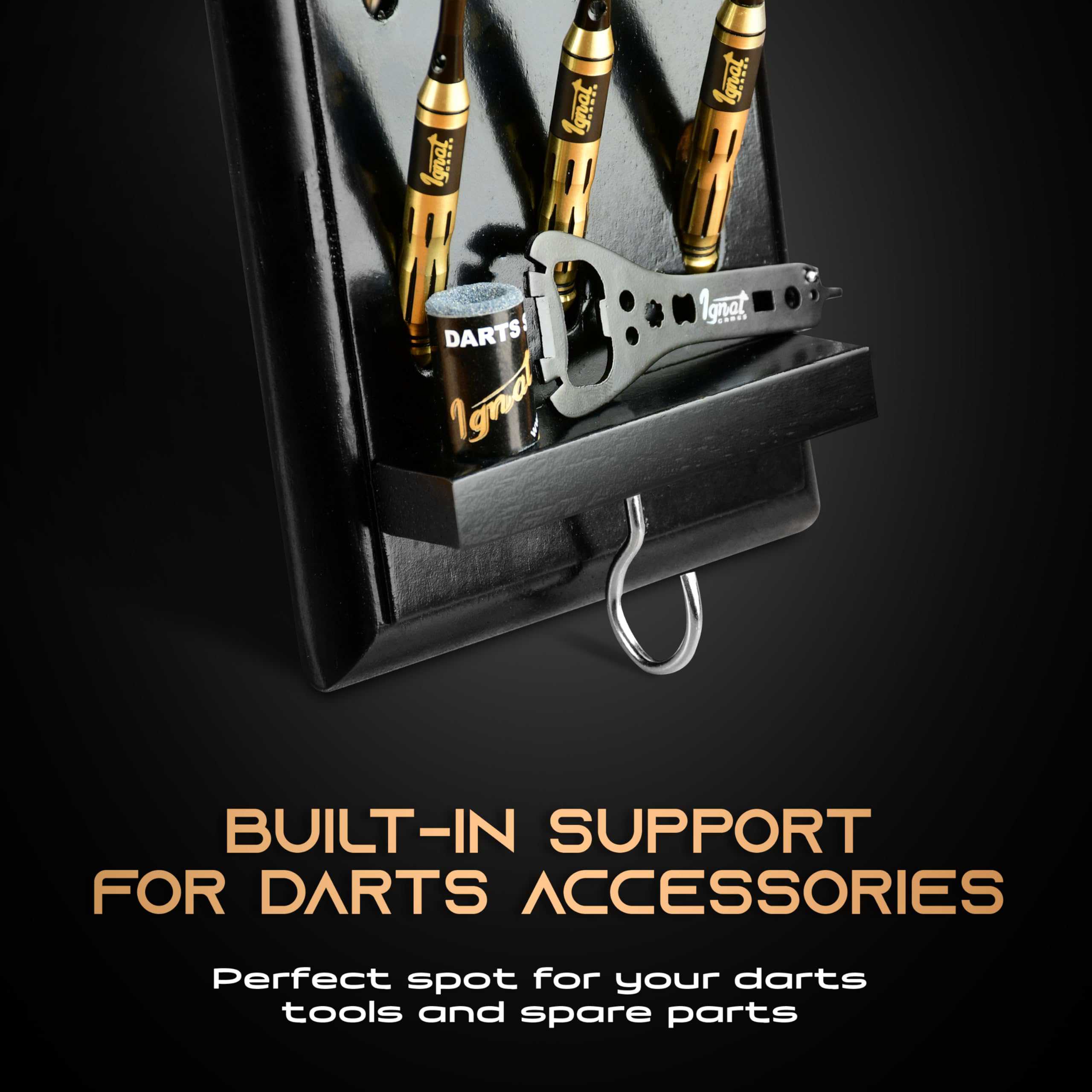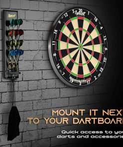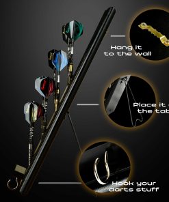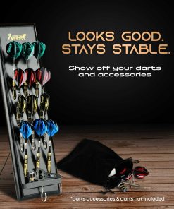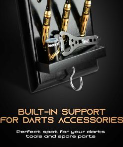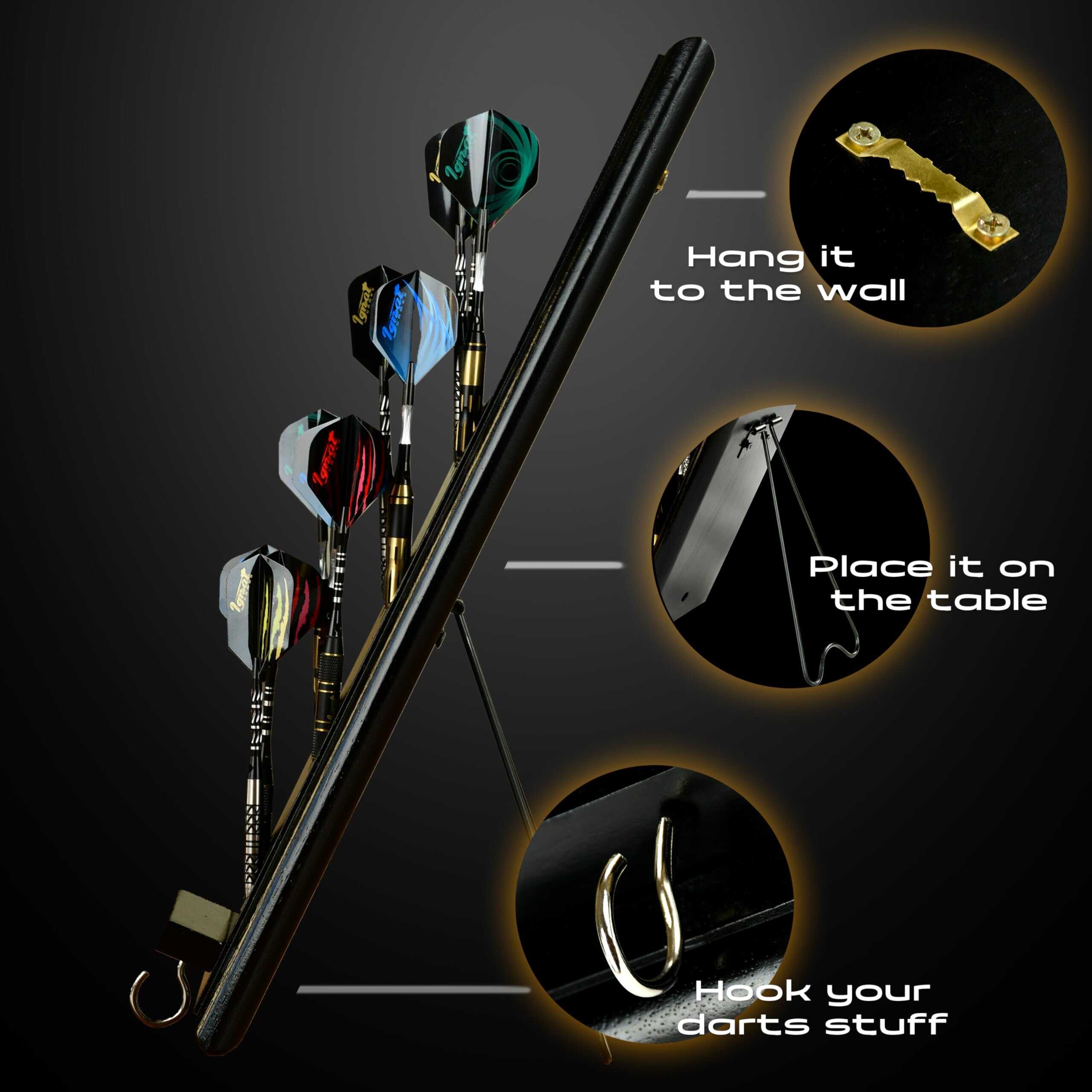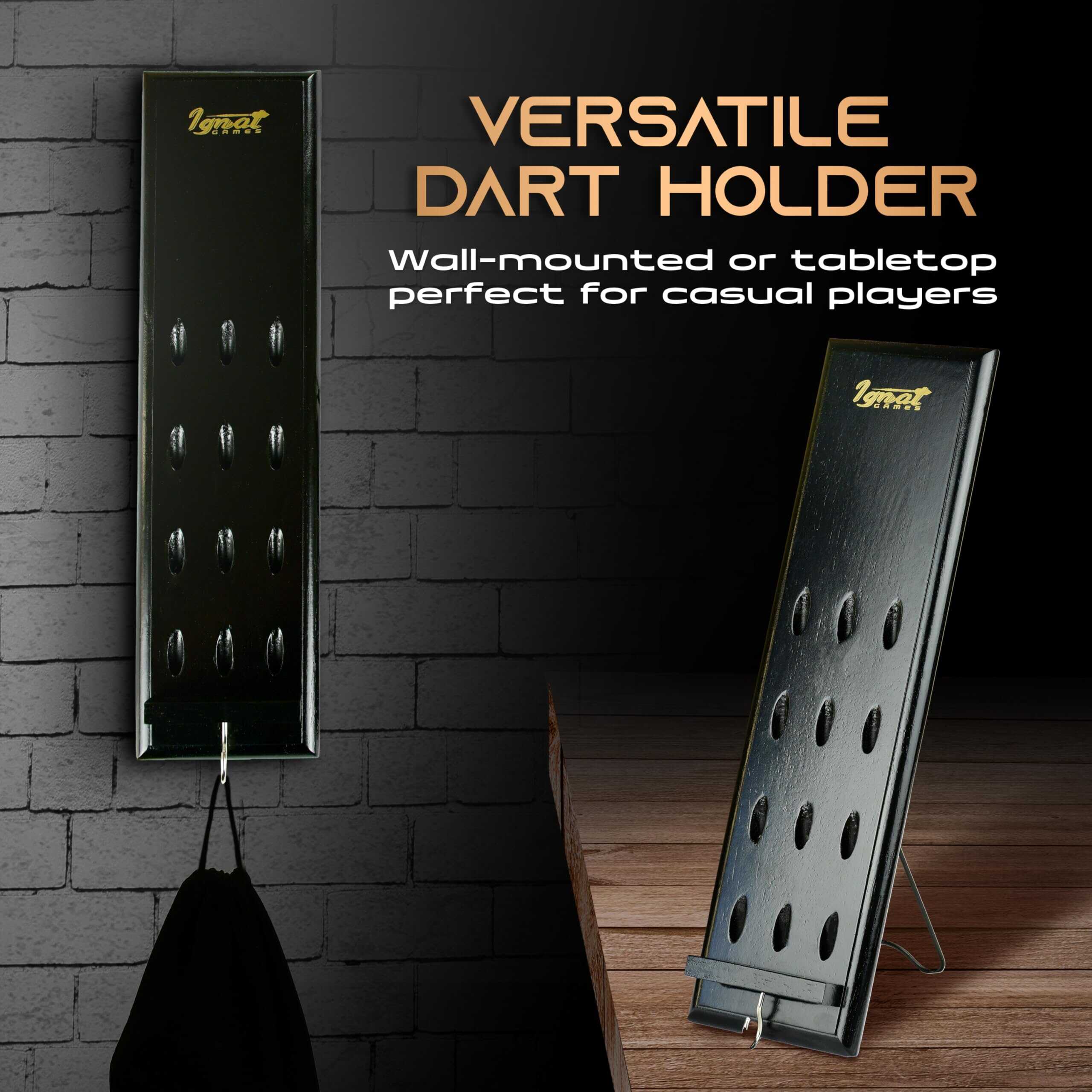 Soporte de Madera para Dardos de IgnatGames – Exhibidor para 12 dardos de punta de acero o punta suave, Soporte de Dardos de Montaje en Pared con Soporte Inteligente y Bandeja de Accesorios. Este versátil soporte de dardos te permite colocarlo en cualquier lugar: cuelga este estante de dardos en la pared o colócalo en la mesa usando su soporte de exhibición de metal original y mantén tus dardos al alcance fácil. Mantén tus accesorios a mano con la práctica bandeja de accesorios incluida. La construcción resistente de este soporte de dardos de madera maciza te ofrece un soporte de metal robusto para superficies planas, un gancho para accesorios y un montaje duradero para cualquier tipo de pared. Decora tu área de juego con este soporte de estante de dardos de 15.7″ x 4.3″ que se adapta a cualquier entorno. Coloca el soporte de dardos junto a tu tablero de dardos y simplifica tu juego. También protege tus dardos fácilmente con este exhibidor de dardos que cabe 12 dardos de punta de acero o punta suave, además de sus accesorios. Colocado en la mesa o en la pared, mantiene los dardos seguros de arañazos o dobleces. ¡Dardos y accesorios no incluidos!