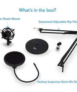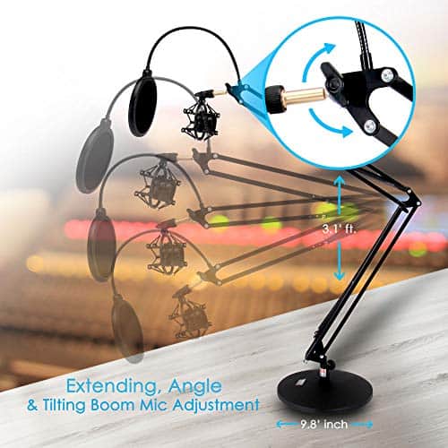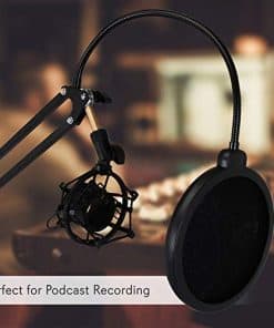 Contenido del Paquete: Soporte de Micrófono de Brazo en Suspensión Cuello de Cisne Ajustable Filtro Pop Antivibración de Choque de Micrófono (2) Clips de Micrófono