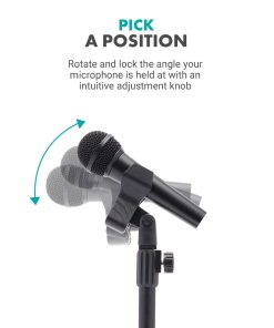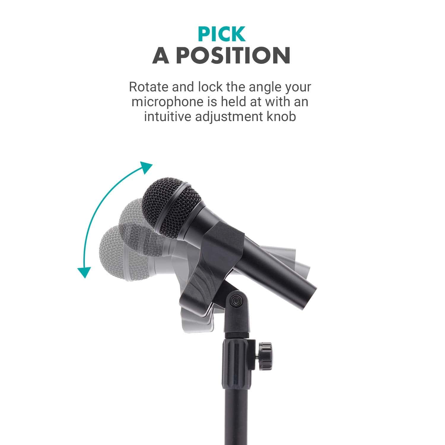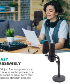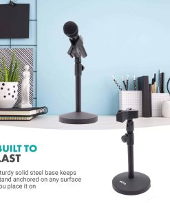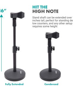 Soporte de micrófono de escritorio Movo TMC-5 de alta resistencia con base redonda ponderada y soporte de micrófono para escritorio. Este soporte de micrófono de escritorio ajustable tiene una altura predeterminada de 11 pulgadas, pero se puede extender hasta 16 pulgadas de altura para adaptarse a tus necesidades. La construcción sólida de metal garantiza que tu micrófono permanezca exactamente donde lo coloques. No te preocupes por problemas técnicos, ya que viene con una garantía de 1 año y un equipo de soporte amigable con sede en EE. UU. Si trabajas desde casa, este soporte es esencial para garantizar un audio perfecto durante reuniones remotas y transmisiones en vivo. El paquete incluye el soporte de micrófono de metal, placa base y soporte de micrófono de plástico para mayor comodidad.