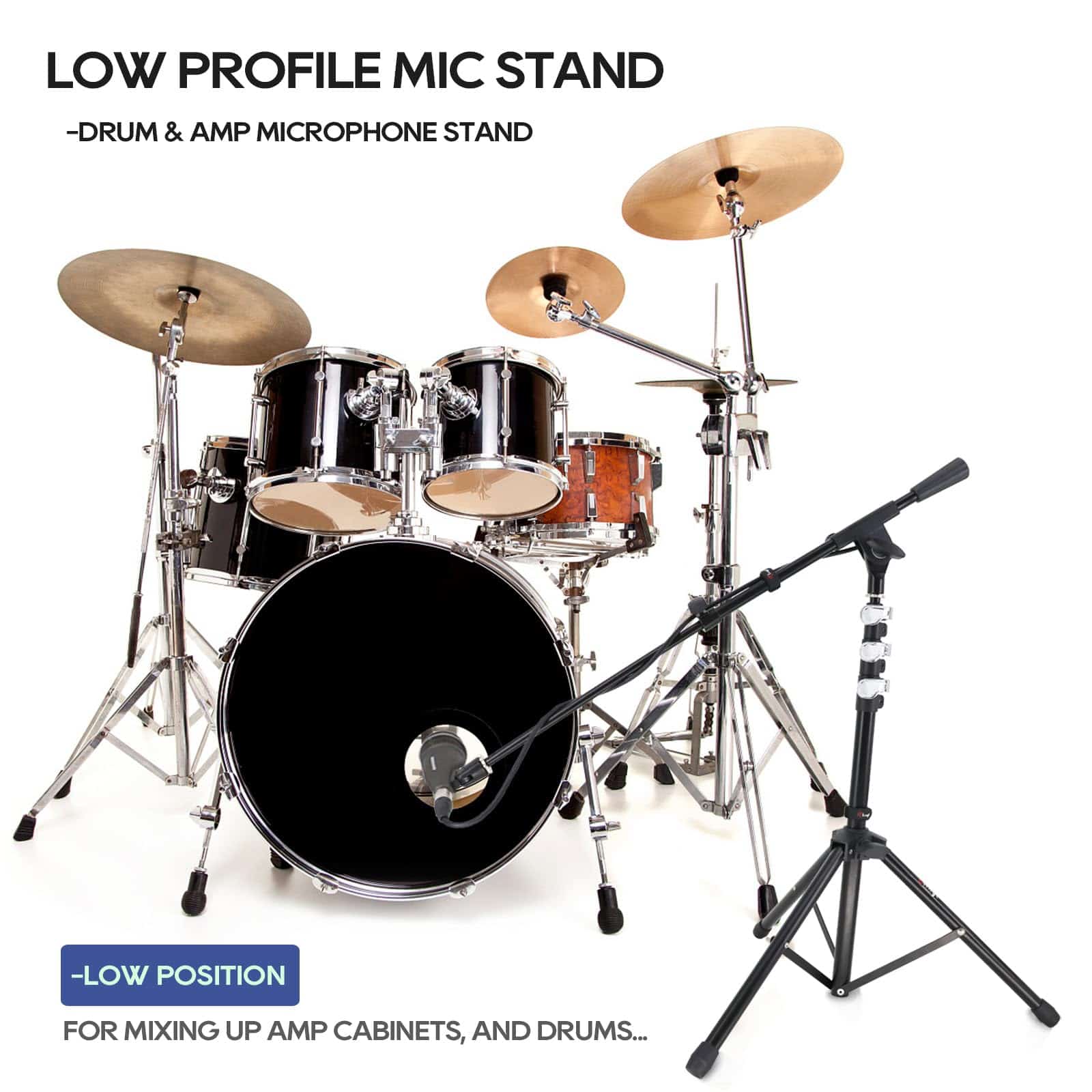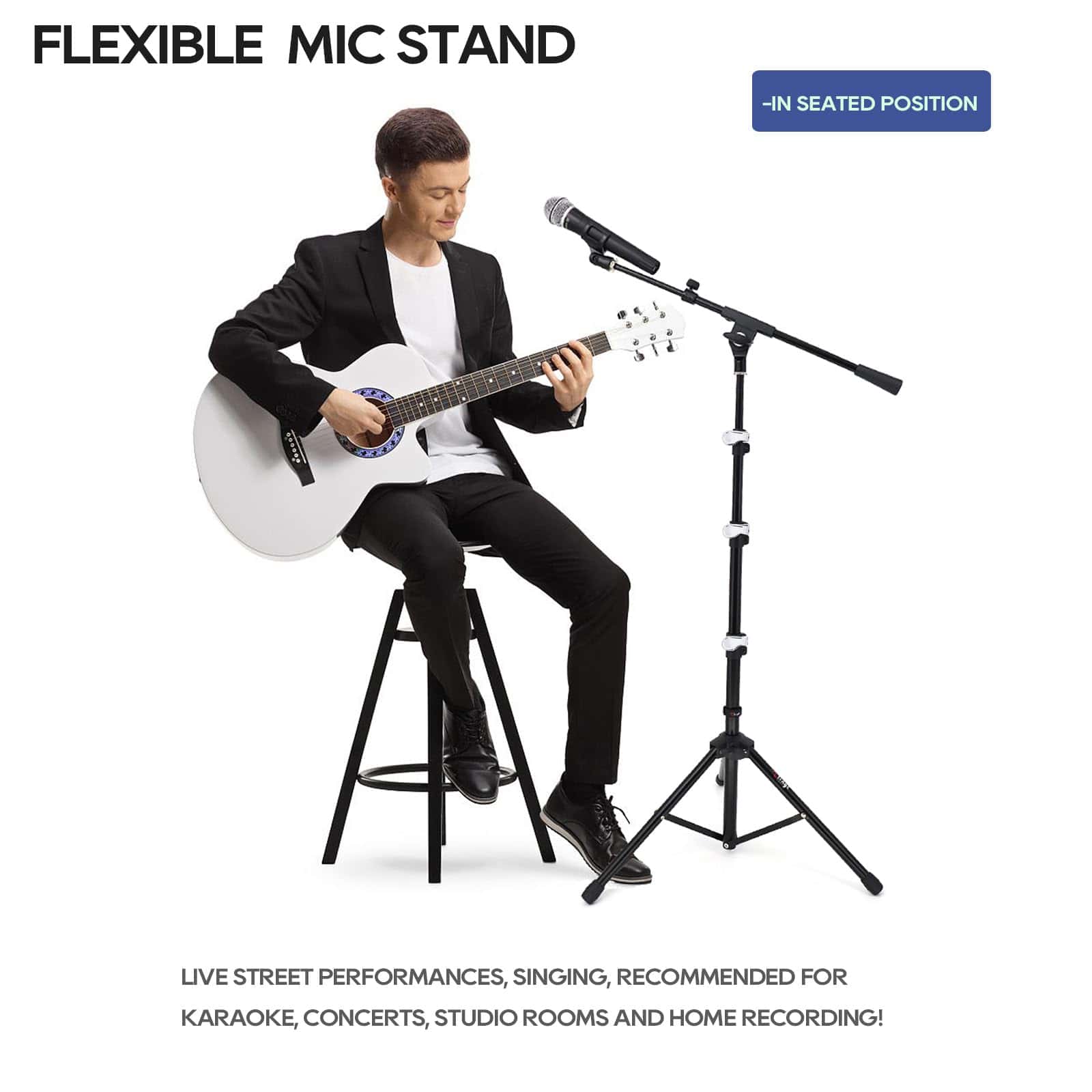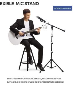 4. ALTURAS AJUSTABLES Los 3 tramos del eje de este soporte de micrófono portátil permiten una variedad de alturas, que van desde la altura de pie para cantar o hablar hasta la altura sentada para tocar un instrumento.
