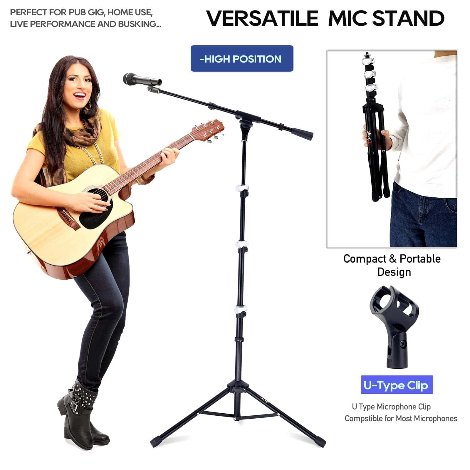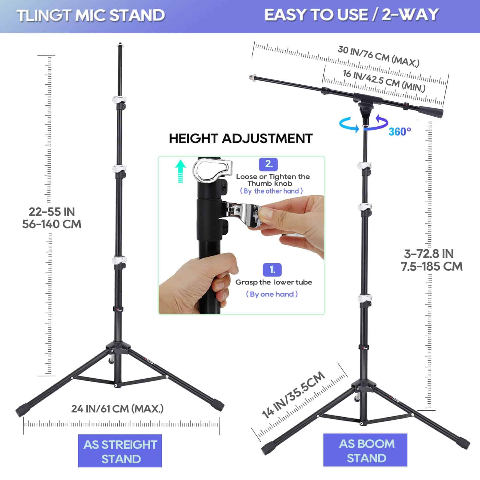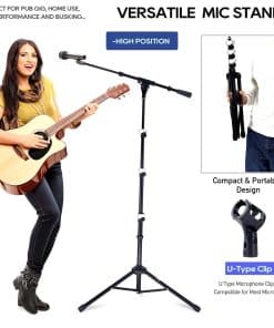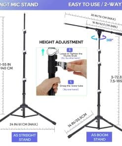 2. DISEÑO VERSÁTIL Soporte de micrófono de trípode compacto con brazo de pluma que también se puede utilizar como soporte de micrófono recto al quitar el brazo de pluma.