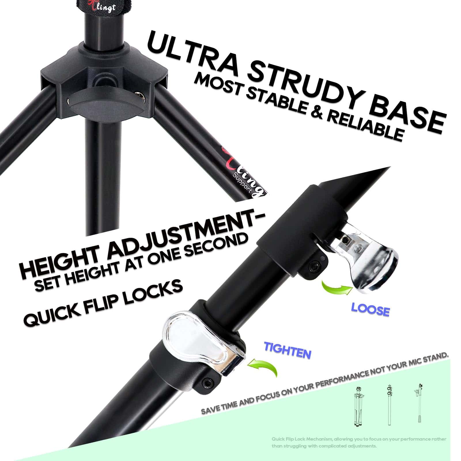 3. BASE ULTRA RESISTENTE La extensión de la base de nuestro Soporte de Micrófono Portátil es más ancha que la de otros soportes de micrófono, lo que proporciona una base excepcionalmente resistente y estable para este soporte de micrófono portátil.