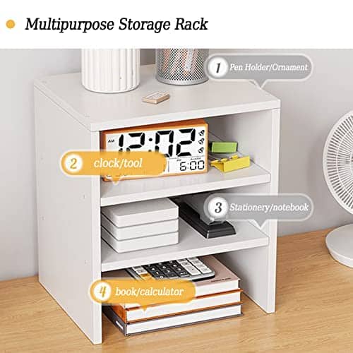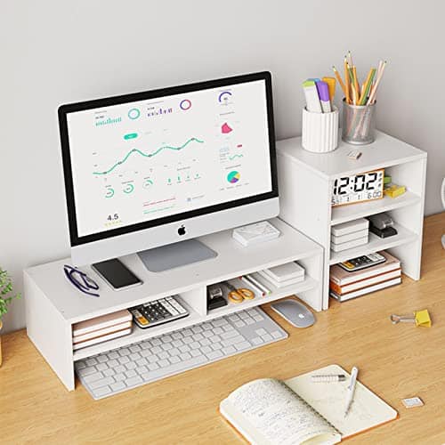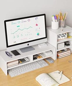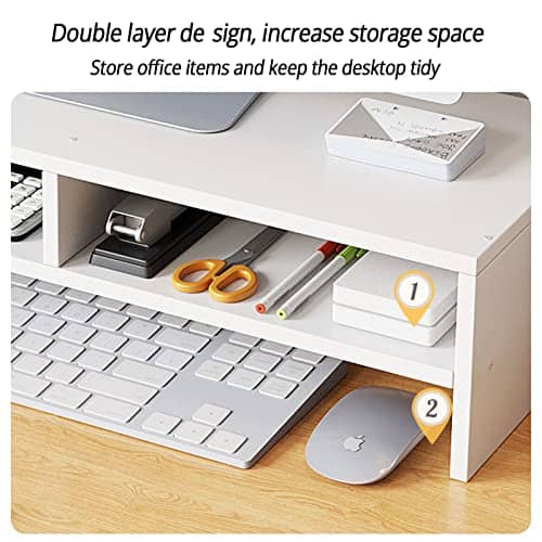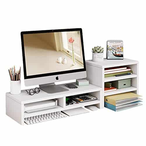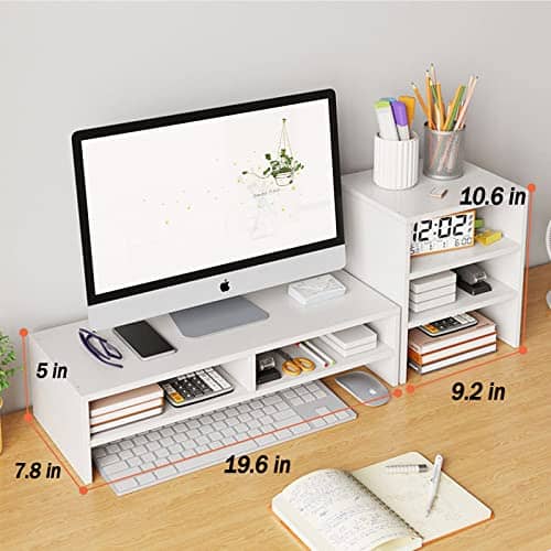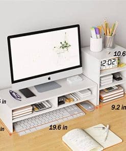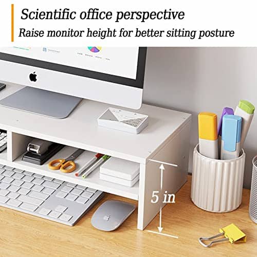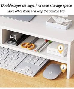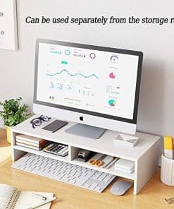 Detalles del producto Tipo de material: madera Forma: rectángulo Color: Blanco Estilo Simple Peso del producto: 6 ib Tamaño del soporte del monitor: 19.6 x 7.8 x 5 pulgadas Tamaño del estante de almacenamiento: 9 x 7.8 x 10.5 pulgadas Al elevar el monitor a la altura adecuada, el soporte de monitor de escritorio ayuda a las personas a mantener una postura correcta al usar la computadora, reduce la presión causada por la presión hacia abajo en la cervical, y está equipado con un estante de almacenamiento para administrar sus pertenencias en secciones para ahorrar más espacio, ahorrar tiempo buscando suministros de oficina y aumentar la eficiencia en el trabajo. También puedes colocar decoraciones e incluso tus plantas favoritas para crear tu propio escritorio artístico y hacer tu vida más cómoda. Si no está satisfecho con nuestros productos o servicios, contáctenos antes de dejar un comentario. Cualquier pregunta que tengas será respondida por correo electrónico en un plazo de 24 horas y se te brindará una resolución satisfactoria.