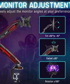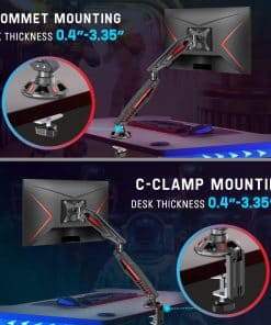 Especificaciones del Producto: 1. Material: aluminio premium, acero y plástico de precisión 2. Altura ajustable: 7.4″ a 19.2″ 3. Inclinación: +90 ~ -45 4. Ángulo de rotación: +90 ~ -90 5. Rotación: +180 ~ -180 Características Principales: Se ve Estilo El aspecto innovador del sentido de línea arrestante en la carcasa, así como el resorte mecánico en color rojo brillante hace que el brazo de monitor para juegos de MOUNTPRO se vea elegante y moderno. Más Duradero en Uso El soporte de monitor está alimentado por un sistema de resorte mecánico, en lugar de un sistema de resorte de gas, que es más duradero. Material Premium La carcasa está principalmente hecha de aluminio premium y plástico de precisión, lo que es liviano pero duradero. Además, la base de pie es de fabricación total en metal para que sea lo suficientemente resistente para garantizar la seguridad y estabilidad que estás experimentando con el soporte de monitor. Gestión de cables integrada El sistema de gestión de cables integrado fácilmente desmontable ayuda a mantener los cables de alimentación fuera de la vista y organizados. Permite que los cables se muevan libremente al cambiar la posición de la pantalla y mantener los cables ordenados organizados. Dos Métodos de Instalación Opción 1 (Abrazadera en C): grosor de escritorio/mesa es de 0.4 a 3.35 pulgadas Opción 2 (Base de Orificio Pasante): grosor de escritorio/mesa es de 3.35 pulgadas o menos Paquete Incluido: 1. Soporte de Monitor de Juego Individual MOUNTPRO x 1 2. Kit de Hardware de Montaje x 1 3. Manual de Usuario x 1