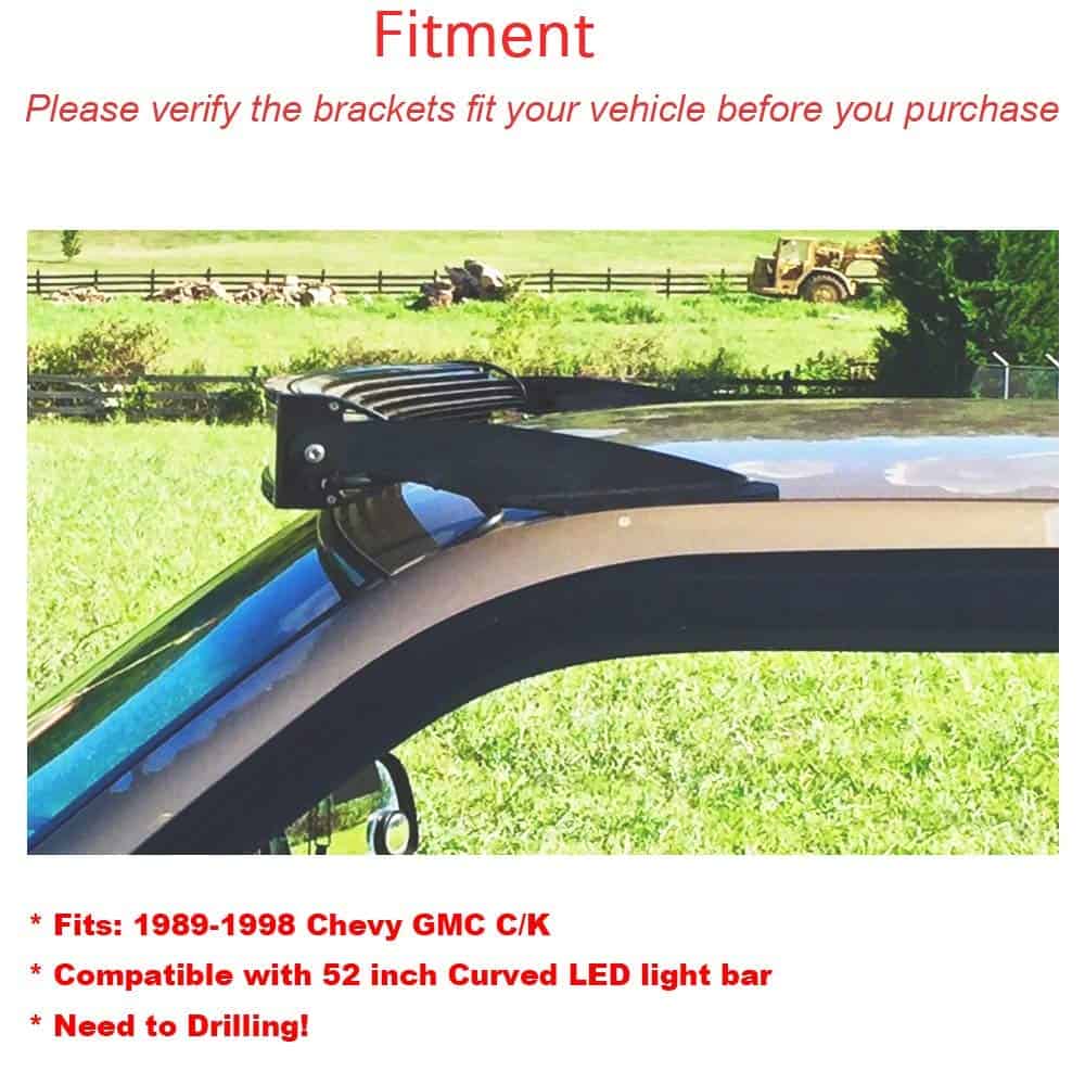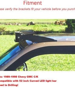 Fitment:n1989-1998 Chevy GMCn1989-1998 C1500/C1500 Suburbann1989-1998 C2500/C2500 Suburbann1989-1998 C3500n1989-1998 K1500/K1500 Suburbann1989-1998 K2500/K2500 Suburbann1989-1998 K3500nnEspecificaciones: nSoportes de acero con recubrimiento en polvo negro.nAcero de corte láser de precisión, resistente al agua y al óxido, resistente al desgaste, larga vida útil.nCompatible con barra de luz LED curva de 52».nSe requiere taladrar para la instalación, y no se incluyen instrucciones. Se recomienda la instalación profesional.nNota: Antes de taladrar, debe colocar sus soportes en la barra de luz y colocarlos en el techo, luego hacer una prueba para asegurarse de que todo encaje correctamente.