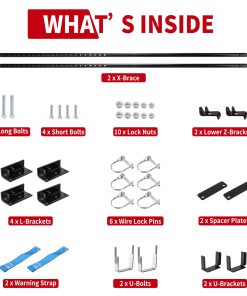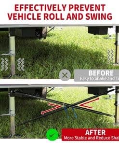 Racewill X-Brace Stabilizer Rear Cross Stand Mounting Bracket es una excelente adición para vehículos recreativos, campistas y remolques de viaje. Su soporte estabilizador en cruz trasero proporciona un soporte adicional a través de una estructura en forma de X que se forma con el suelo, lo que ayuda a reducir el balanceo y la inclinación del vehículo, mejorando la estabilidad y seguridad durante su viaje. El diseño ajustable permite subir o bajar el soporte según las condiciones del terreno, asegurando que el efecto del estabilizador del gato del remolque sea óptimo en cualquier situación. La abrazadera de soporte en cruz en forma de X está fabricada con materiales de primera calidad que garantizan una larga vida útil y resistencia a diferentes terrenos. Además, el estabilizador en X ayuda a reducir el ruido y las vibraciones emitidas por el vehículo, lo que crea un viaje más cómodo y seguro para el conductor y los pasajeros. La instalación del soporte de montaje del estabilizador es sencilla y no requiere herramientas complicadas ni procesos de instalación profesionales, lo que lo hace conveniente para cualquier persona que desee mejorar la estabilidad de su vehículo de forma rápida y eficiente.