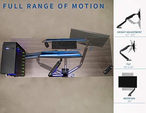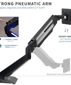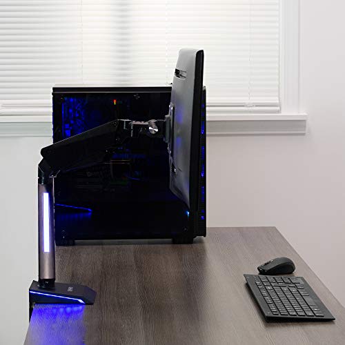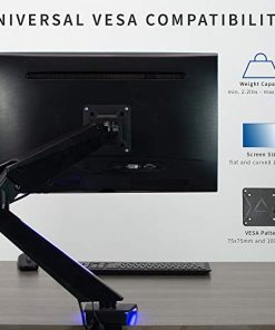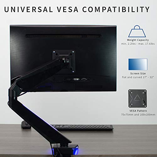 1. Se adapta a pantallas de 17″ a 32″ – Lleva tu configuración al siguiente nivel con este soporte para monitor LED individual que se adapta a la mayoría de las pantallas de 17 a 32 pulgadas y hasta 17.6 lbs de peso. Compatible con VESA 75x75mm y 100x100mm y se sujeta a tu escritorio con una abrazadera en C resistente (hasta 3,5 pulgadas de grosor máximo de escritorio). 2. Luces LED azules para crear ambiente – Agregar luces LED a tu configuración de juego o estación de trabajo crea un color ambiental que hace que tu área sea más vibrante y única. Perfecto para gamers serios que desean combinar estilo y funcionalidad. 3. Ajuste de altura neumático – Eleva tu pantalla a la altura de los ojos y disfruta de ángulos de visión cómodos con inclinación de +90 a -85 grados, giro de 180 grados, rotación de 360 grados y ajuste de altura con un potente brazo neumático. El monitor puede colocarse en orientación vertical u horizontal. 4. Instalación fácil – Montar tu monitor es un proceso sencillo con la placa VESA extraíble. Proporcionamos todo el hardware necesario e instrucciones para un montaje fácil. 5. Estamos aquí para ayudarte – El diseño de acero resistente está respaldado por una garantía del fabricante de 3 años y un soporte técnico amigable para ayudar con cualquier pregunta o inquietud.