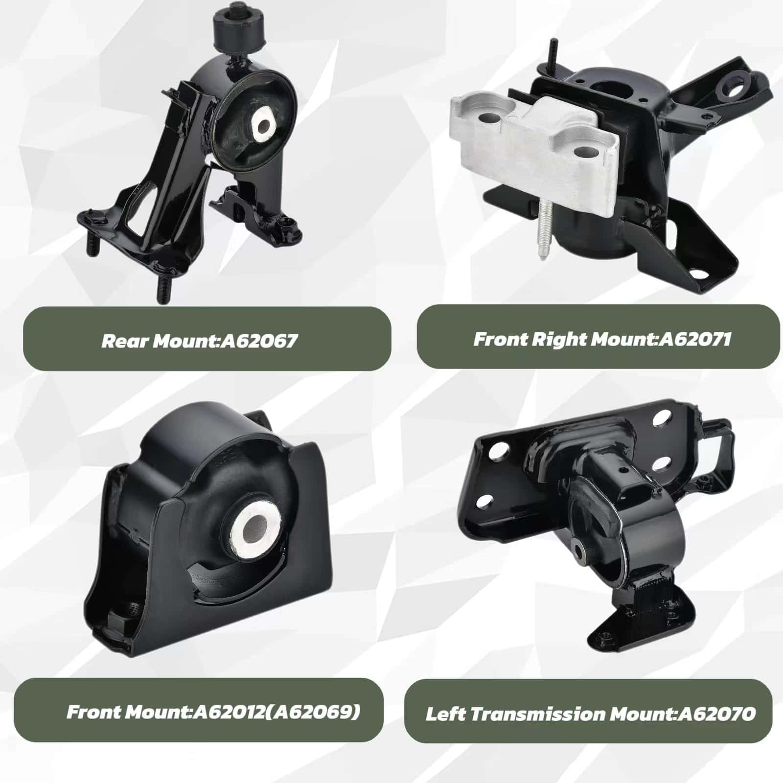 Números de parte de reemplazo: A62012 (A62069) / 9497/12361-28250 – Soporte de motor delantero A62071 / 9669 /12305-28260, 12305-28261 – Soporte de motor delantero derecho A62067 / 9959 /12371-22240 – Soporte de motor trasero A62070 / 9960 /12372-28290, 1237228290 – Soporte de transmisión izquierda
