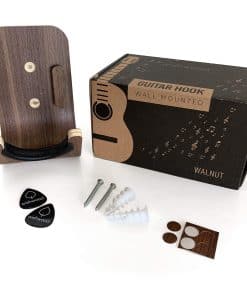 Un colgador de guitarra de diseño moderno bellamente elaborado con almacenamiento integrado de púas y soporte de capo. Una forma creativa y funcional de almacenar y exhibir tus preciosas guitarras o instrumentos musicales. Con materiales de calidad y la seguridad de tus instrumentos como nuestra prioridad, los colgadores de guitarra de pared de madera Wishwood Music están fabricados para resistencia a partir de cinco capas de madera contrachapada doblada, chapa de nogal de madera real y auténtico cuero negro suave 100% natural. Hemos investigado y probado los mejores sistemas de montaje para garantizar completa estabilidad en el montaje en pared e incluimos 2 x tornillos de acero inoxidable de 1.5″ y 2 x anclajes de pared hueca con capacidad de peso de 100 libras con cada gancho para que tengas todo el hardware y accesorios necesarios para todo tipo de paredes, lo que hace que colgar el soporte de guitarra sea fácilmente montado en cuestión de minutos. Instalar el colgador de guitarra en tu pared es rápido y fácil, solo requiere un destornillador o taladro para completar. EL PAQUETE INDIVIDUAL CONTIENE: 1 x Soporte de Madera Contrachapada de Nogal y Cuero Negro con Soportes de Capo; 2 x Tornillos de Fijación y Anclajes de Pared Resistentes; 2 x «stickers» de color nogal; 2 x Púas de Guitarra Wishwood Music 1 x Caja de Regalo Nota: ¡Capos NO incluidos! Nuestros colgadores se pueden utilizar como un estante montado en la pared para cualquier instrumento de cabeza simétrica incluyendo guitarras acústicas, ukulele, bajos, violonchelo, mandolina e incluso ¡skateboards!