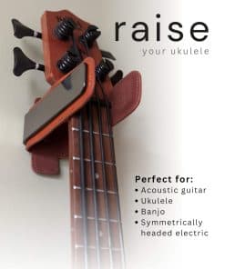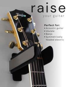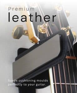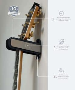 Soporte de pared de guitarra Noisy Clan Levitate – Soporte de pared resistente para guitarra acústica, ukulele, banjo – Construcción premium: marco de acero robusto con acabado cromado negro proporciona durabilidad y estilo para un montaje seguro de guitarra. Este soporte de pared robusto puede manejar las guitarras más pesadas con facilidad. – Se adapta perfectamente a tu guitarra: acolchado de cuero y gamuza premium protegen el acabado de tu instrumento, asegurando un agarre seguro sin rayar o dañar tu guitarra. El material se p… (truncated)