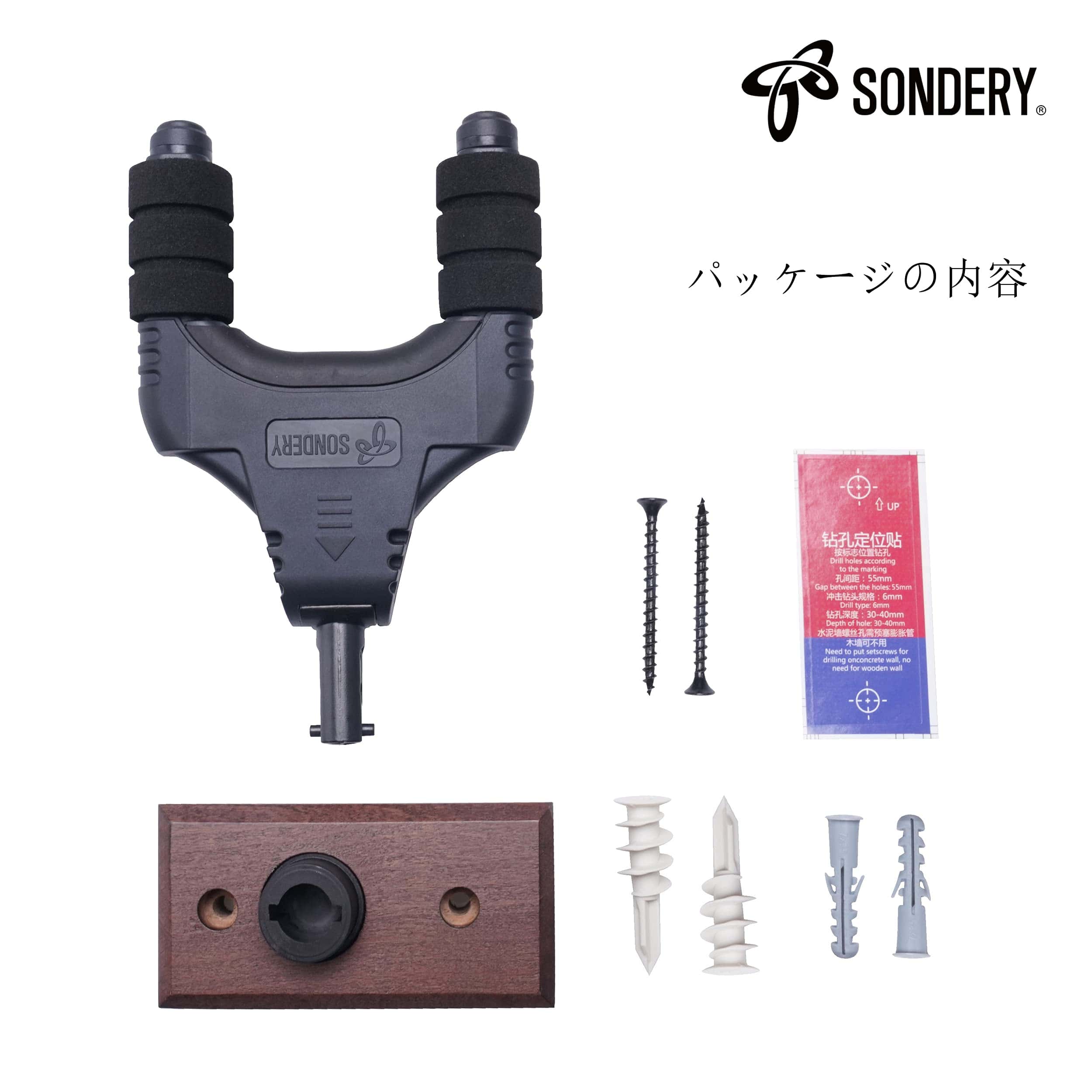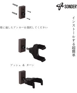 CÓMO MONTAR EN DIFERENTES PAREDES Montaje en pared de madera o montante de madera -1 Utiliza la base de madera del gancho para la posicionamiento, asegúrate de que la base esté colocada verticalmente. -2 Atornilla los tornillos negros largos a través de agujeros guía en la pared de madera o montante de madera directamente usando un destornillador. -3 Empuja el cuerpo del gancho en la base y gíralo (con el logo hacia arriba) a la posición final de instalación. Montaje en pared de yeso -1 Coloca la pegatina de posición en la pared de yeso, asegúrate de que la pegatina esté colocada verticalmente. -2 Gira los tornillos en sentido horario en la pared de yeso en las marcas de posición y luego desenrosca los tornillos en sentido antihorario para hacer 2 agujeros. -3 Gira en sentido horario los anclajes de pared de yeso en los agujeros hasta el final. Coloca la base de madera y atornilla los tornillos negros largos en los anclajes de pared de yeso a través de los agujeros guía en la base. -4 Empuja el cuerpo del gancho en la base y gíralo (con el lógro hacia arriba) a la posición final de instalación. Montaje en pared de ladrillo – Coloca la pegatina de posición en la pared de ladrillo, asegúrate de que la pegatina esté colocada verticalmente. -1 Utiliza un taladro eléctrico para hacer 2 agujeros en las marcas de posición, presta atención a que la broca sea de las mismas especificaciones descritas en la pegatina de posición. -2 Utiliza un martillo para insertar los anclajes de pared de ladrillo en los 2 agujeros. -3 Coloca la base de madera y atornilla los tornillos negros largos en los anclajes de pared de ladrillo a través de los agujeros guía en la base. -4 Empuja el cuerpo del gancho en la base y gíralo (con el logo hacia arriba) a la posición final de instalación.